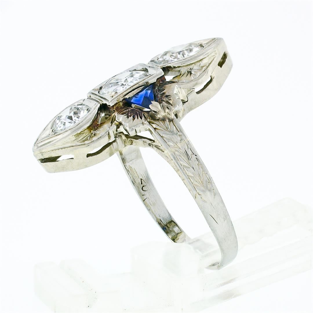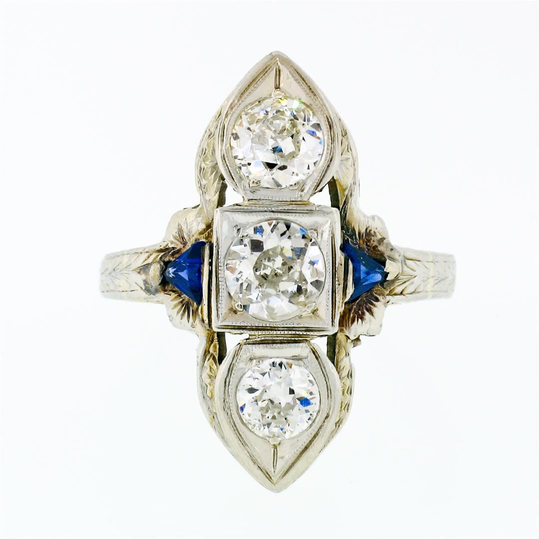 An antique art deco solid 20k white gold dinner ring, with 3 old european cut natural diamonds (G/H- VS2/SI1 ; 1.54ctw), and 2 triangular step cut synthetic sapphires.The ring is size 8, weighs a total of 4.82 grams, and measures 23.8mm wide.