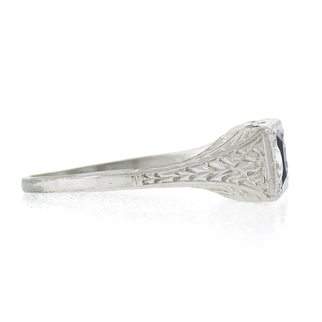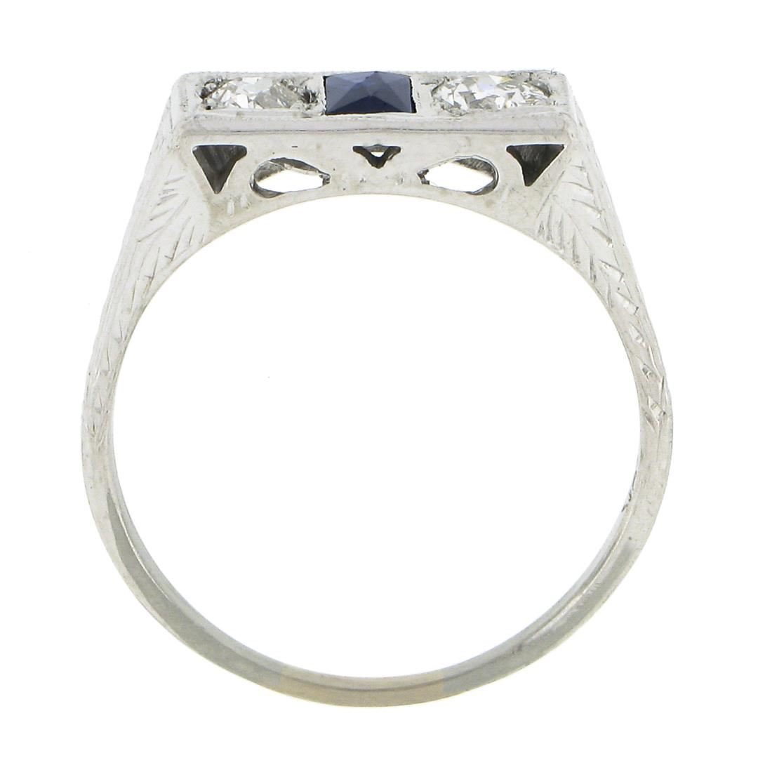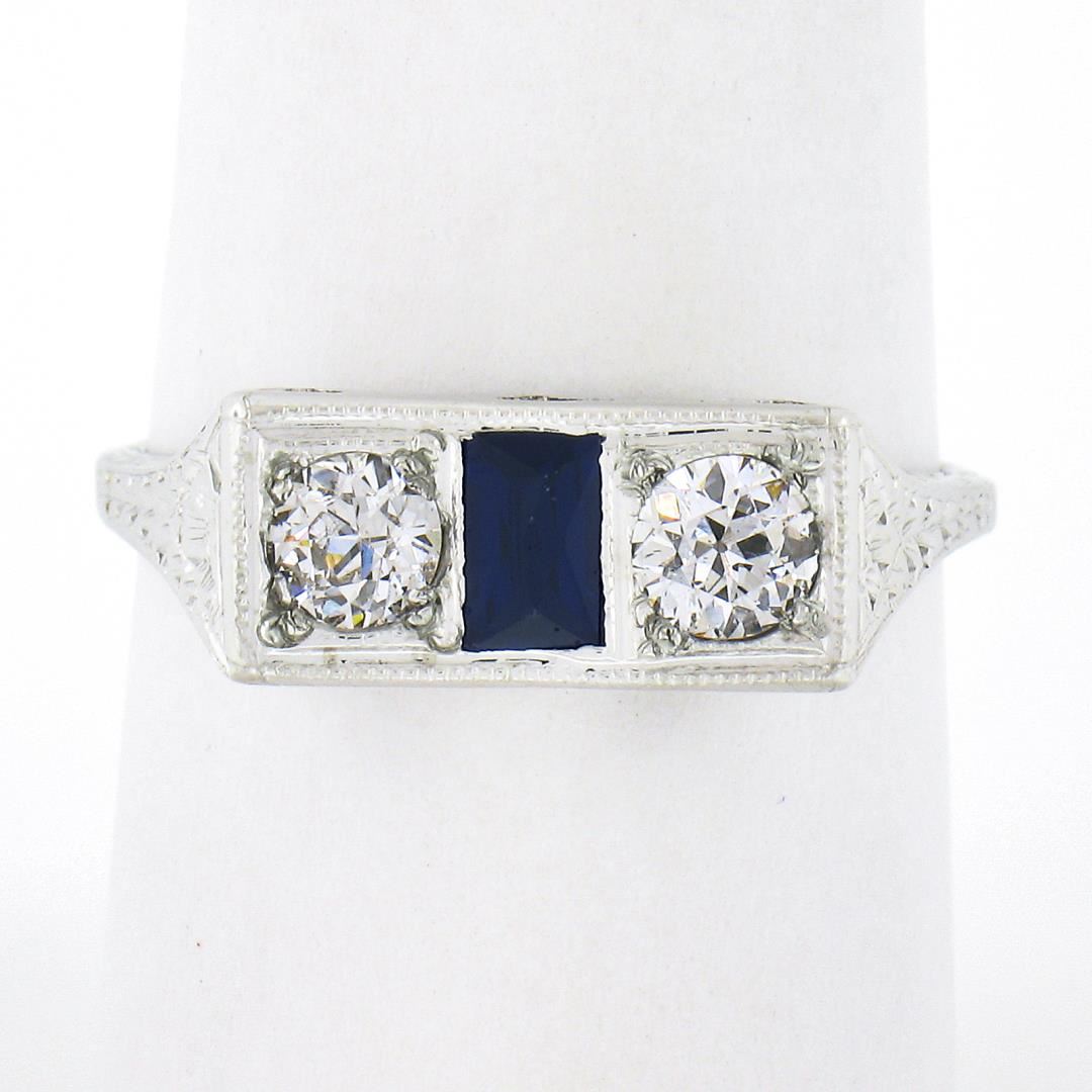 An antique solid 20k white gold ring, with 1 french baguette cut synthetic sapphire (4.5x3mm), and 2 old european cut natural diamonds (H/I - SI1/SI2 ; 0.45ctw).The ring is size 7.5, weighs a total of 3.64 grams, and measures 6.3mm wide.