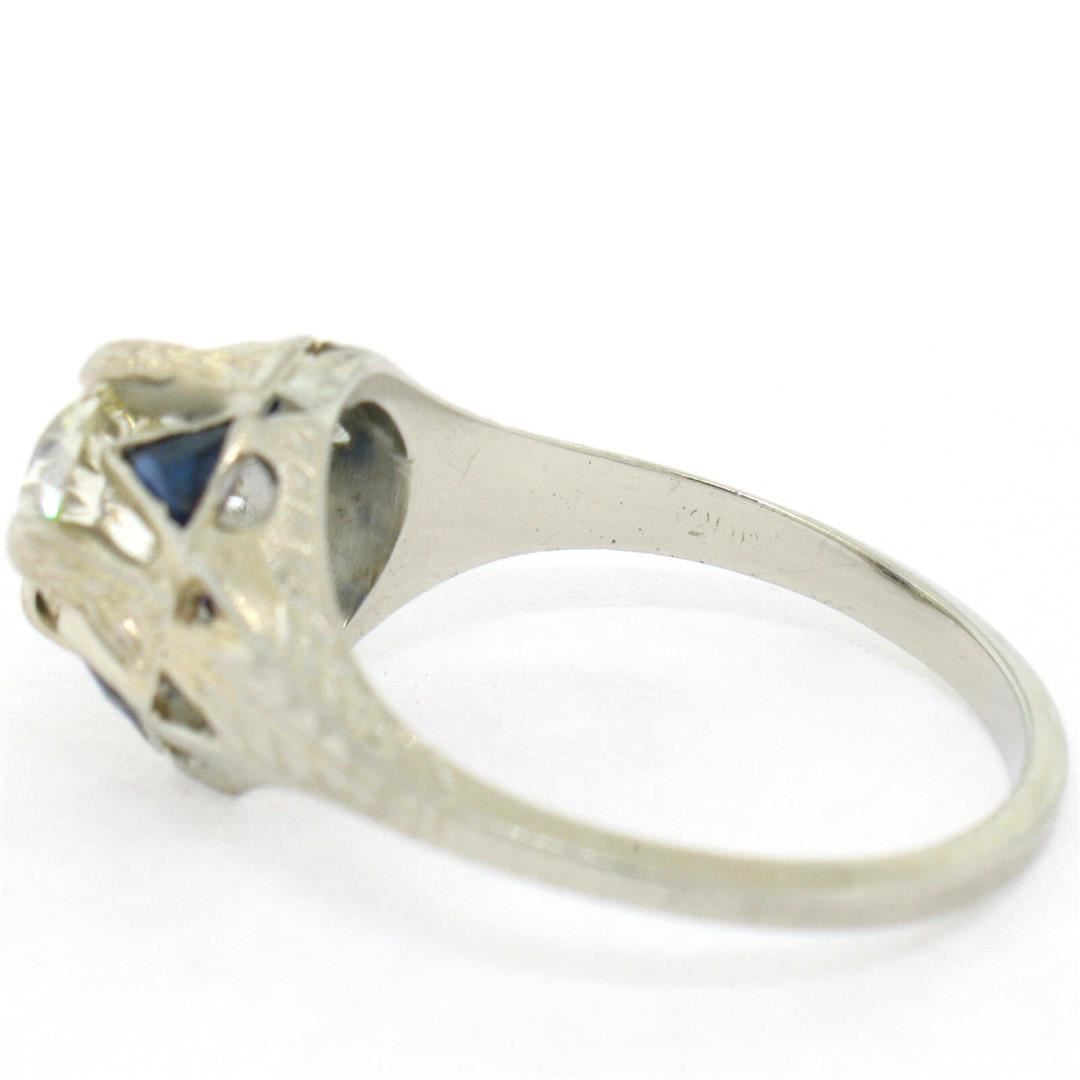An excellent condition antique 20k white gold ring with a 0.95ct old European diamond (J - VS1) and accented with four triangular synthetic sapphires. The ring is a size 7, weighs a total of 4.05 grams, and is 10.45mm wide.