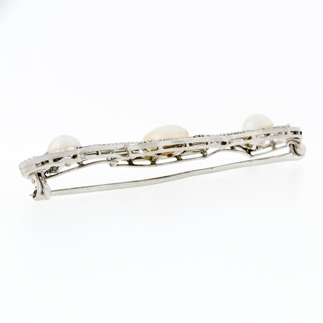 An antique art deco solid platinum bar pin brooch, with 1 round shape natural pearl (8.51x8.52mm), and 2 Gia certified button natural pearls (A) 5.83 x 3.77 mm - B) 6.29 x 4.16 mm), with 14 old european cut natural diamonds (F/G - VS1/VS2 ; 0.38ctw). Measures 12.52x61.22mm and weighs a total of 9.17 grams. Comes with all original relevant certifications.