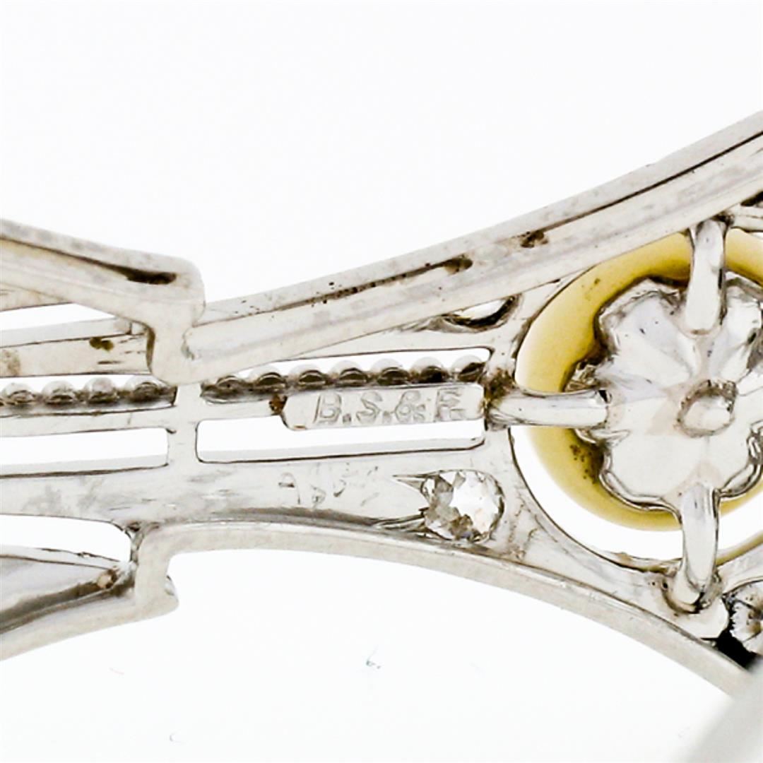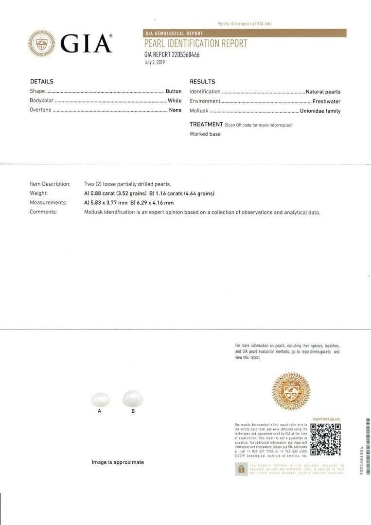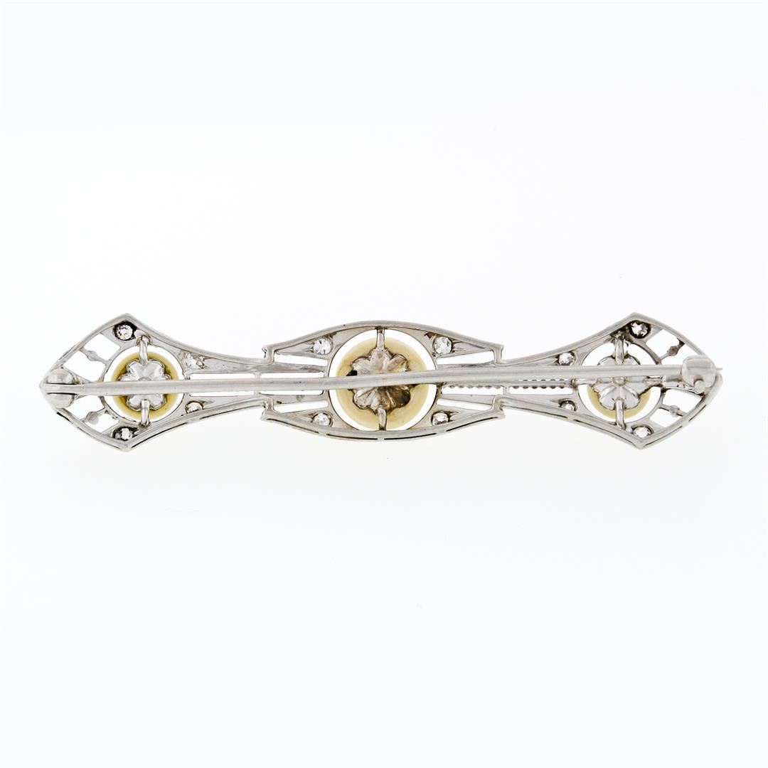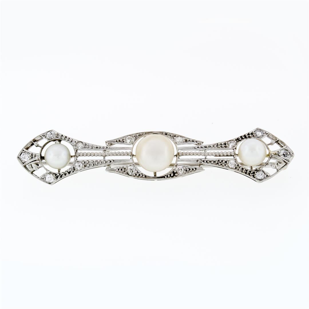 An antique art deco solid platinum bar pin brooch, with 1 round shape natural pearl (8.51x8.52mm), and 2 Gia certified button natural pearls (A) 5.83 x 3.77 mm - B) 6.29 x 4.16 mm), with 14 old european cut natural diamonds (F/G - VS1/VS2 ; 0.38ctw). Measures 12.52x61.22mm and weighs a total of 9.17 grams. Comes with all original relevant certifications.