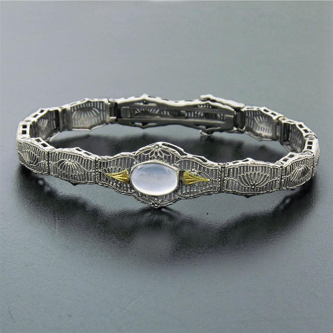An antique art deco belly bracelet, with 1 oval cabochon cut natural moonstone (8.70x6.15mm). It weighs a total of 9.24 grams, measures 12.65mm wide, and measures 6.0 inches in length.
