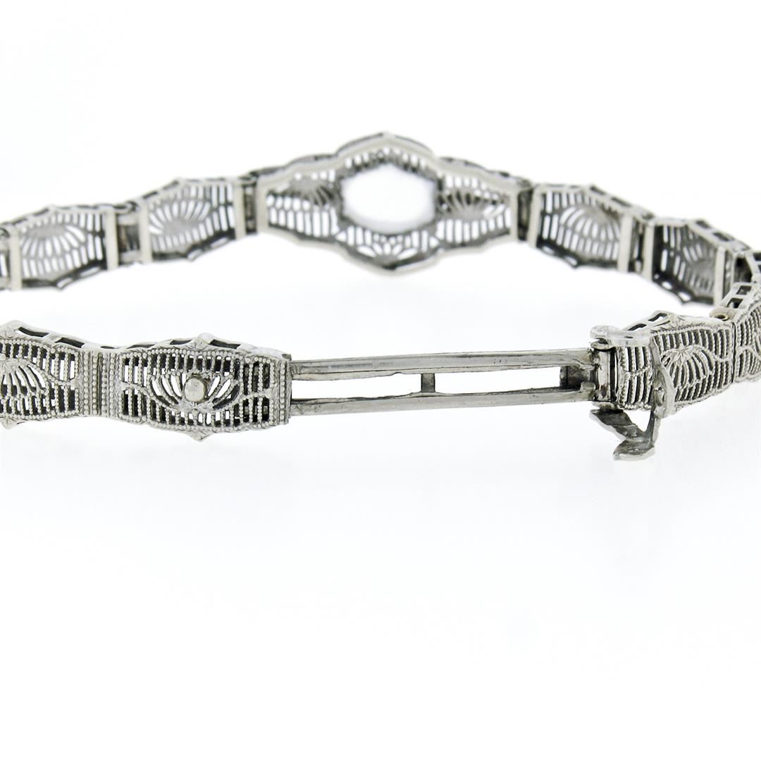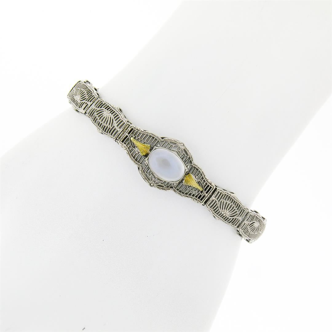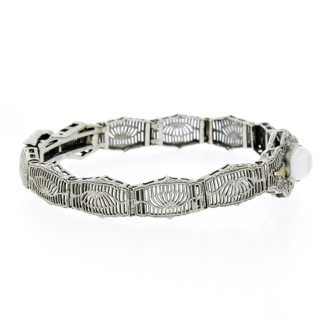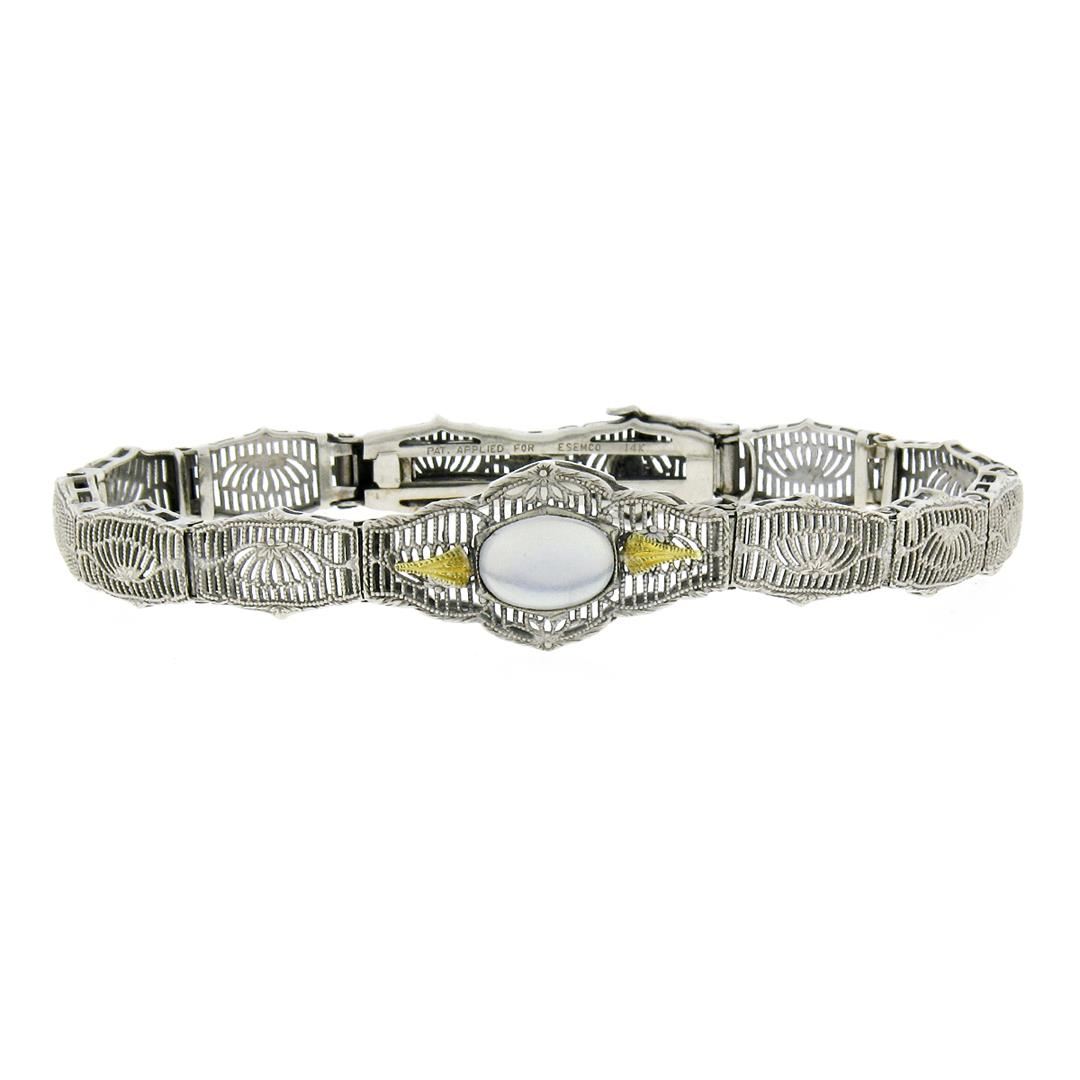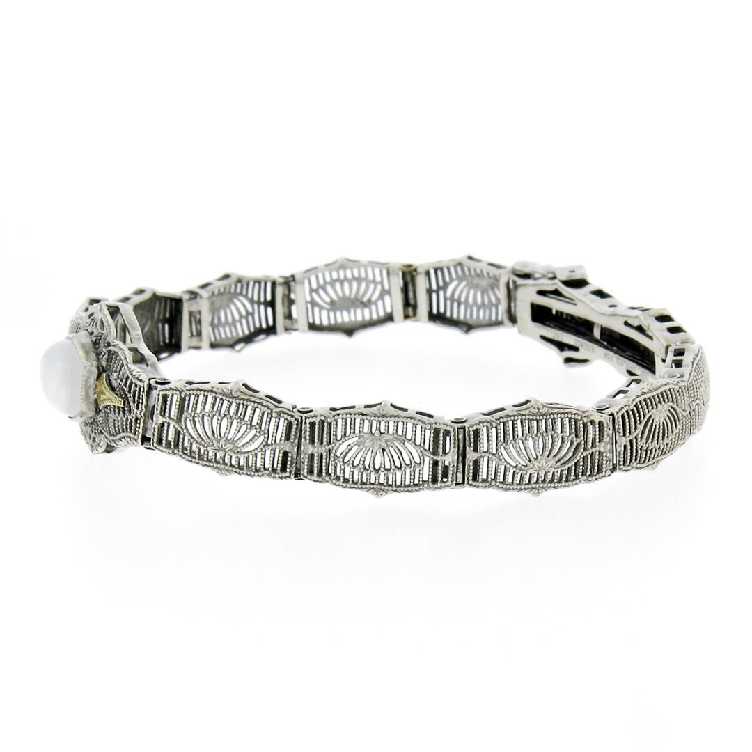 An antique art deco belly bracelet, with 1 oval cabochon cut natural moonstone (8.70x6.15mm). It weighs a total of 9.24 grams, measures 12.65mm wide, and measures 6.0 inches in length.