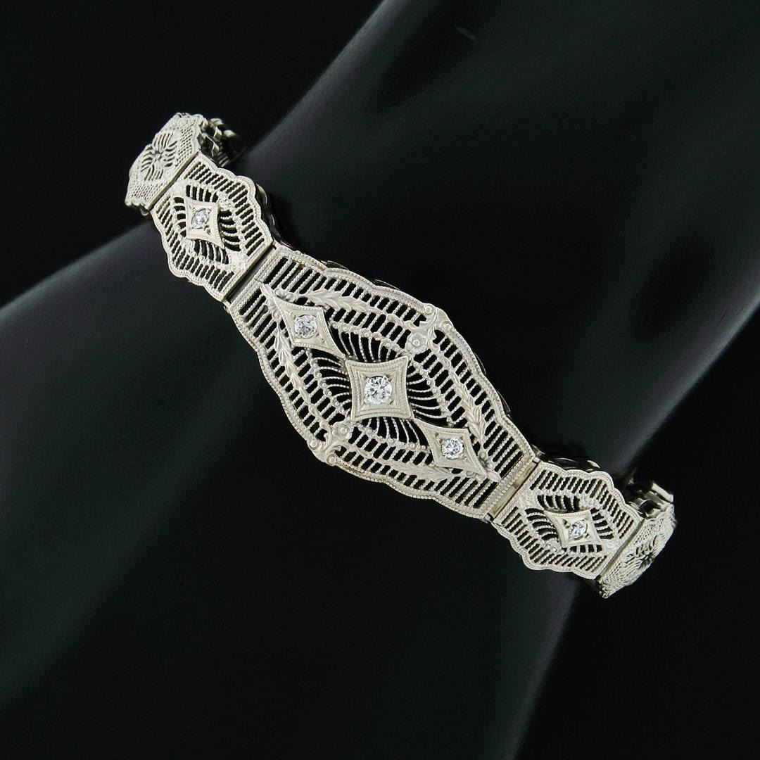Antique Art Deco Esemco 14k White Gold Diamond Milgrain Filigree Buckle Bracelet