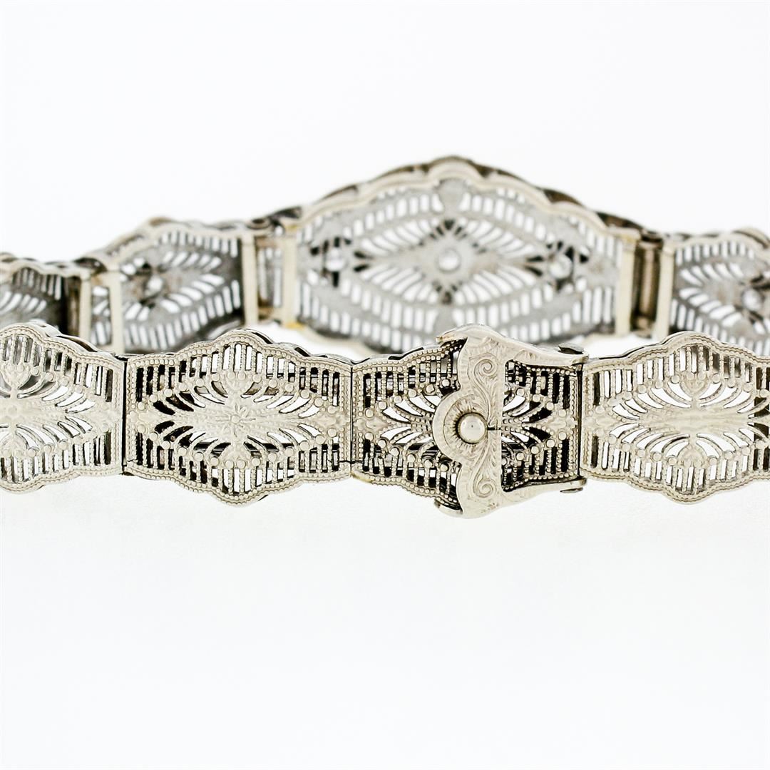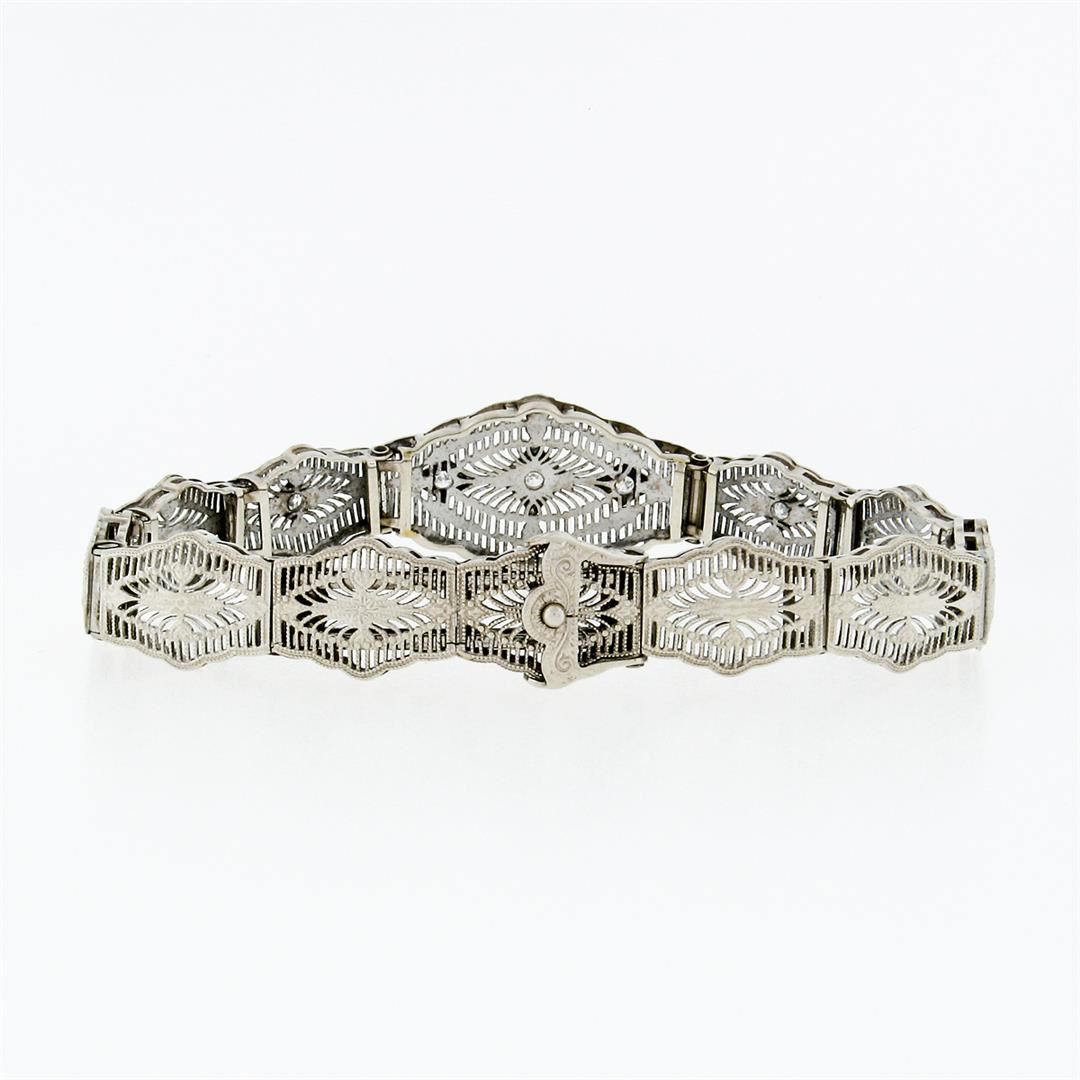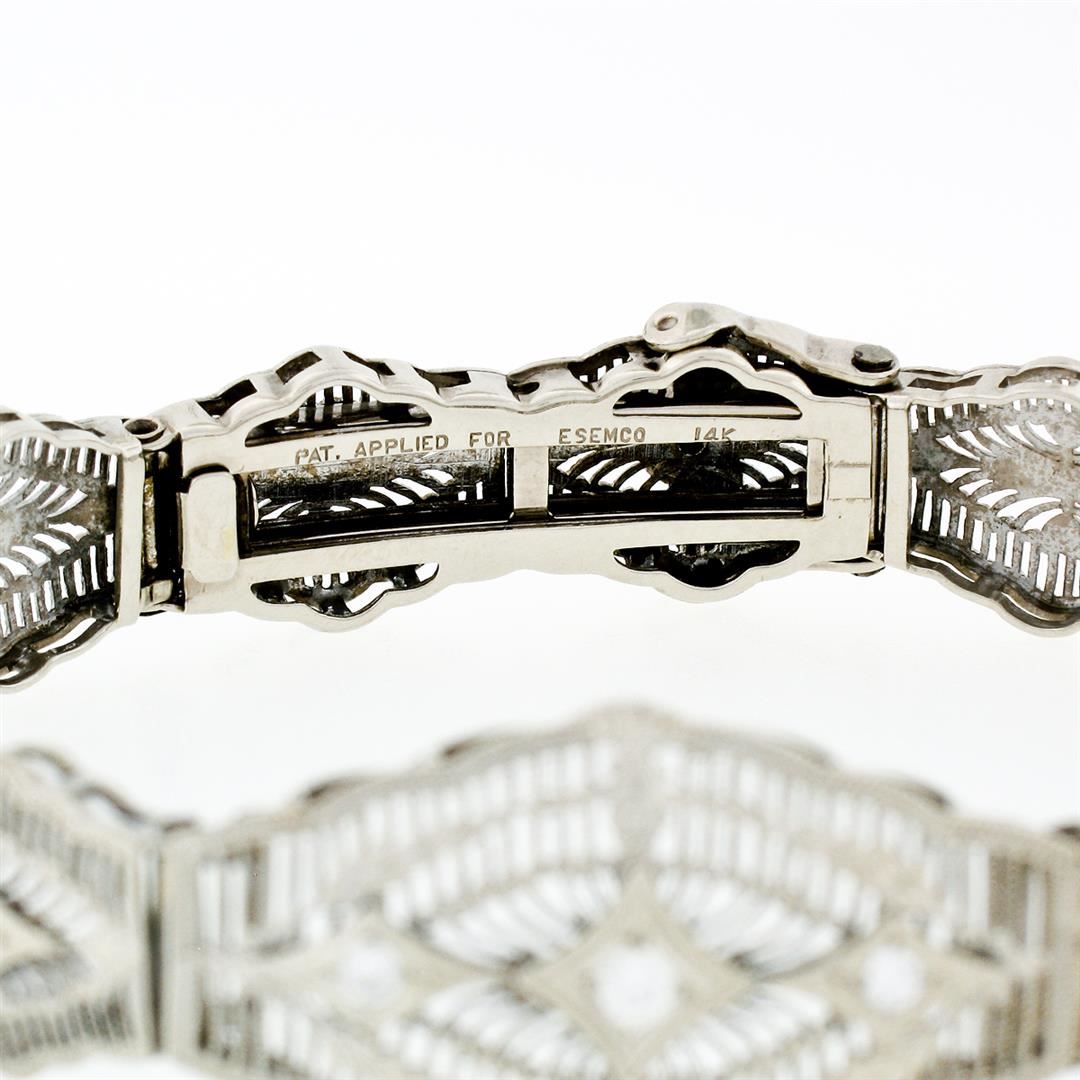 An antique art deco solid 14k white gold buckle bracelet by Esemco, featuring 5 old transitional cut natural diamonds (G/H - VS2 ; 0.12ctw). It weighs a total of 13.48 grams, measures 16.55mm wide, and measures 6.5 inches in length.