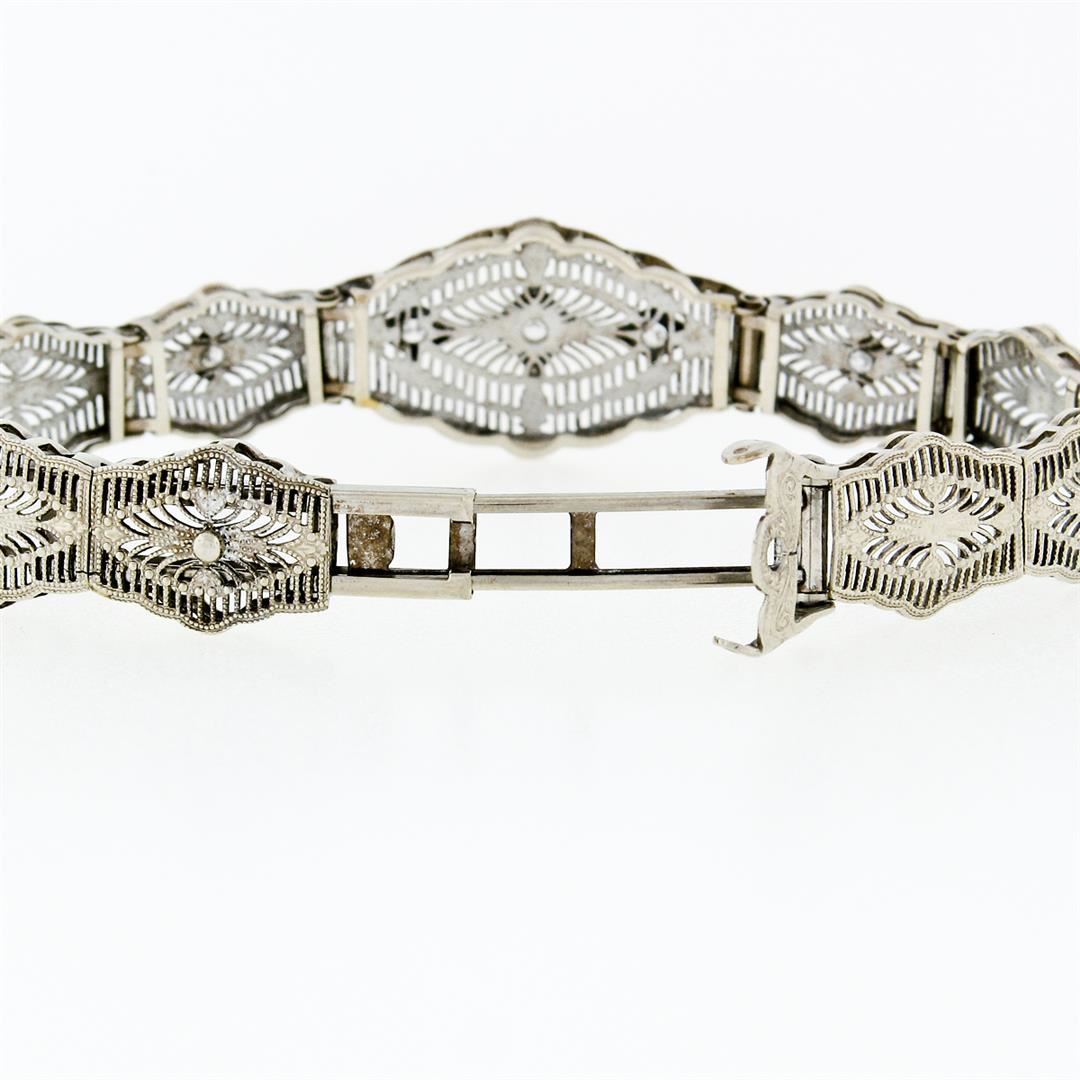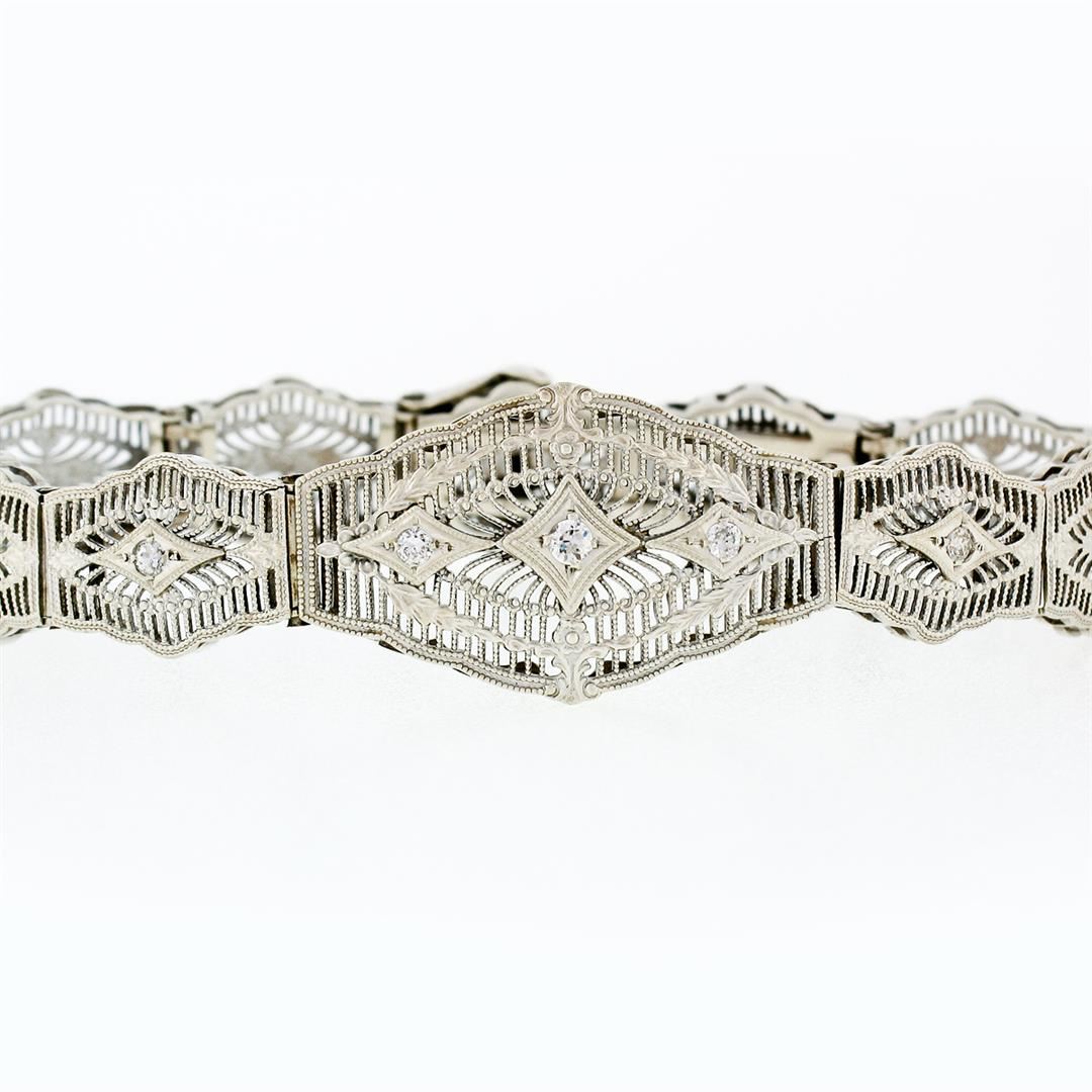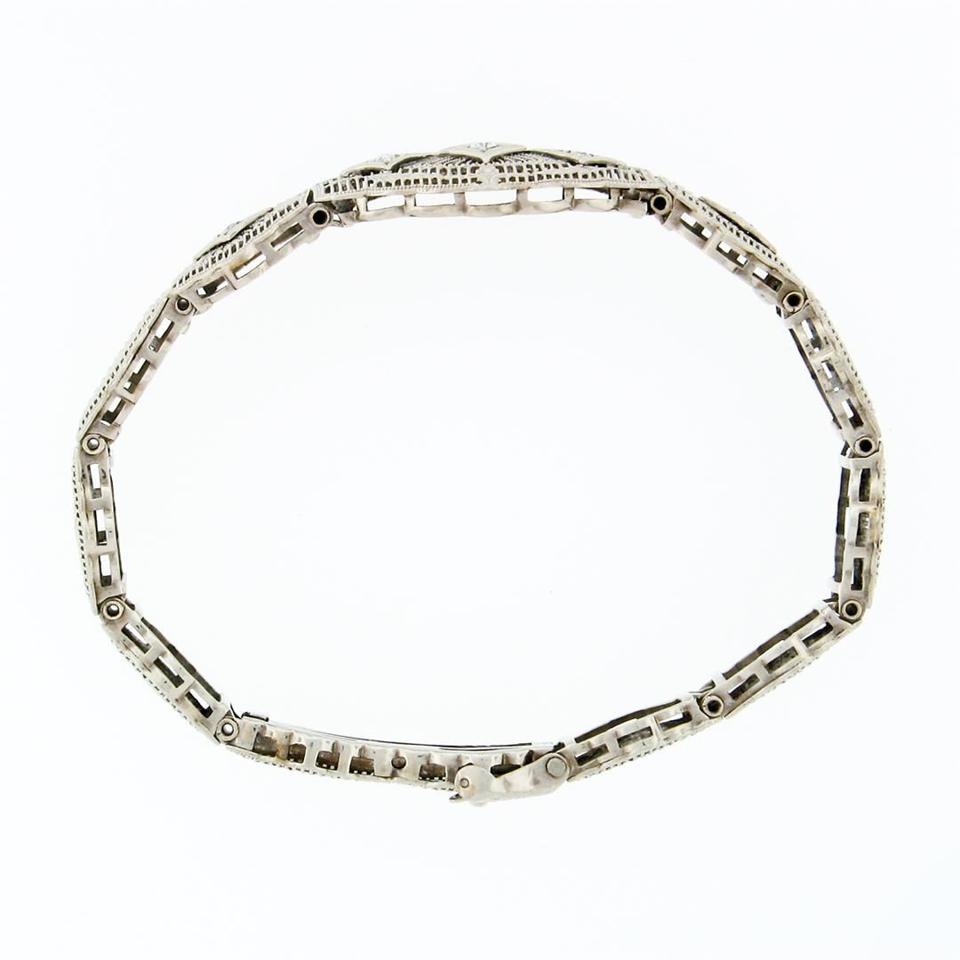 An antique art deco solid 14k white gold buckle bracelet by Esemco, featuring 5 old transitional cut natural diamonds (G/H - VS2 ; 0.12ctw). It weighs a total of 13.48 grams, measures 16.55mm wide, and measures 6.5 inches in length.
