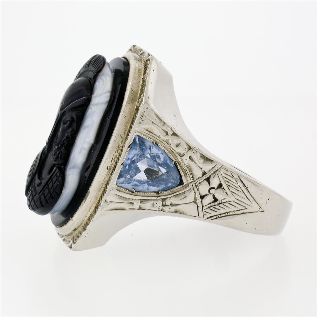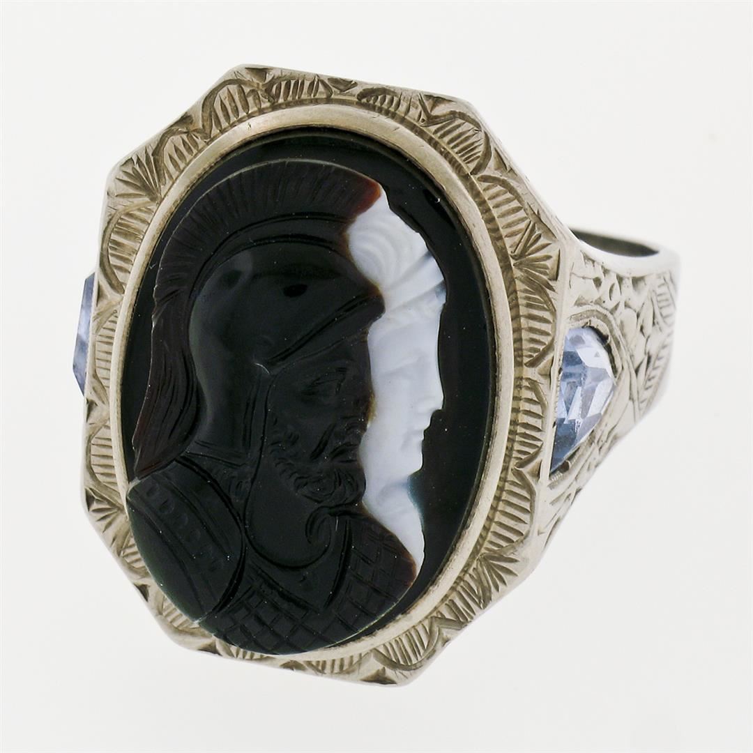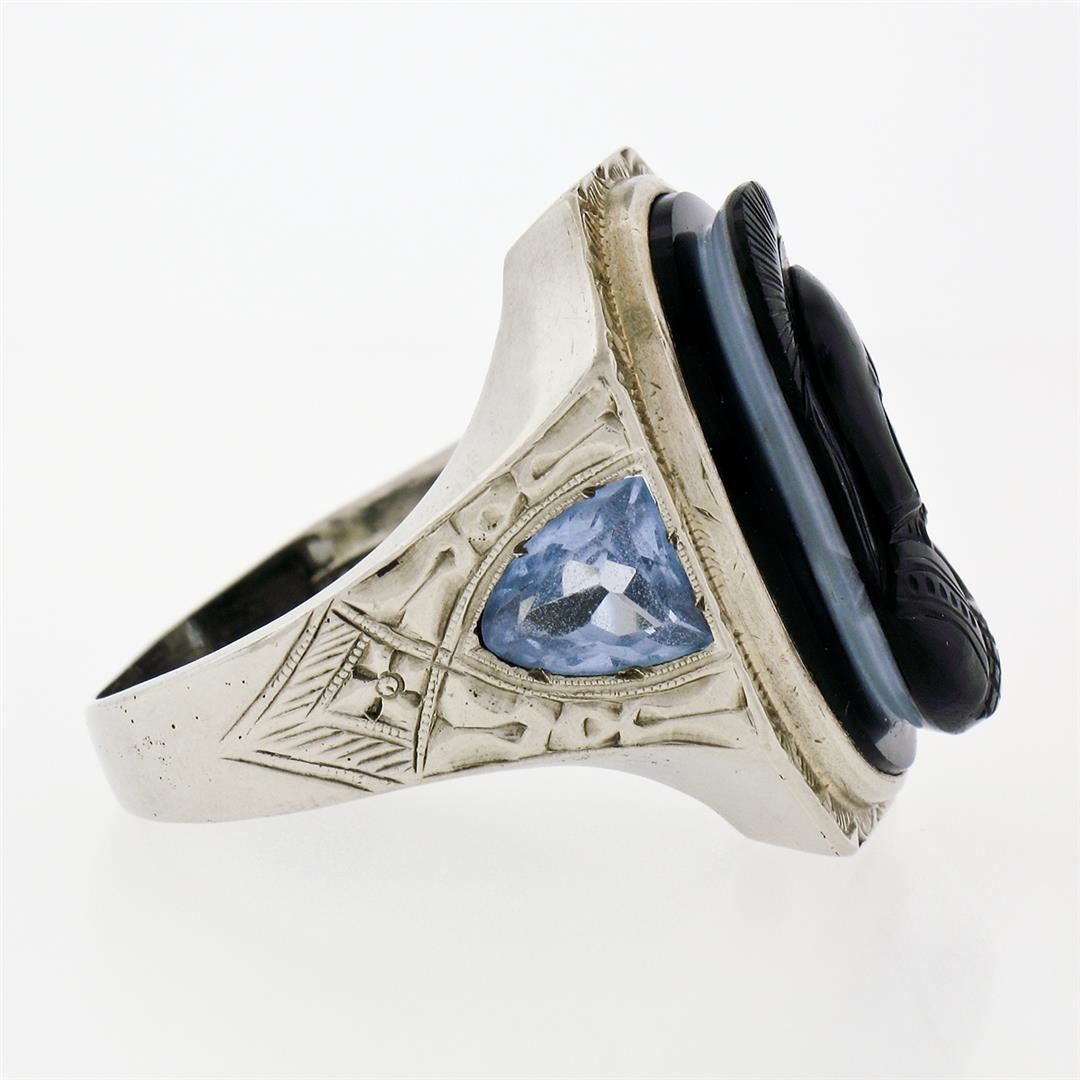 Antique Art Deco Men's 10k Gold Agate Double Cameo & Shield Cut Aquamarine Ring. Please see photos and description for all available information. An antique art deco solid 10 white gold ring, featuring 1 oval cut natural carved agate (12.19x20.52mm), and 1 oval disk natural onyx (16.46x22.94mm), accented with 2 shield cut natural aqaumarine (3.20ctw). The ring is size 12.0, weighs a total of 12.84 grams, and measures 25.08mm wide.