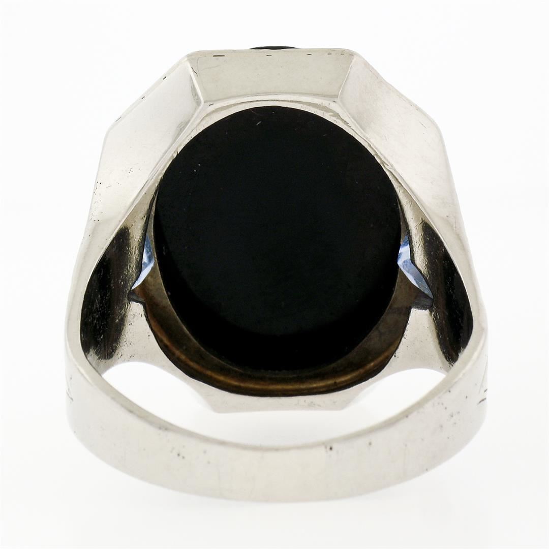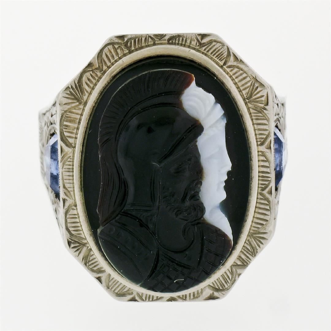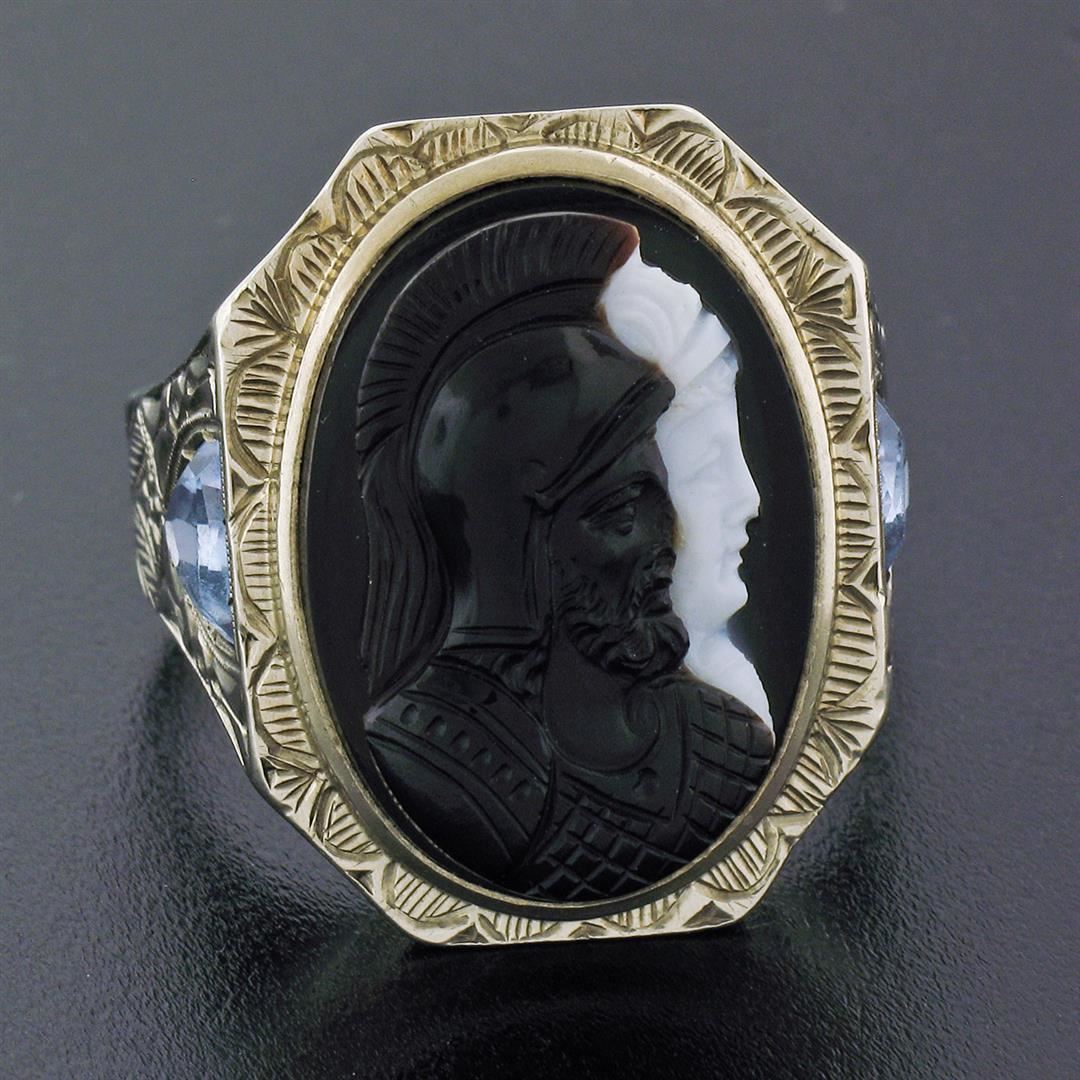 Antique Art Deco Men's 10k Gold Agate Double Cameo & Shield Cut Aquamarine Ring. Please see photos and description for all available information. An antique art deco solid 10 white gold ring, featuring 1 oval cut natural carved agate (12.19x20.52mm), and 1 oval disk natural onyx (16.46x22.94mm), accented with 2 shield cut natural aqaumarine (3.20ctw). The ring is size 12.0, weighs a total of 12.84 grams, and measures 25.08mm wide.