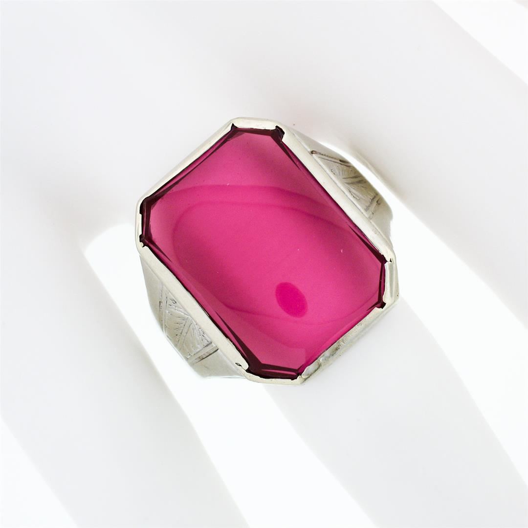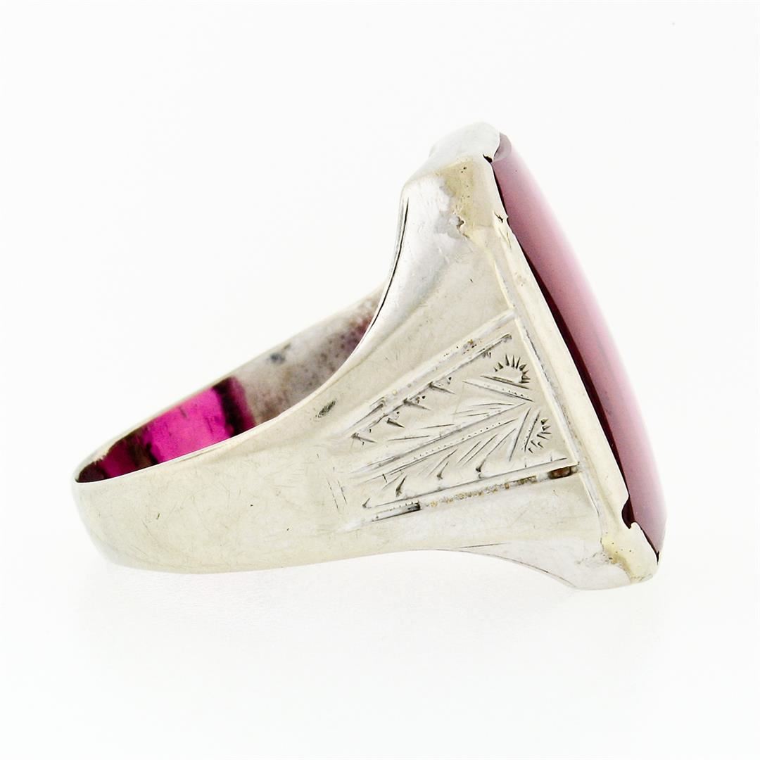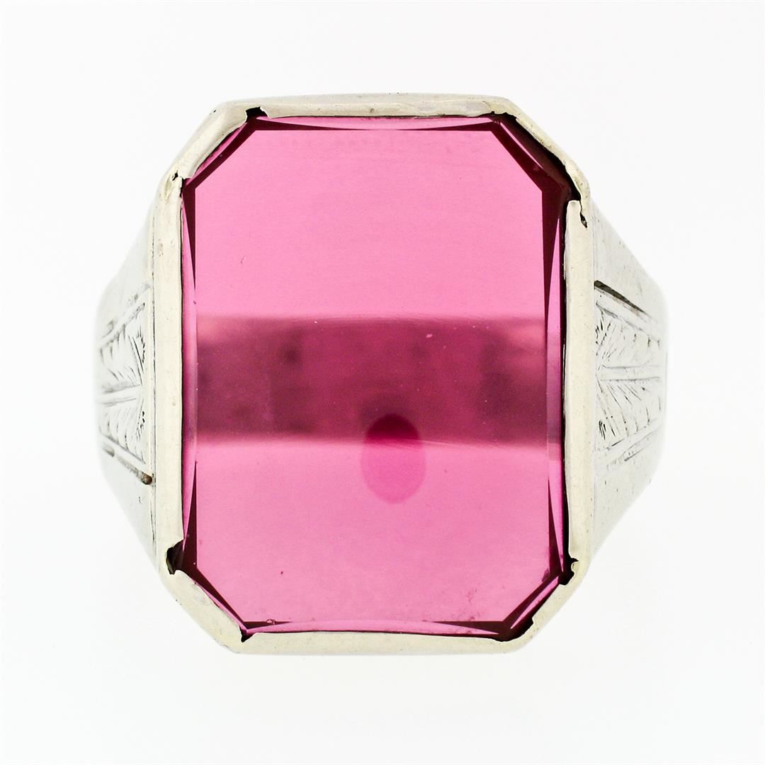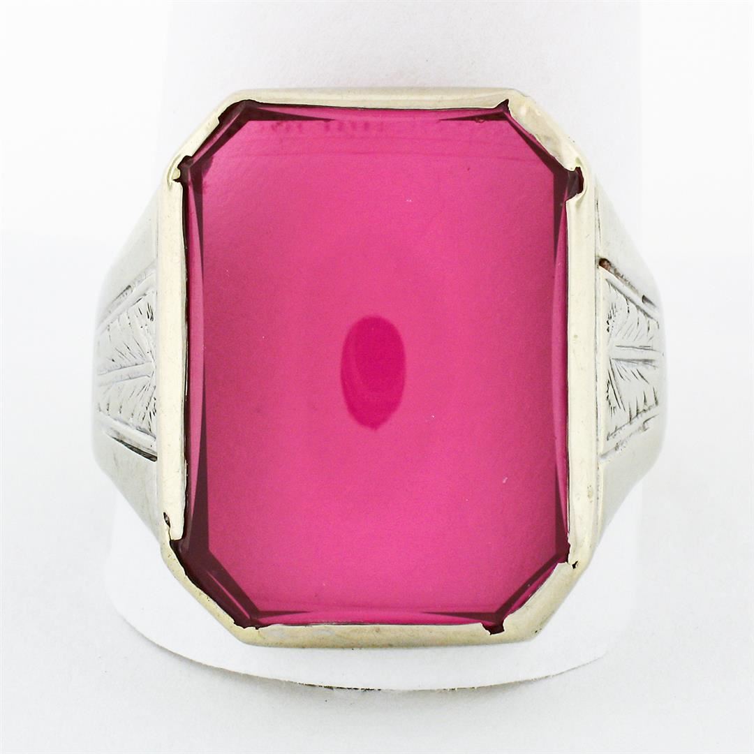 An antique art deco solid 14k white gold mens ring, with 1 rectangular cut synthetic red stone (19.6x14.9mm). The ring is size 11.5, weighs a total of 9.23 grams, and measures 21.04mm wide.