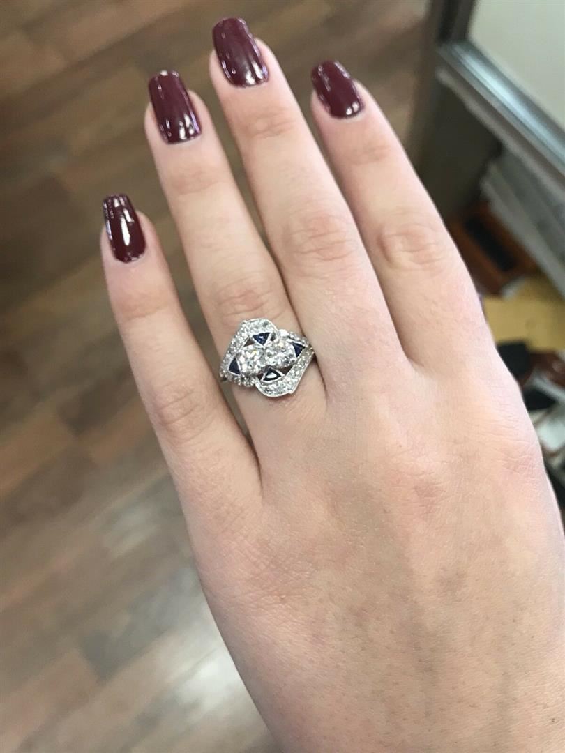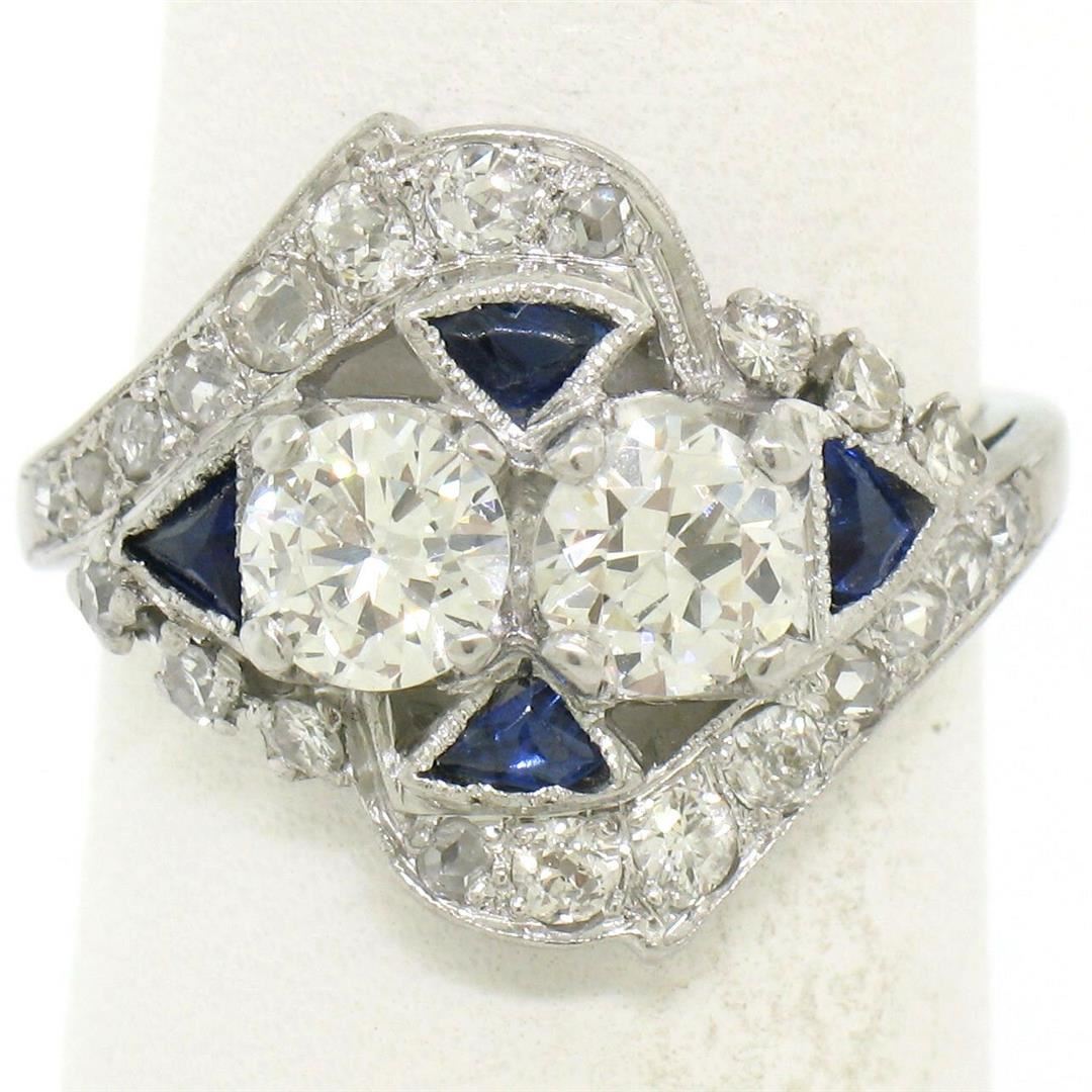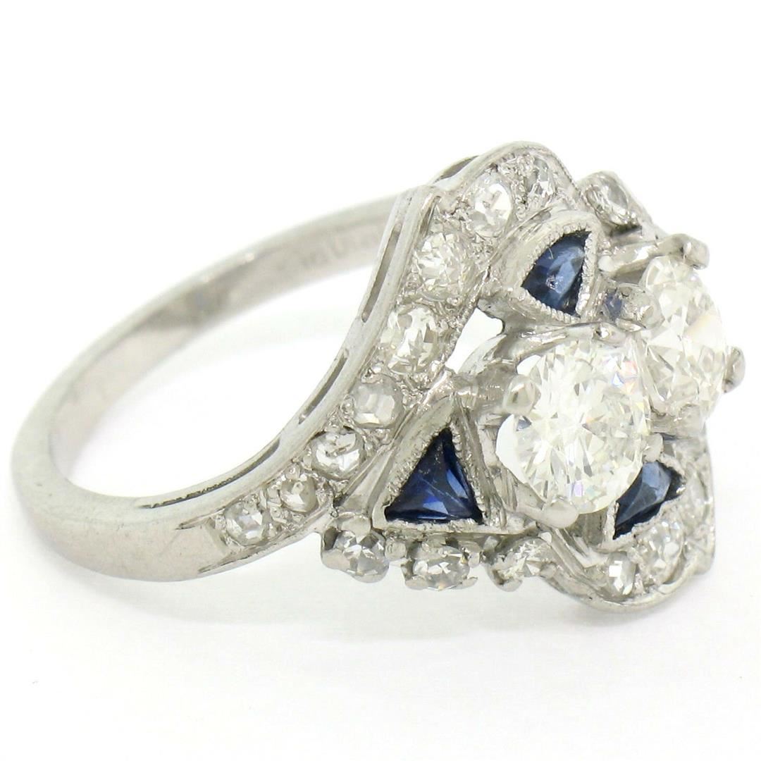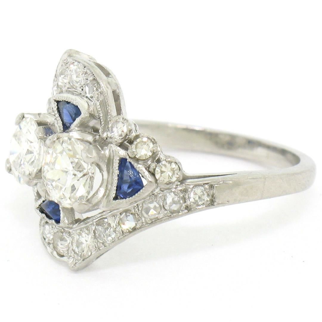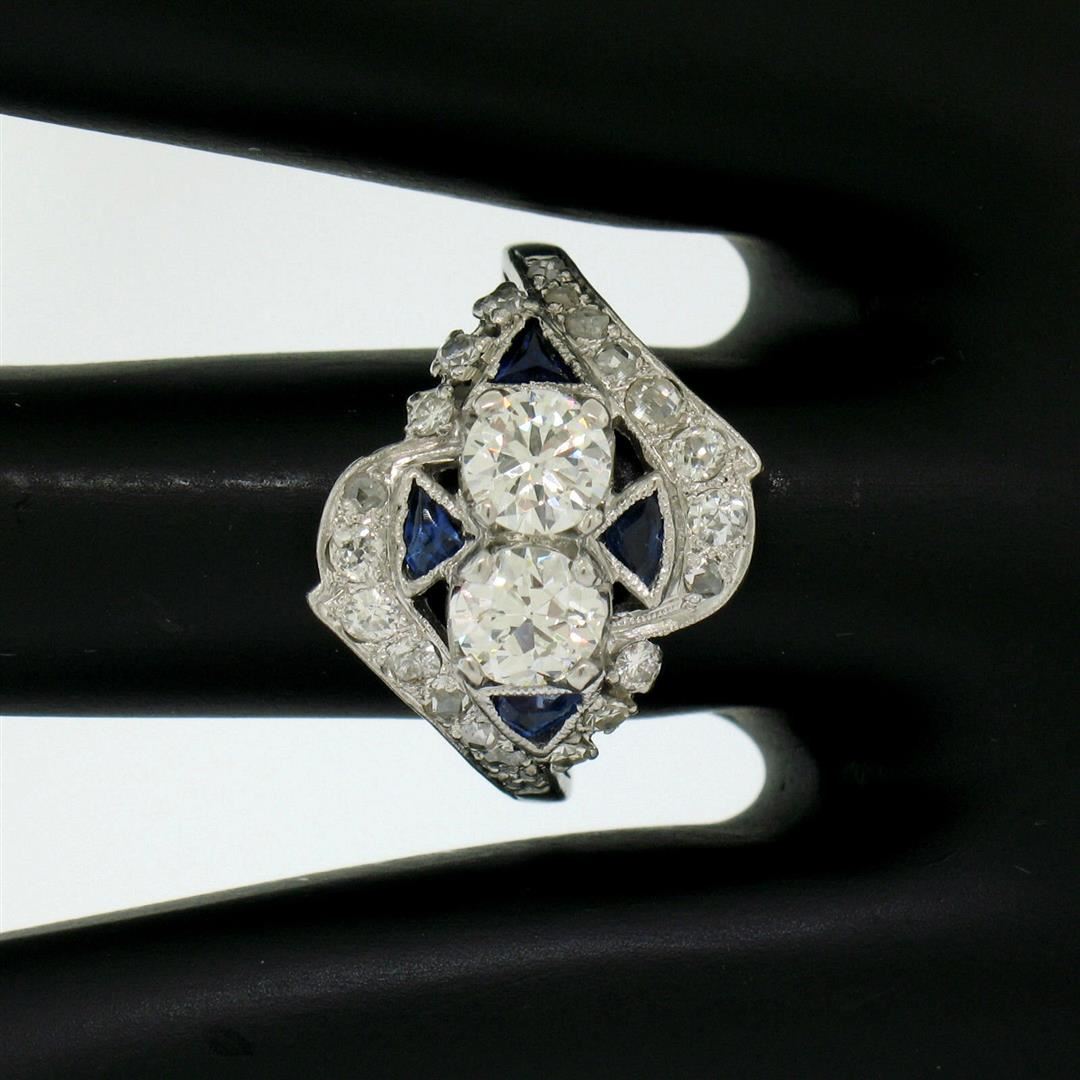 One Antique Art Deco Milgrain Platinum 1.69ctw Old European, Rose, and Single Cut Diamond Cocktail Ring. Item Details: Material: Solid .900 Platinum, Weight: 6.28 Grams, Stone(s): (1) Natural Genuine Diamond - Old European Cut - Prong Set - G/H Color - VS1/VS2 Clarity - 0.53ct (approx.), (1) Natural Genuine Diamond - Old European Cut - Prong Set - G/H Color - VS1/VS2 Clarity - 0.56ct (approx.), (22) Natural Genuine Diamond - Round Rose and Single Cut - Prong and Pavé Set - G/H Color - VS2/SI1 Clarity - 0.60ctw (approx.), (4) Synthetic Sapphires - Triangular French Cut - Bezel Set - Rich Royal Blue Color, Total Carat Weight: 1.69 (approx.), Ring Size: 6.5 Ring Width: 15.29mm Ring Height: 5.20mm rise off the finger Condition: Antique art deco period ring. Excellent, ready to wear condition!