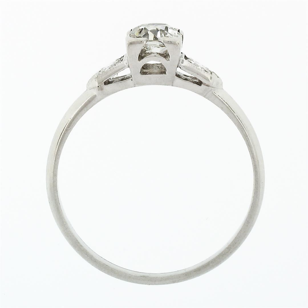 An art deco period solid platinum engagement ring, with 1 old European cut natural diamond (G - VS1; 0.40ct), and 2 old transitional cut natural diamonds (G/H - VS1/VS2; 0.06ctw). The ring is size 6.5, weighs a total of 2.66 grams, and measures 5.1mm wide.