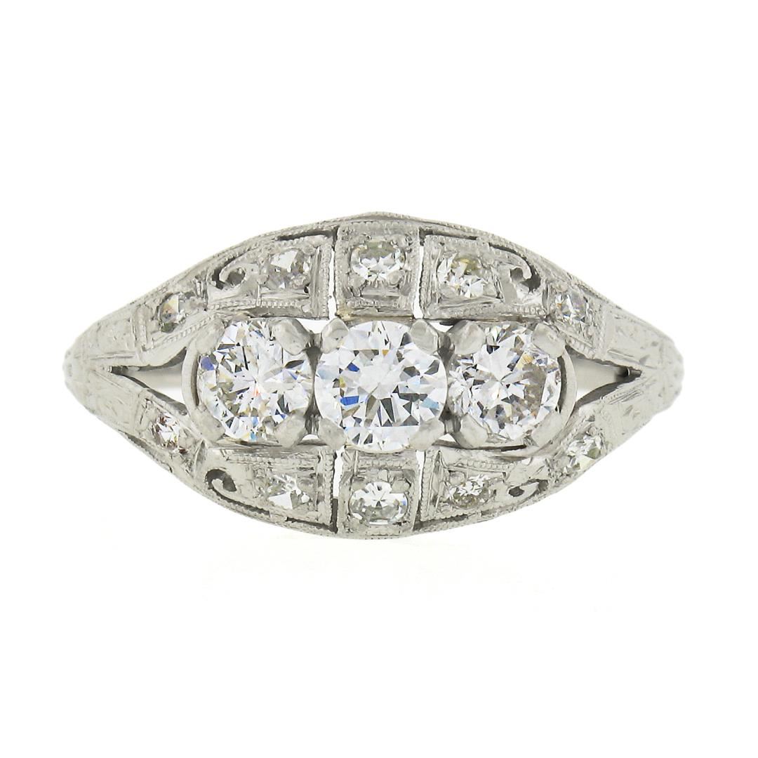 An antique solid platinum ring, with 13 old cut natural diamonds (G-H - VS2-SI2 ; 0.81ctw). The ring is size 6.5, weighs a total of 4.29 grams, and measures 10.5mm wide.
