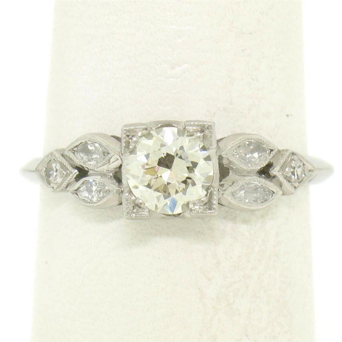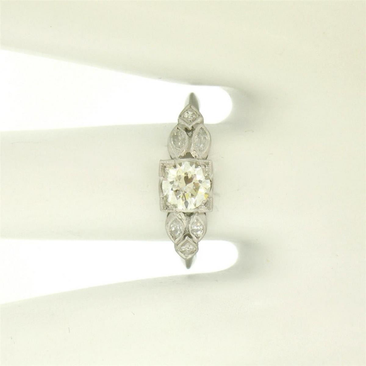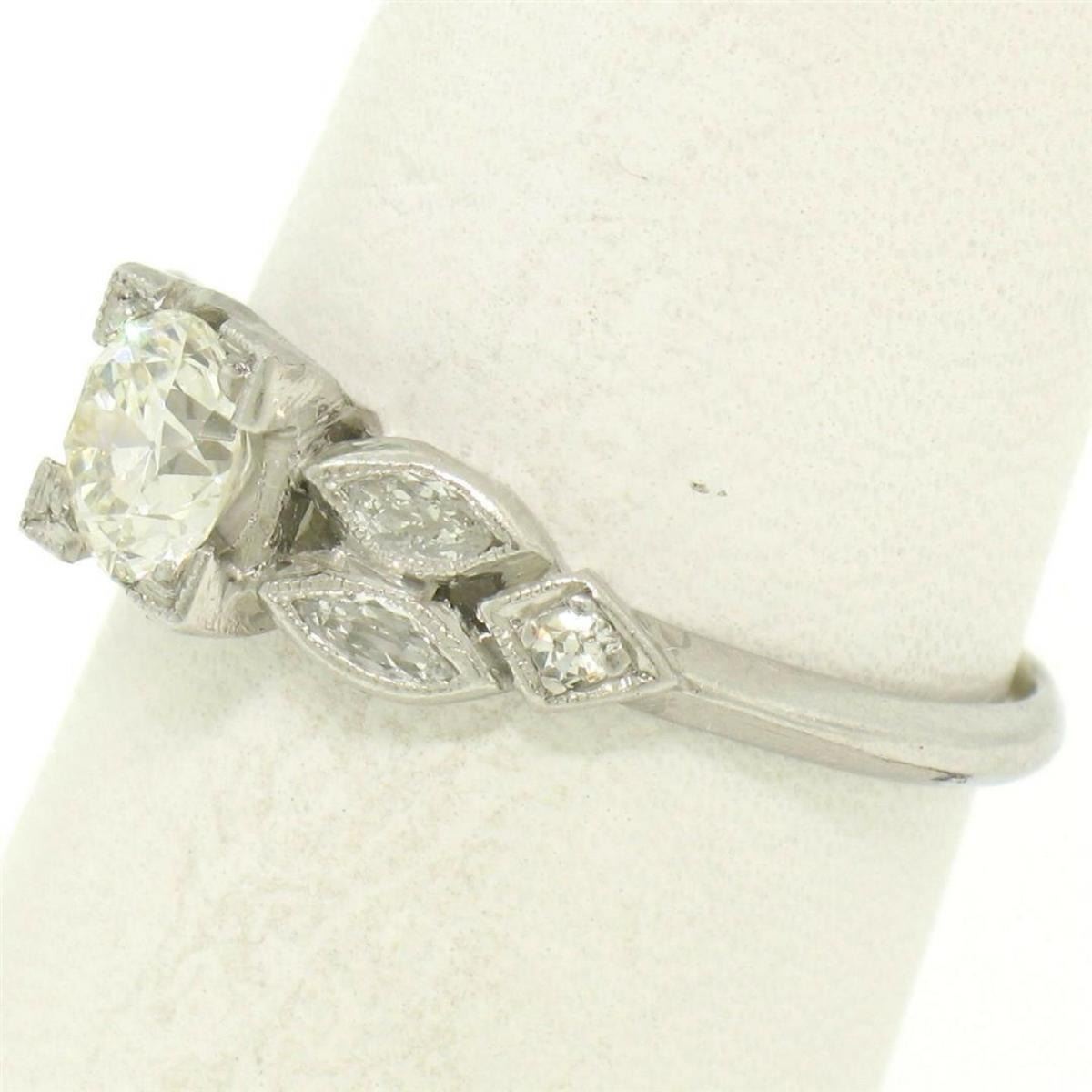 One Antique Art Deco Platinum 0.90ctw European & Marquise Cut Diamond Solitaire Ring. Item Details: Material: Solid .900 Platinum (10% Iridium), Weight: 2.9 Grams, Stone(s): (1) Natural Genuine Diamond - Old European Cut - Bead Set - H Color - VS1 Clarity - 0.65ct (approx.), (4) Natural Genuine Diamonds - Marquise Cut - Bezel Set - H Color - VS2 Clarity - 0.20ctw (approx.), (2) Natural Genuine Diamonds - Single Cut - Prong Set - H Color - VS2 Clarity - 0.05ctw (approx.), Total Carat Weight: 0.90 (approx.), Ring Size: 7.5 , Ring Width: 6.2mm Ring Height: 4.44mm rise off the finger Condition: Antique ring - Excellent and ready to wear condition! Hallmark(s): Platinum 10% Irid
