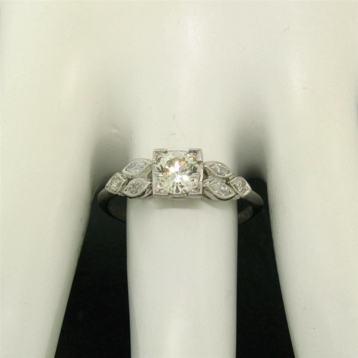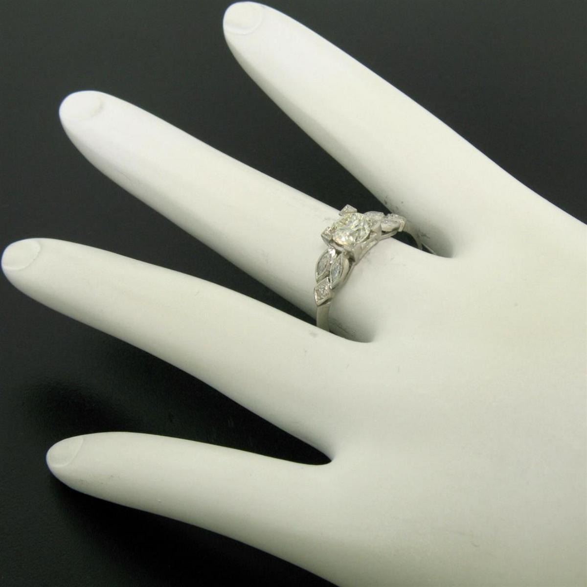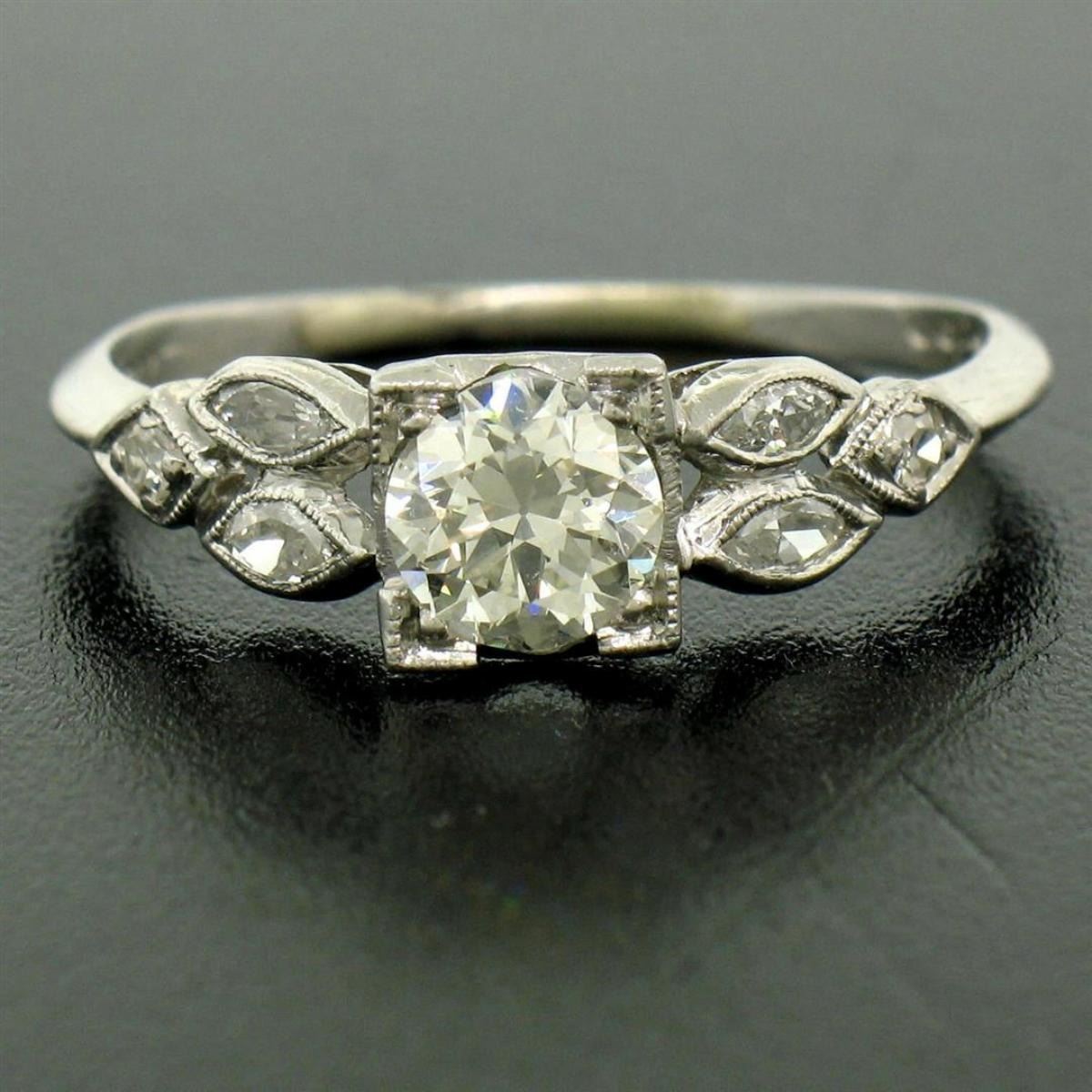 One Antique Art Deco Platinum 0.90ctw European & Marquise Cut Diamond Solitaire Ring. Item Details: Material: Solid .900 Platinum (10% Iridium), Weight: 2.9 Grams, Stone(s): (1) Natural Genuine Diamond - Old European Cut - Bead Set - H Color - VS1 Clarity - 0.65ct (approx.), (4) Natural Genuine Diamonds - Marquise Cut - Bezel Set - H Color - VS2 Clarity - 0.20ctw (approx.), (2) Natural Genuine Diamonds - Single Cut - Prong Set - H Color - VS2 Clarity - 0.05ctw (approx.), Total Carat Weight: 0.90 (approx.), Ring Size: 7.5 , Ring Width: 6.2mm Ring Height: 4.44mm rise off the finger Condition: Antique ring - Excellent and ready to wear condition! Hallmark(s): Platinum 10% Irid