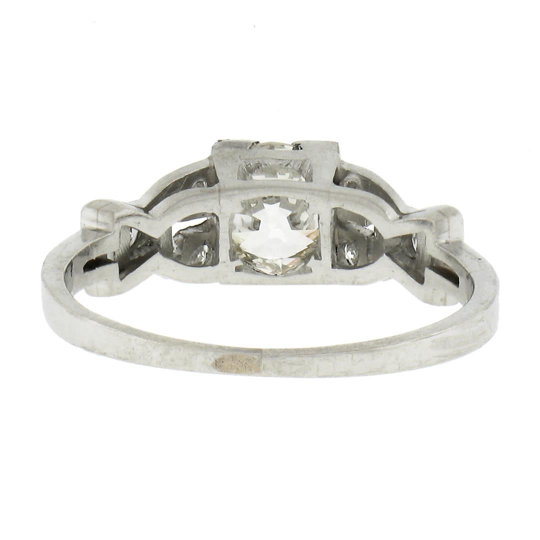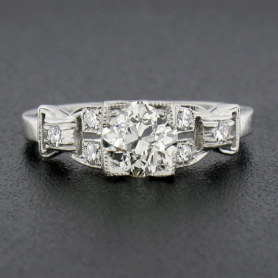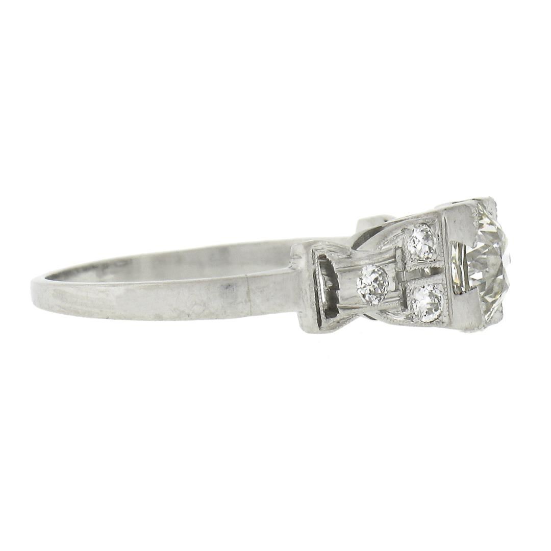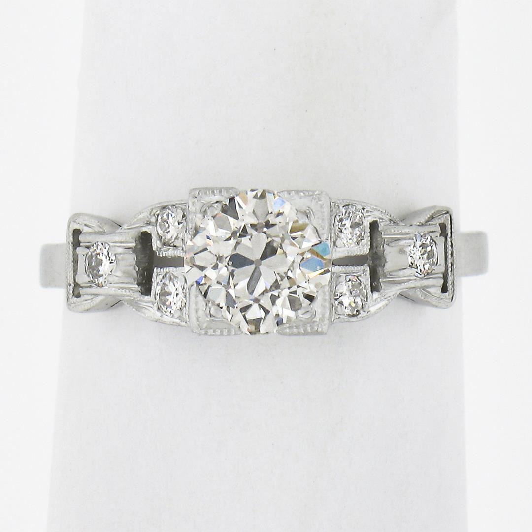 An antique solid paltinum ring, with 1 old european cut natural diamond (K - VS1 ; 0.80ct), and 6 old european cut natural diamonds (G-I - VS2-SI2 ; 0.12ctw). The ring is size 5.0, weighs a total of 3.17 grams, and measures 5.8mm wide.