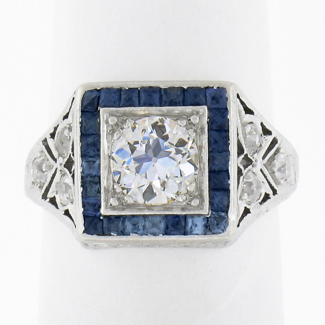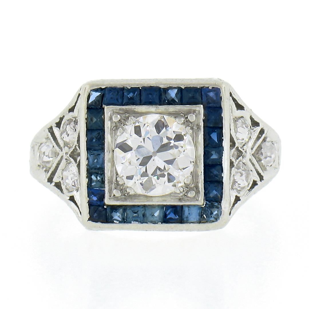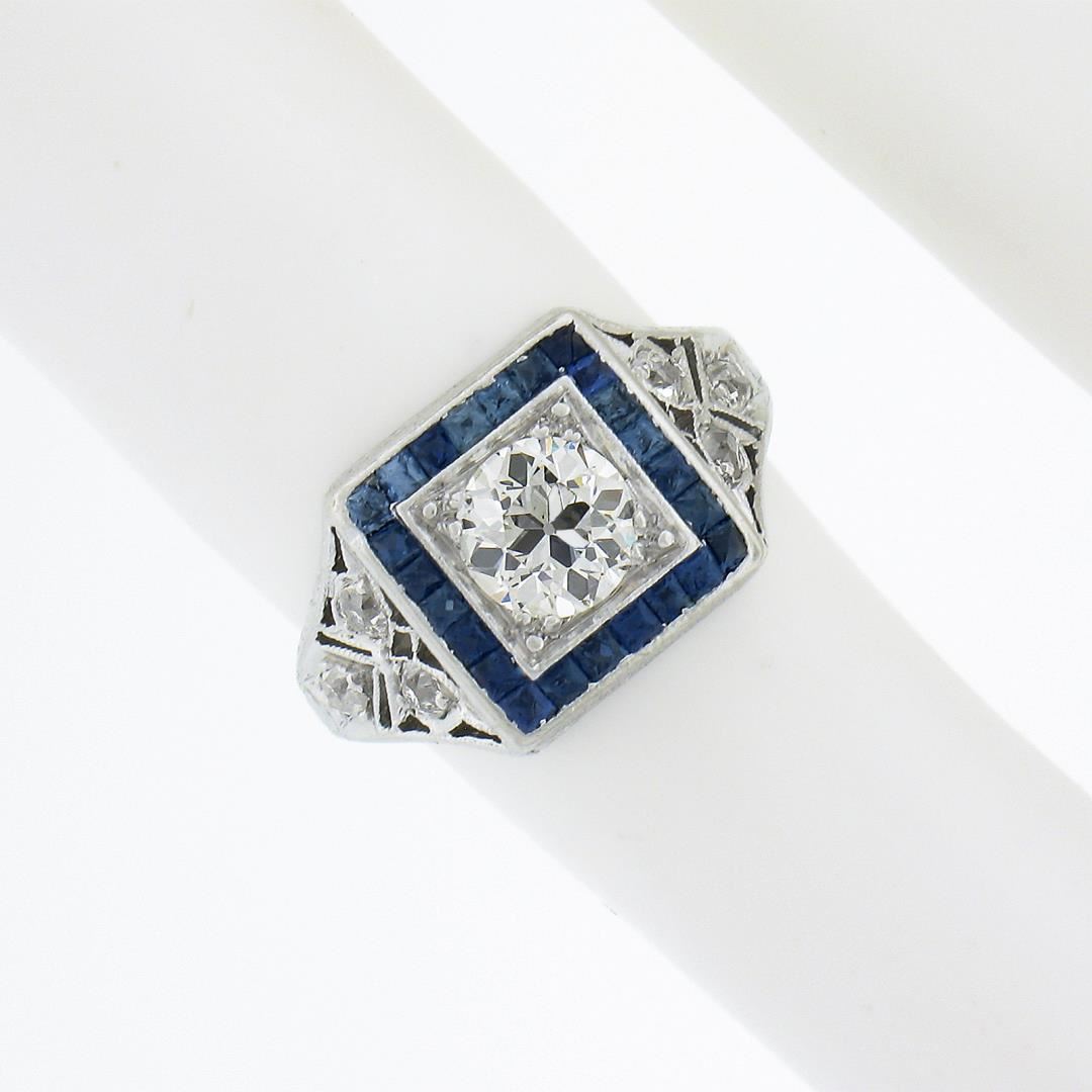 An antique solid platinum ring, with 1 old european cut natural diamond (J - VS2 ; 0.52ct ), 6 old single cut natural diamonds ( G-I - SI1-I1 ; 0.18ctw), and 24 square step cut natural sapphires (0.72ctw). The ring is size 2.5, weighs a total of 4.05 grams, and measures 9.6mm wide.