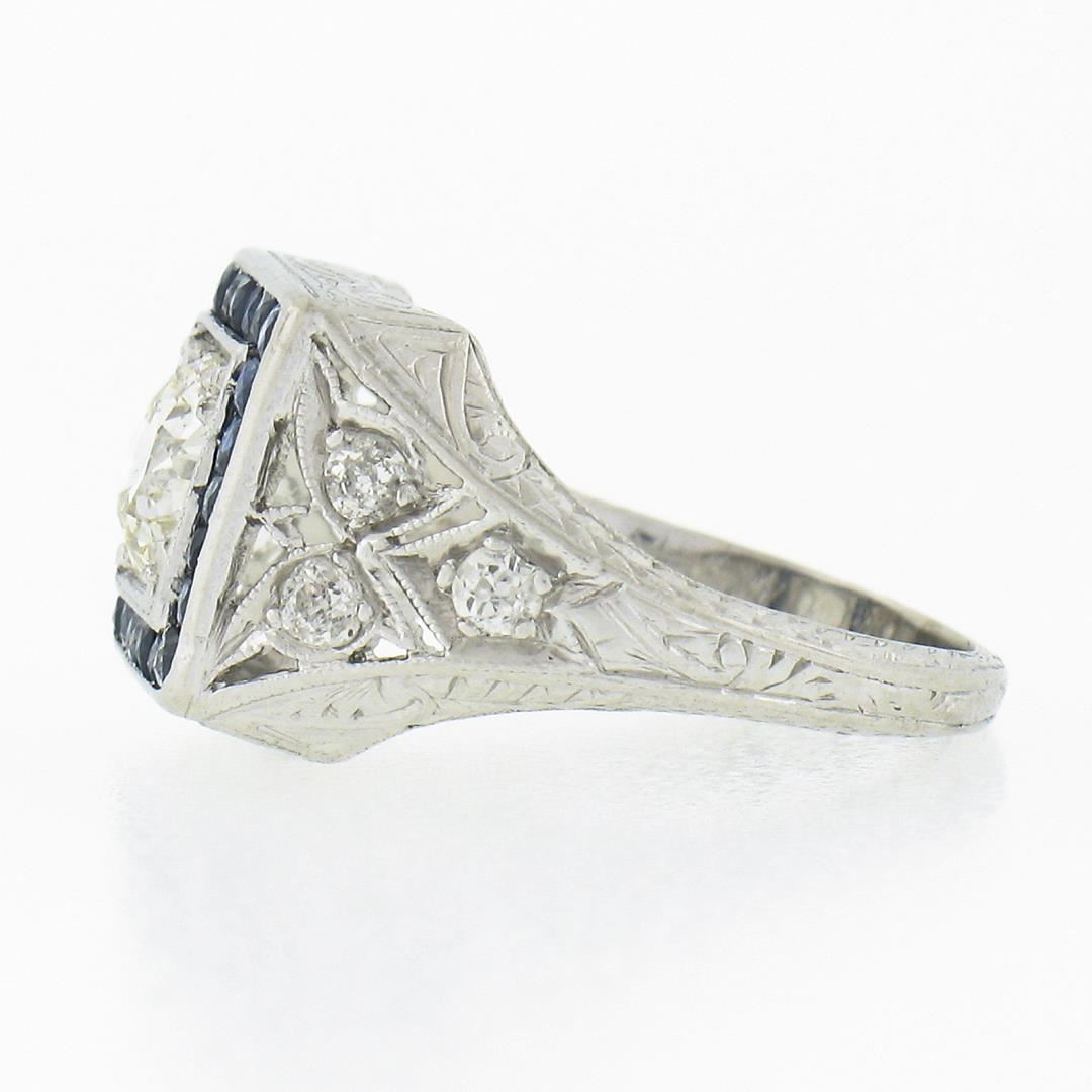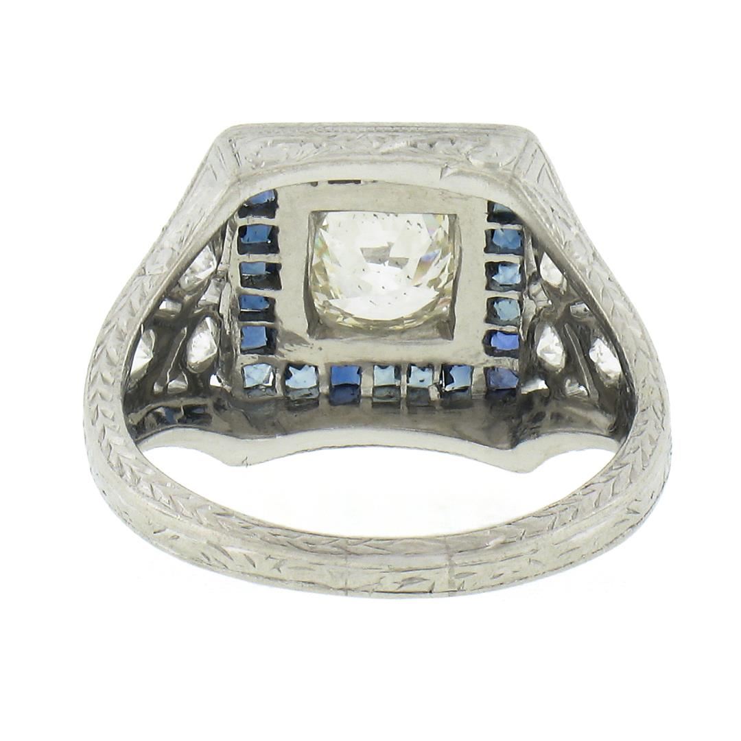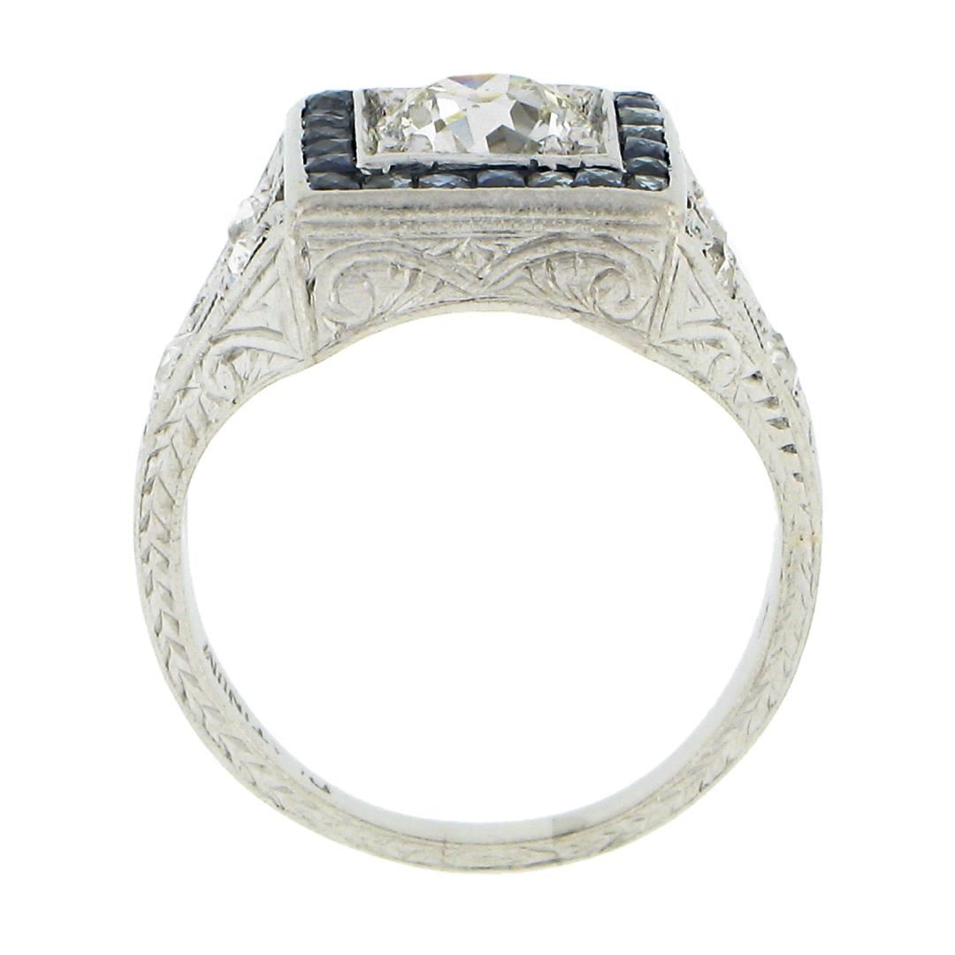 An antique solid platinum ring, with 1 old european cut natural diamond (J - VS2 ; 0.52ct ), 6 old single cut natural diamonds ( G-I - SI1-I1 ; 0.18ctw), and 24 square step cut natural sapphires (0.72ctw). The ring is size 2.5, weighs a total of 4.05 grams, and measures 9.6mm wide.