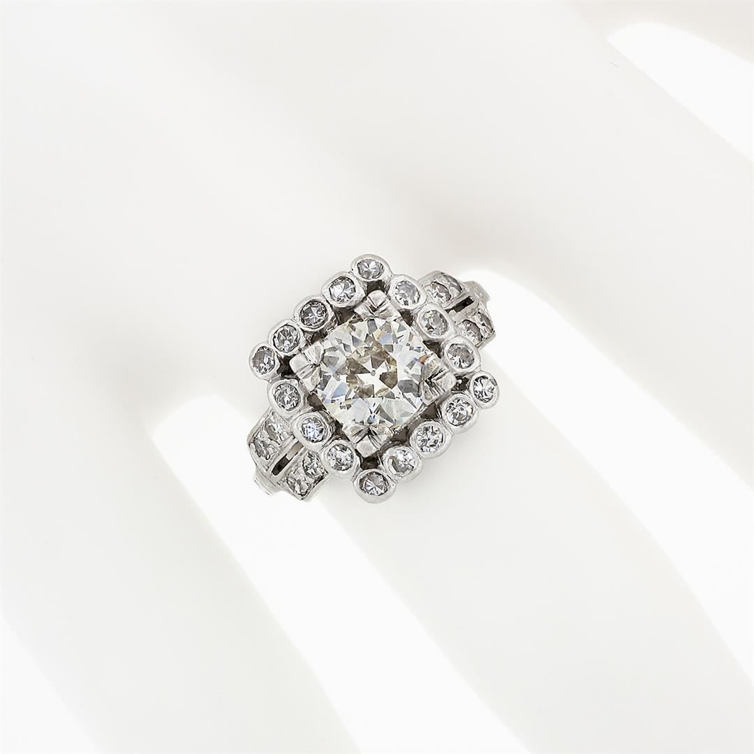 An antique art deco solid platinum engagement ring, featuring 1 old european cut natural diamond (O/P - VS2 ; 6.75mm - 1.20ct), surrounded with 24 round single cut natural diamonds (G/H - VS1 to SI1 ; 0.54ctw). The ring is size 6.0, weighs a total of 4.24 grams, and measures 12.29mm wide.
