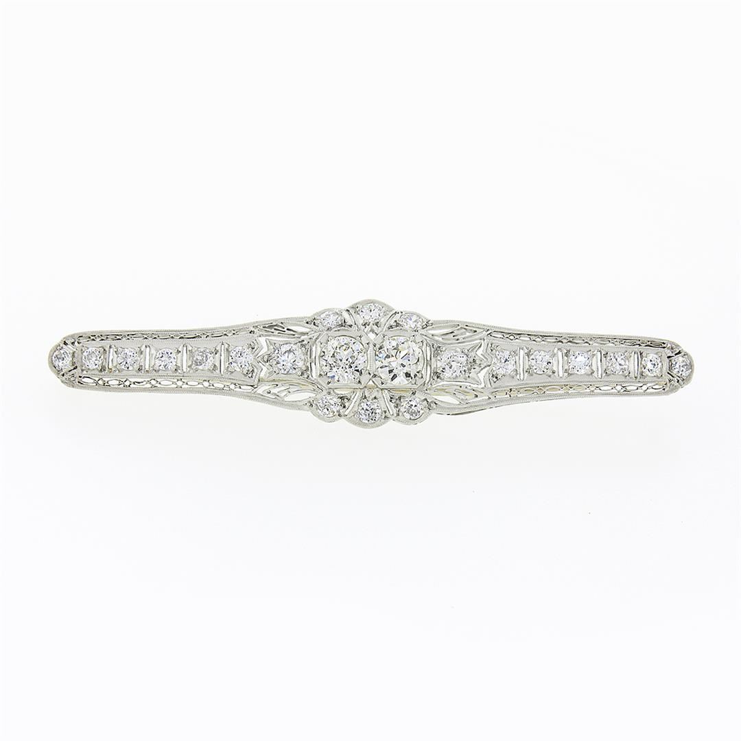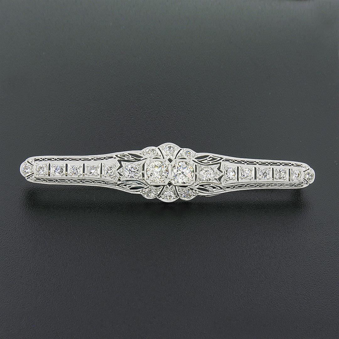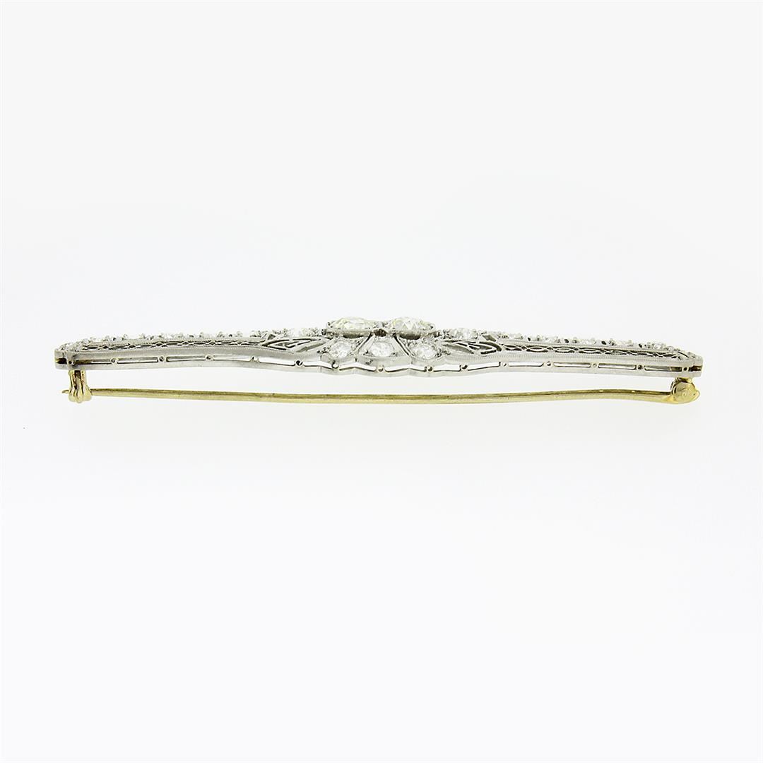 An antique solid platinum pin brooch, with 22 old eurooean cut natural diamonds (H-L - VS2/SI2 ; 4.04ctw)Measures 15.60x76.25mm and weighs a total of 10.51 grams.