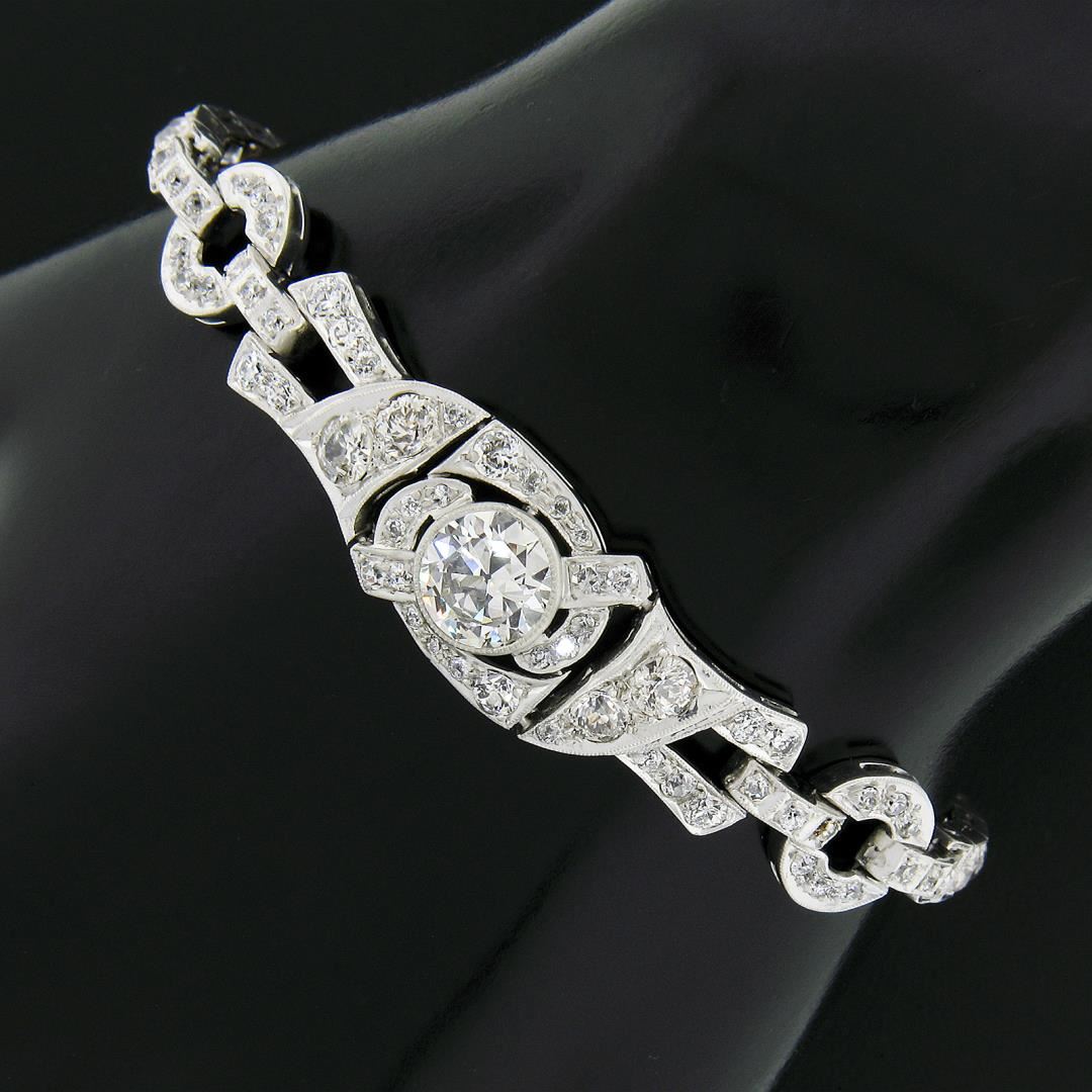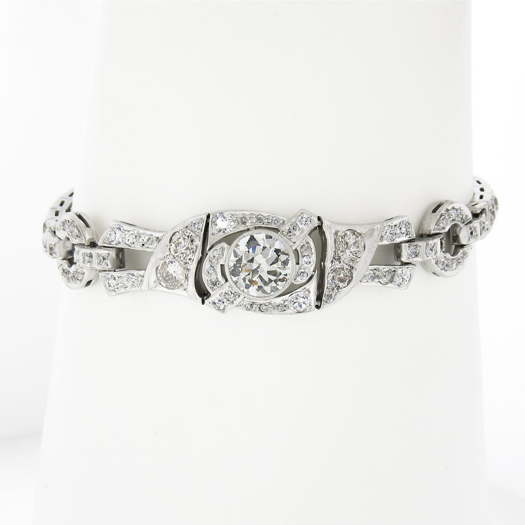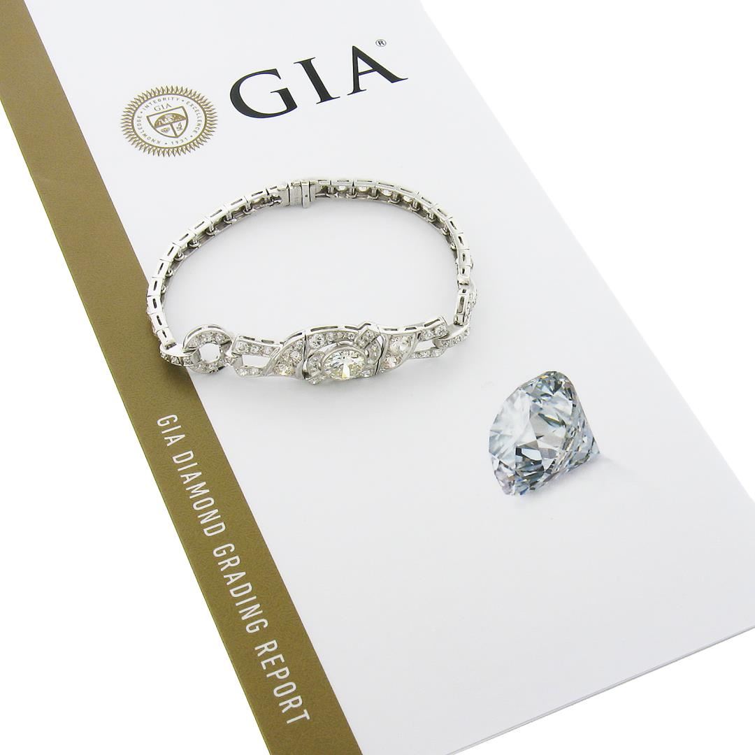 An antique solid paltinum belly bracelet, with 1 GIA graded old european cut natural diamond (L - SI2 ; 1.38ct ), and 78 old european & single cut natural diamonds (H-L - VS2-I1 ; 4.16ctw). It weighs a total of 17.48 grams, measures 12.65mm wide, and measures 6.25 inches in length. Comes with all original relevant certifications.