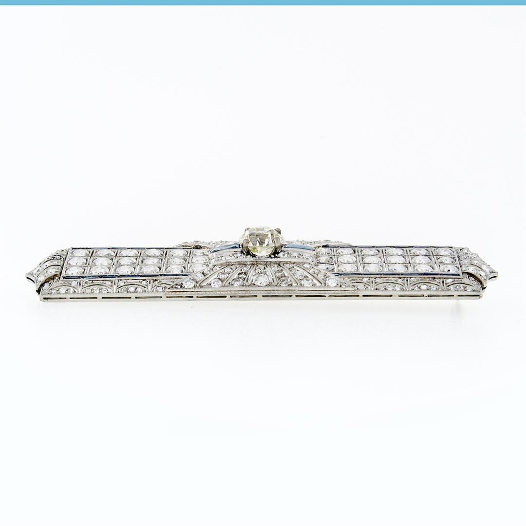 An antique. art deco solid platinum bar pin brooch, with 195 old european/rose/single cut natural diamonds (G-L - VS1-SI1; 7.24ctw), and 2 custom bullet cut synthetic sapphires, with straight baguette cut synthetic sapphires. Measures 19.22x73.48mm and weighs a total of 18.09 grams.