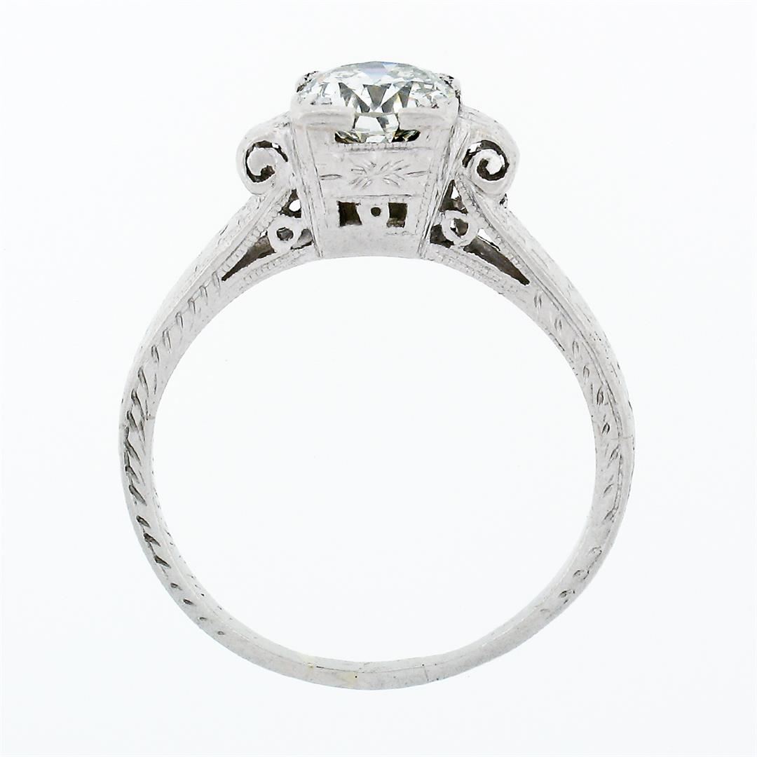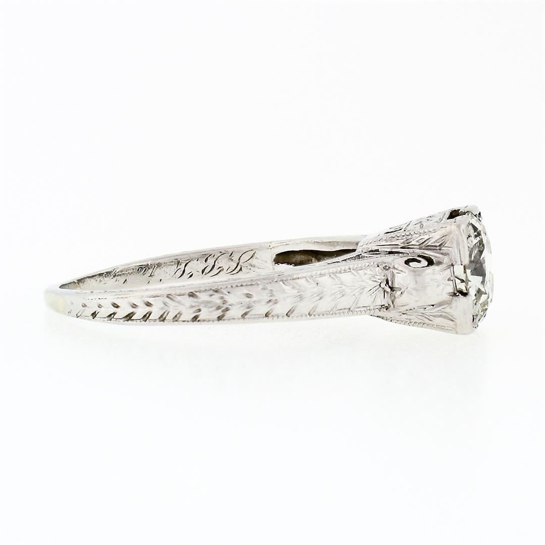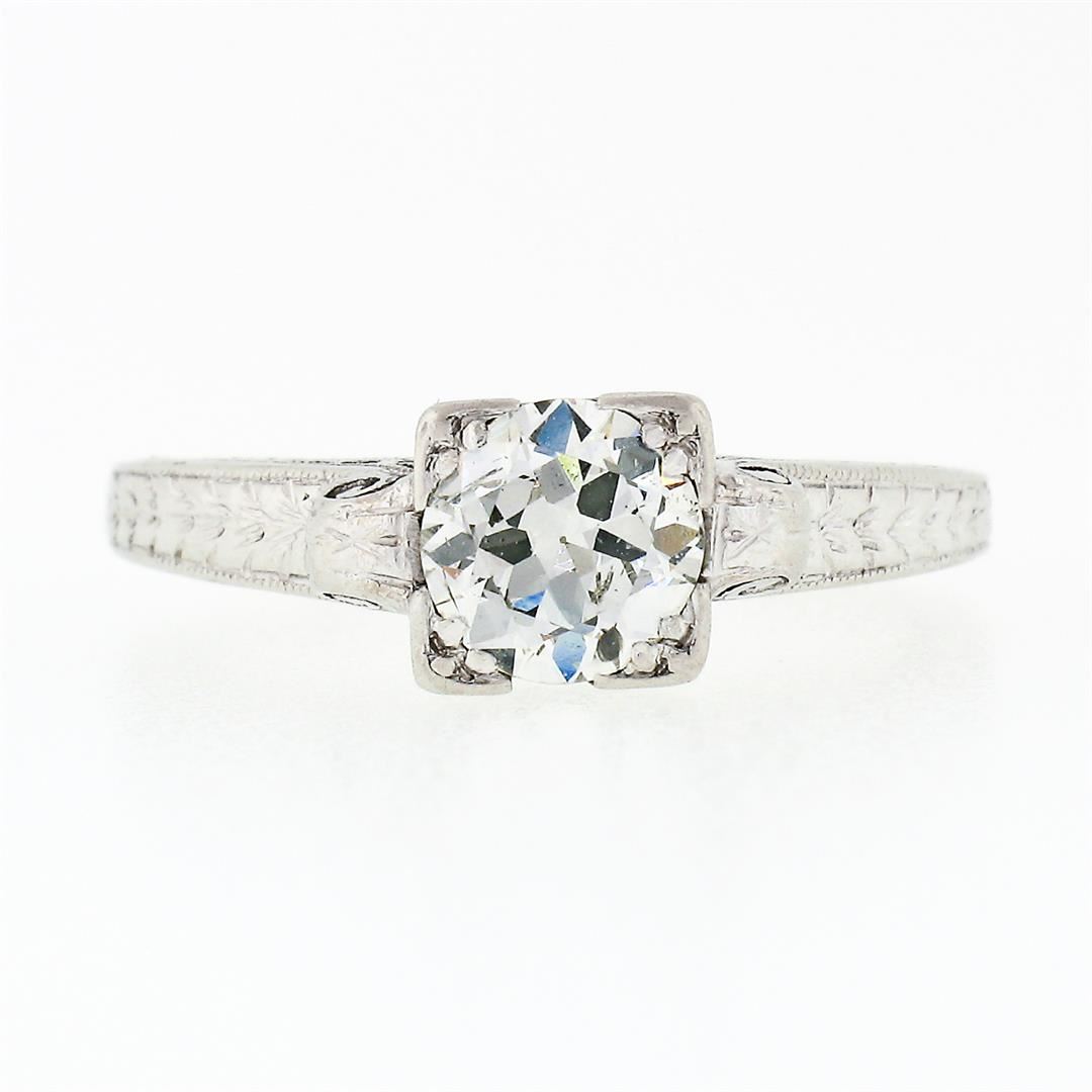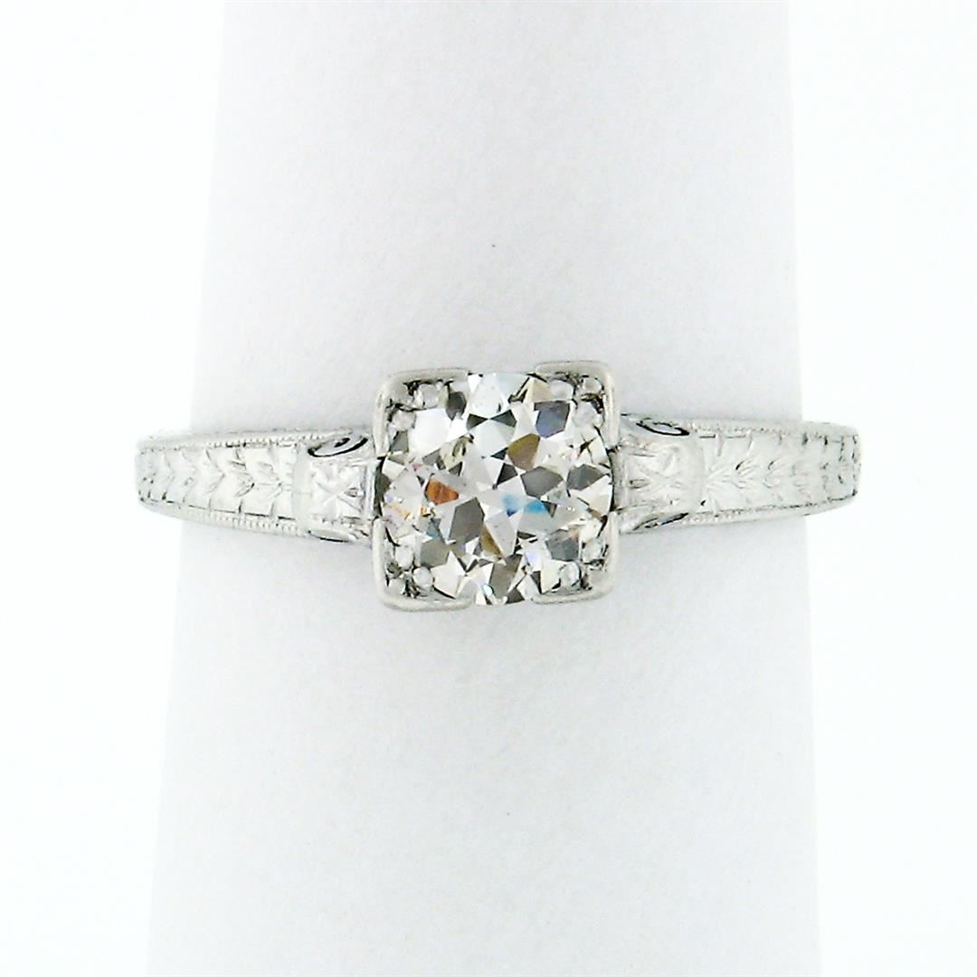 An antique solid platinum engagement ring, with 1 old european cut natural diamond (J - SI2/I1 ; 0.80ctw). The ring is size 6.5, weighs a total of 3.18 grams, and measures 6.25mm wide.