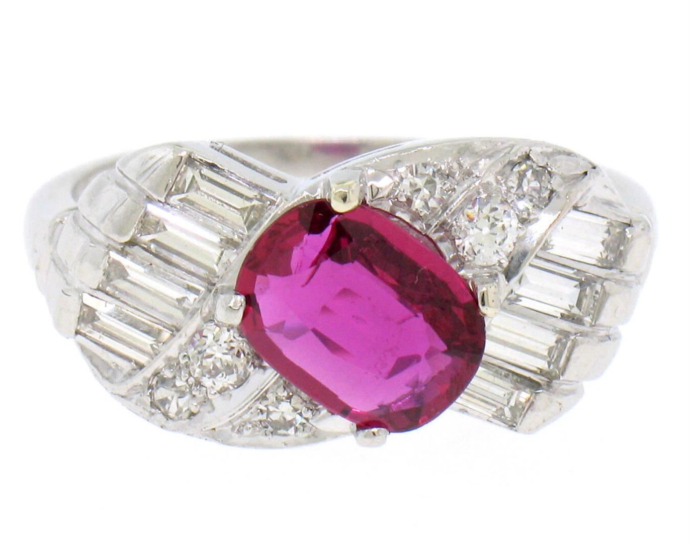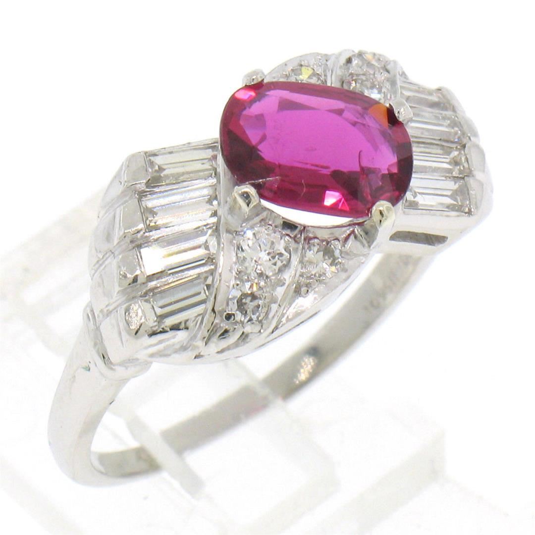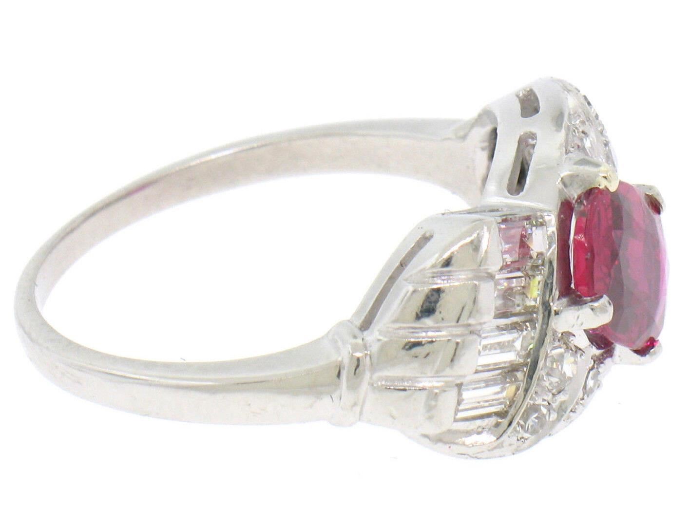 an antique art deco solid platinum ring, featuring 1 AGL certified oval cut natural ruby (1.33ct), surrounded with 14 round single and baguette cut (F - VS1; 0.75ctw). The ring is size 8.5, weighs a total of 8.9 grams, and measures 10.20mm wide. Comes with all original relevant certifications.