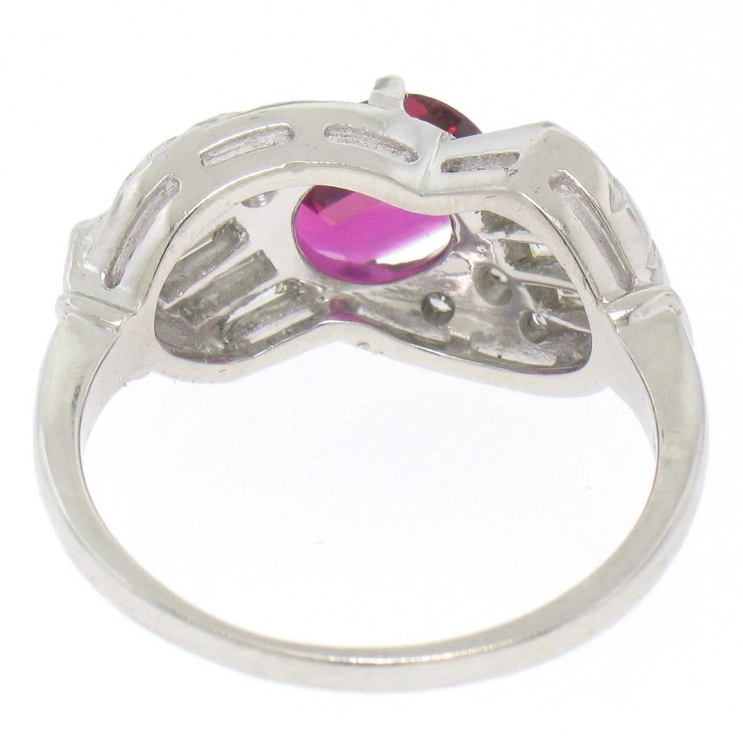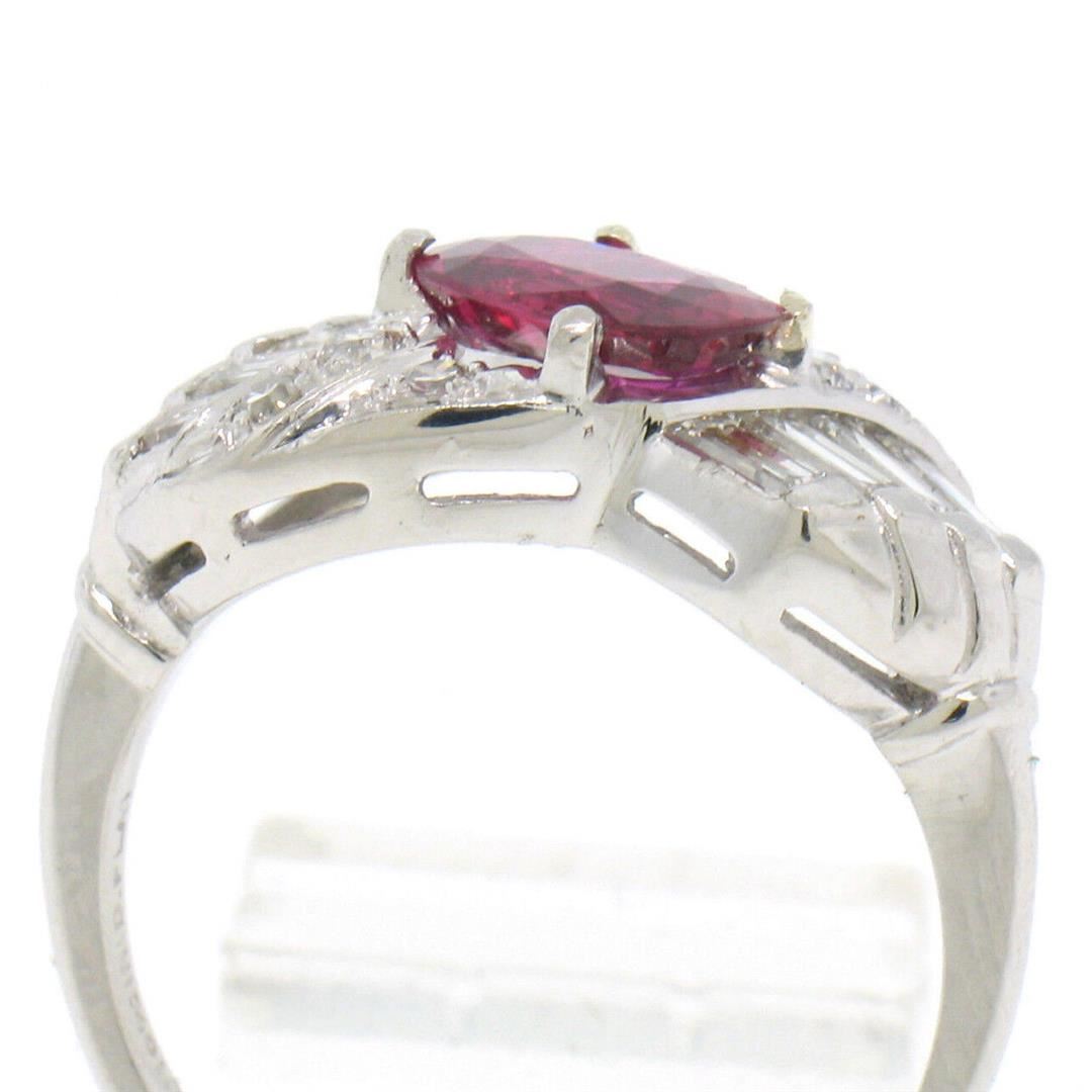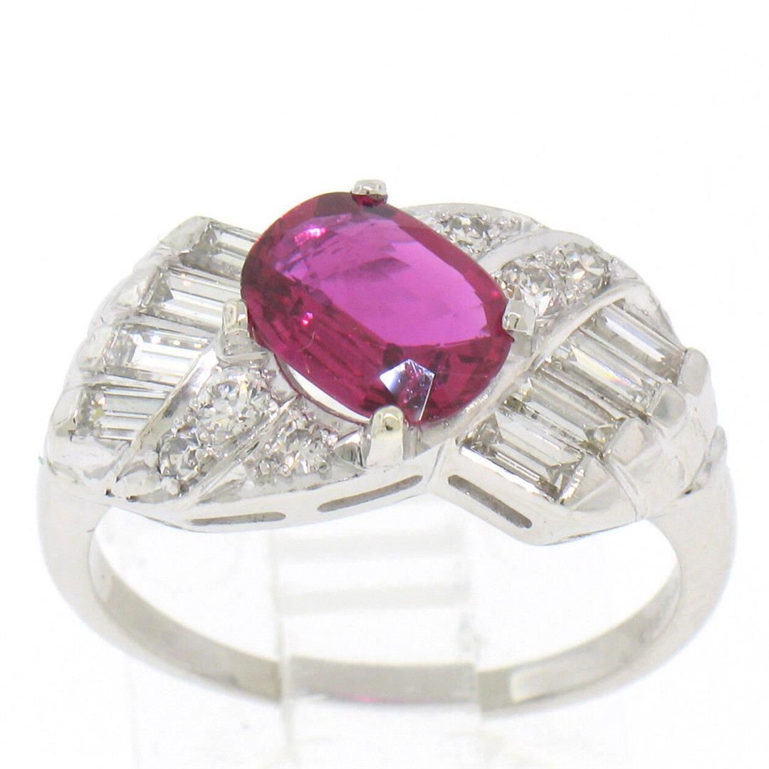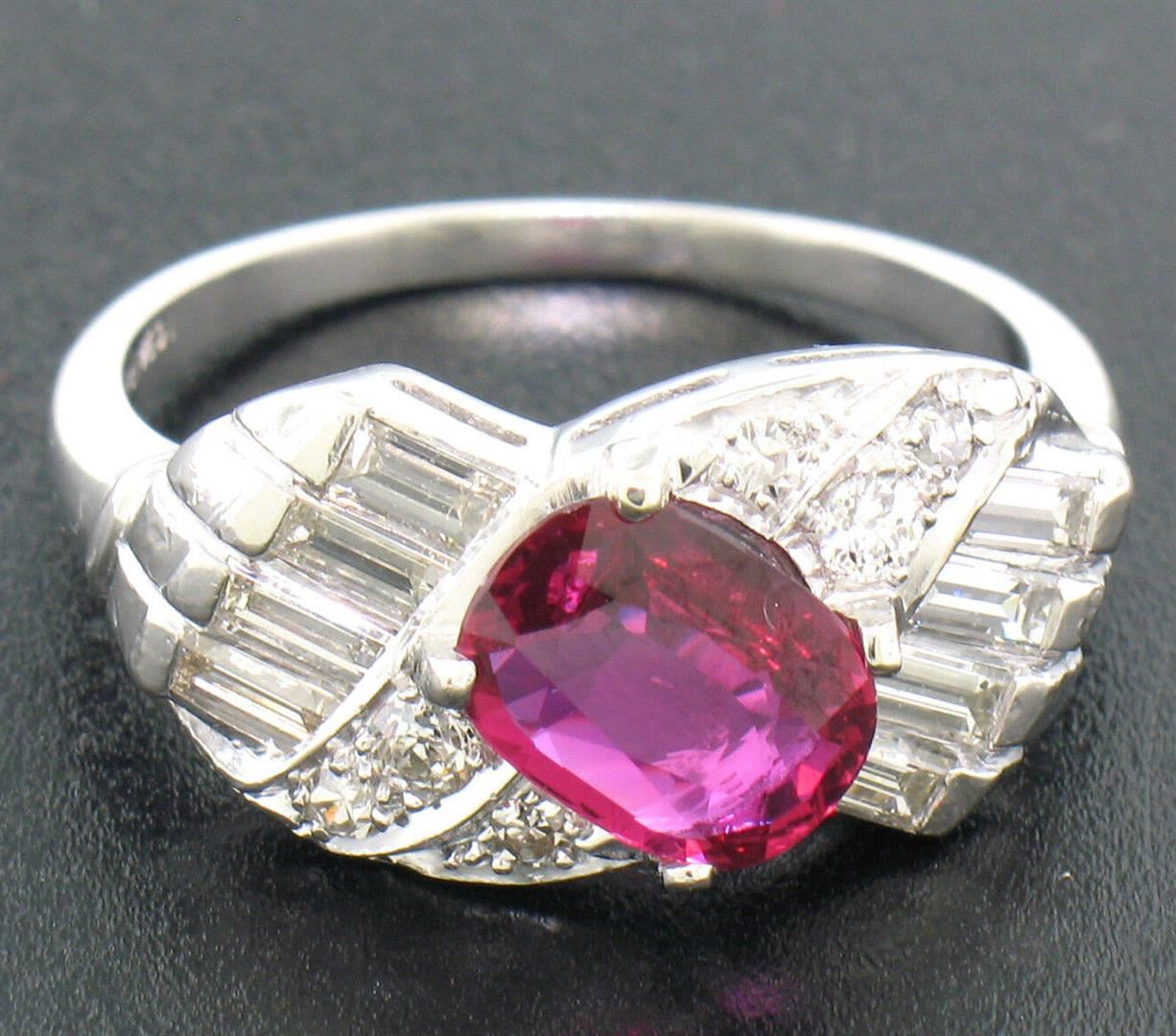 an antique art deco solid platinum ring, featuring 1 AGL certified oval cut natural ruby (1.33ct), surrounded with 14 round single and baguette cut (F - VS1; 0.75ctw). The ring is size 8.5, weighs a total of 8.9 grams, and measures 10.20mm wide. Comes with all original relevant certifications.