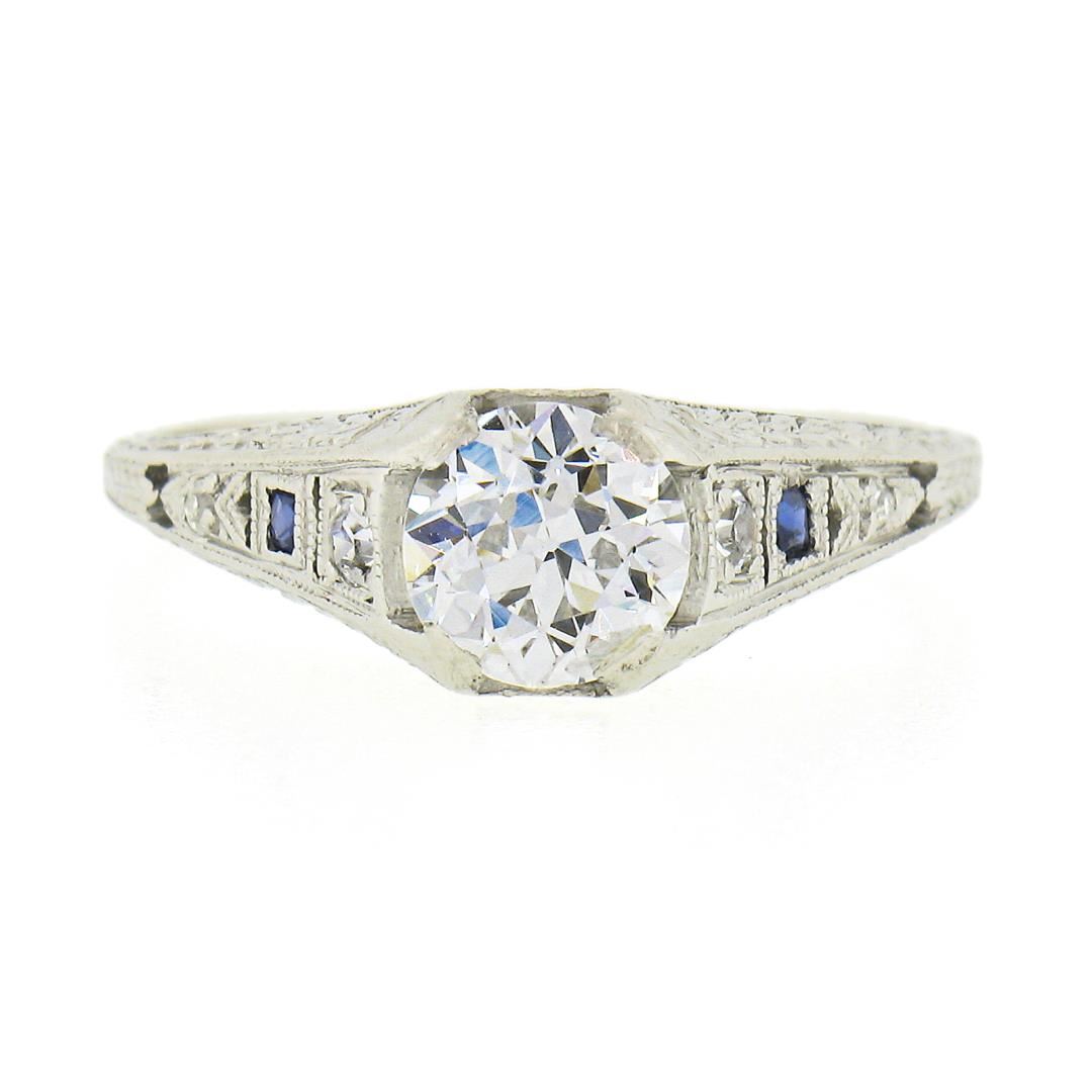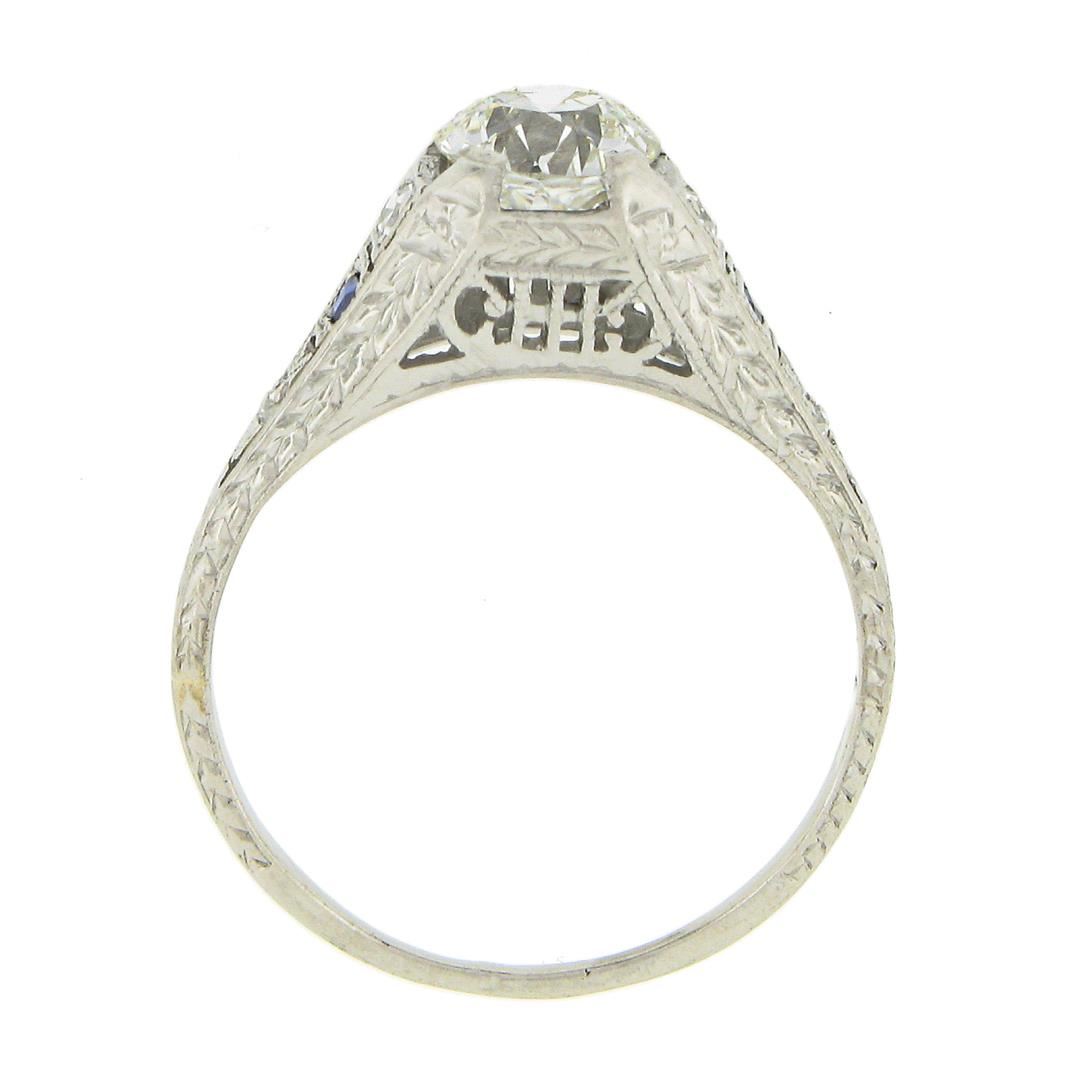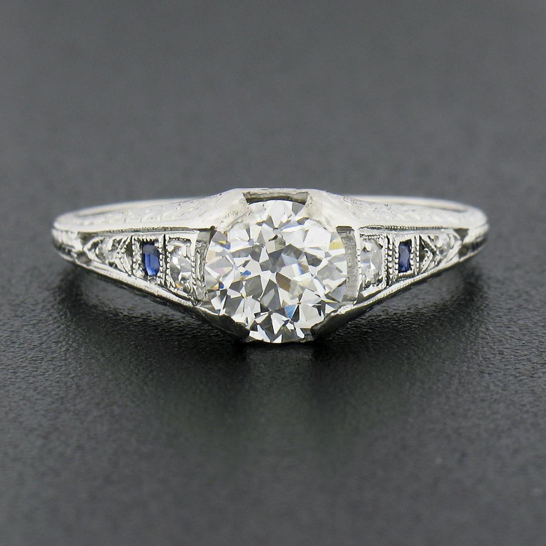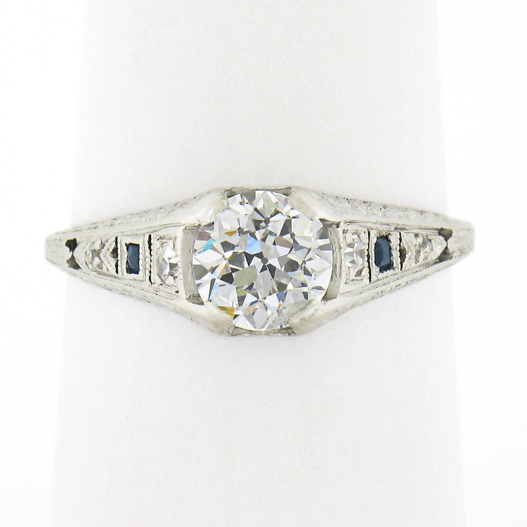 An antique solid paltinum engagement ring, featuring 1 old european cut natural diamond (I - SI2 ; 5.9mm / 0.82ct), accented with 4 old single cut natural diamonds (H/I - SI1 ; 0.06ctw), & 2 square cut natural sapphires (0.04ctw). The ring is size 6.5, weighs a total of 3.18 grams, and measures 6.4mm wide.