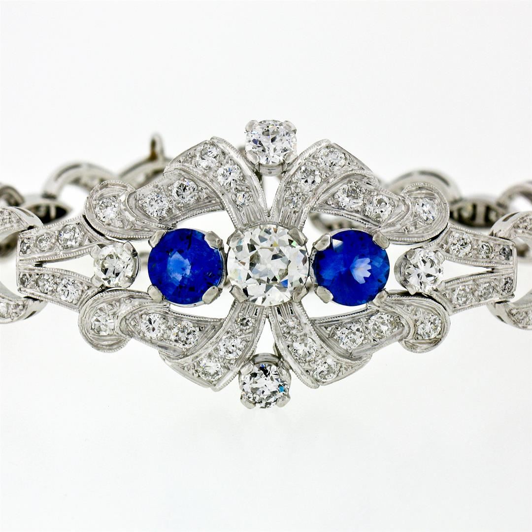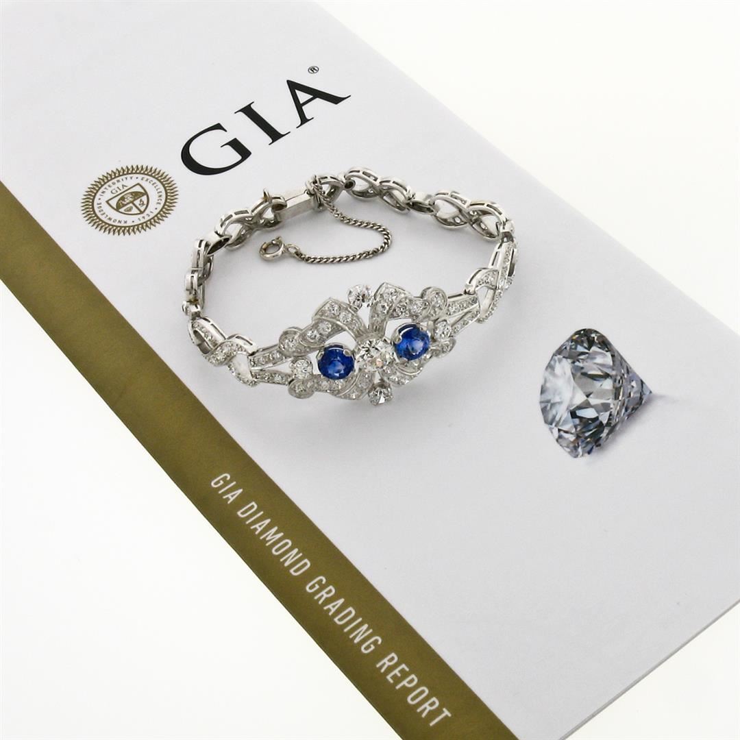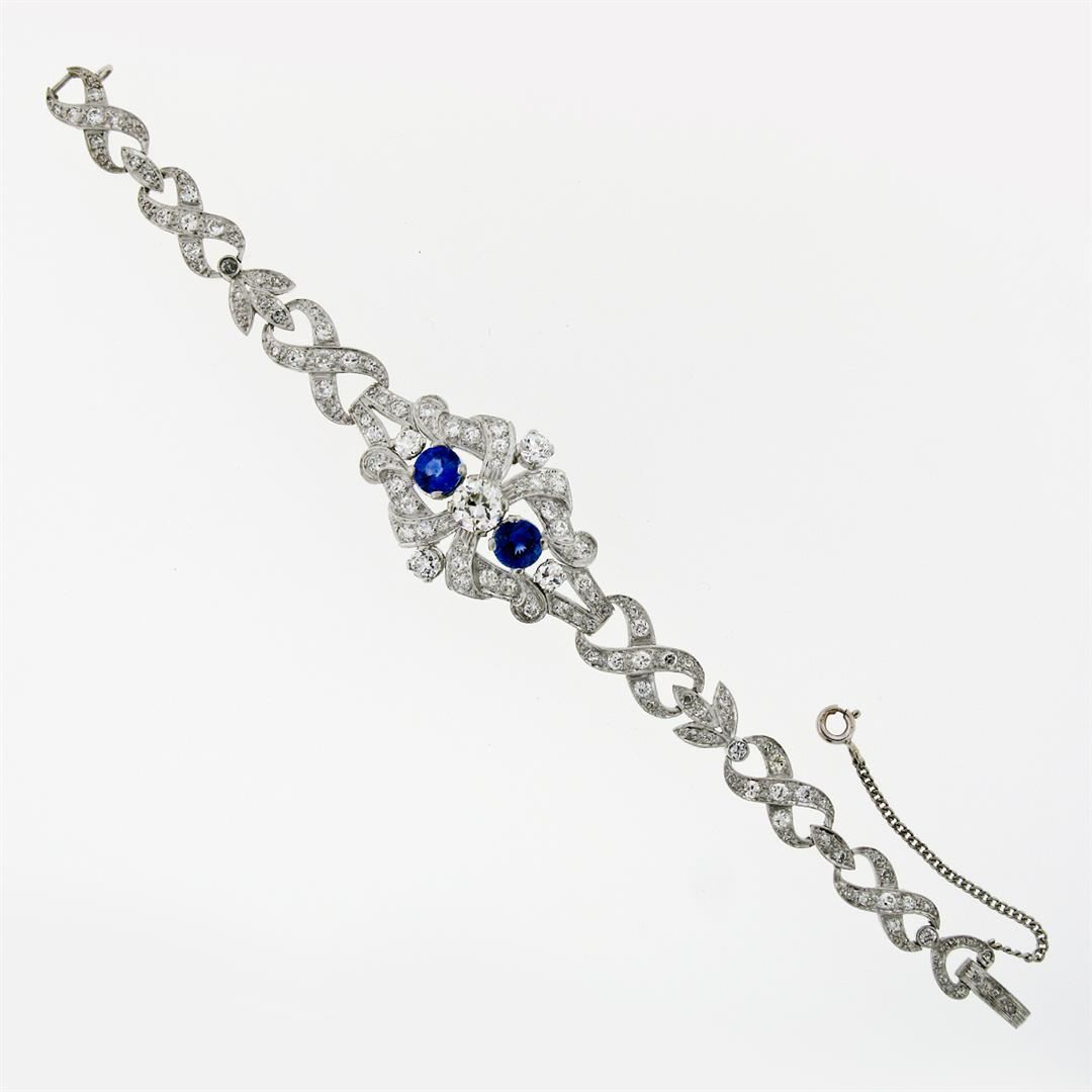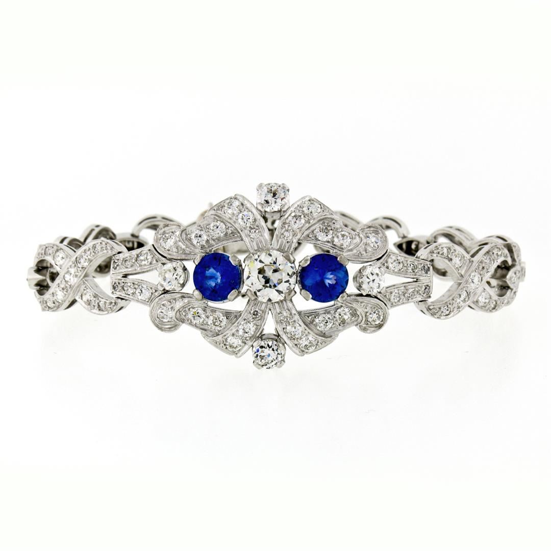 An antique solid platinum infinity leaf link bracelet, with 1 Gia certified old european cut natural diamond (K- SI1 ; 1.14 ct), and 2 round mixed cut natural sapphires (2.17ctw), with 4 old european cut natural diamonds (G/H- VS1/VS2 ; 1.12ctw), and 3 old european cut natural diamonds (G/H- VS2/SI1 ; 0.12ctw), and 115 old single and european cut natural diamonds (G-I - SI1/SI2 ; 3.68ctw). It weighs a total of 30.26 grams, measures 23.88mm wide, and measures 6.25 inches in length. Comes with all original relevant certifications.