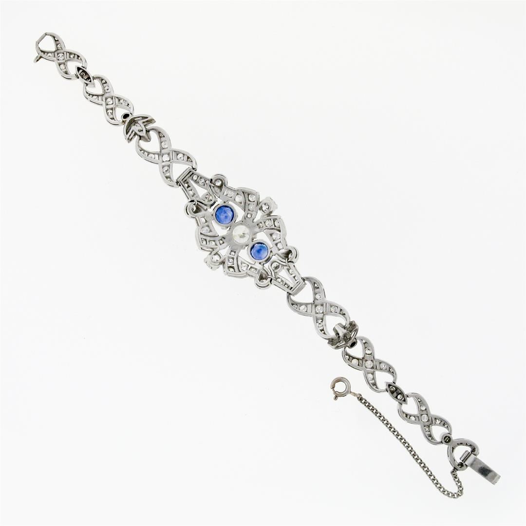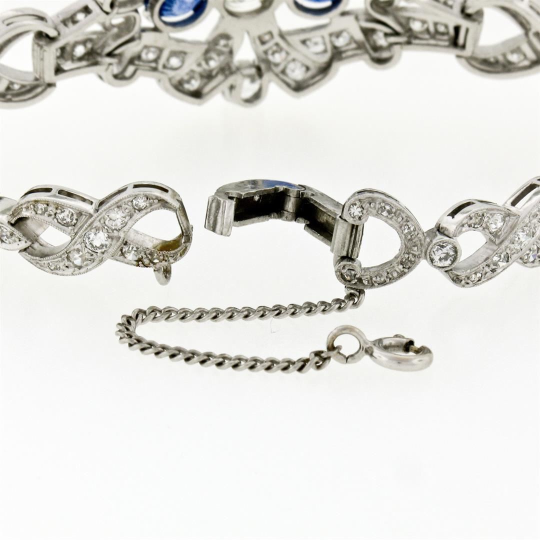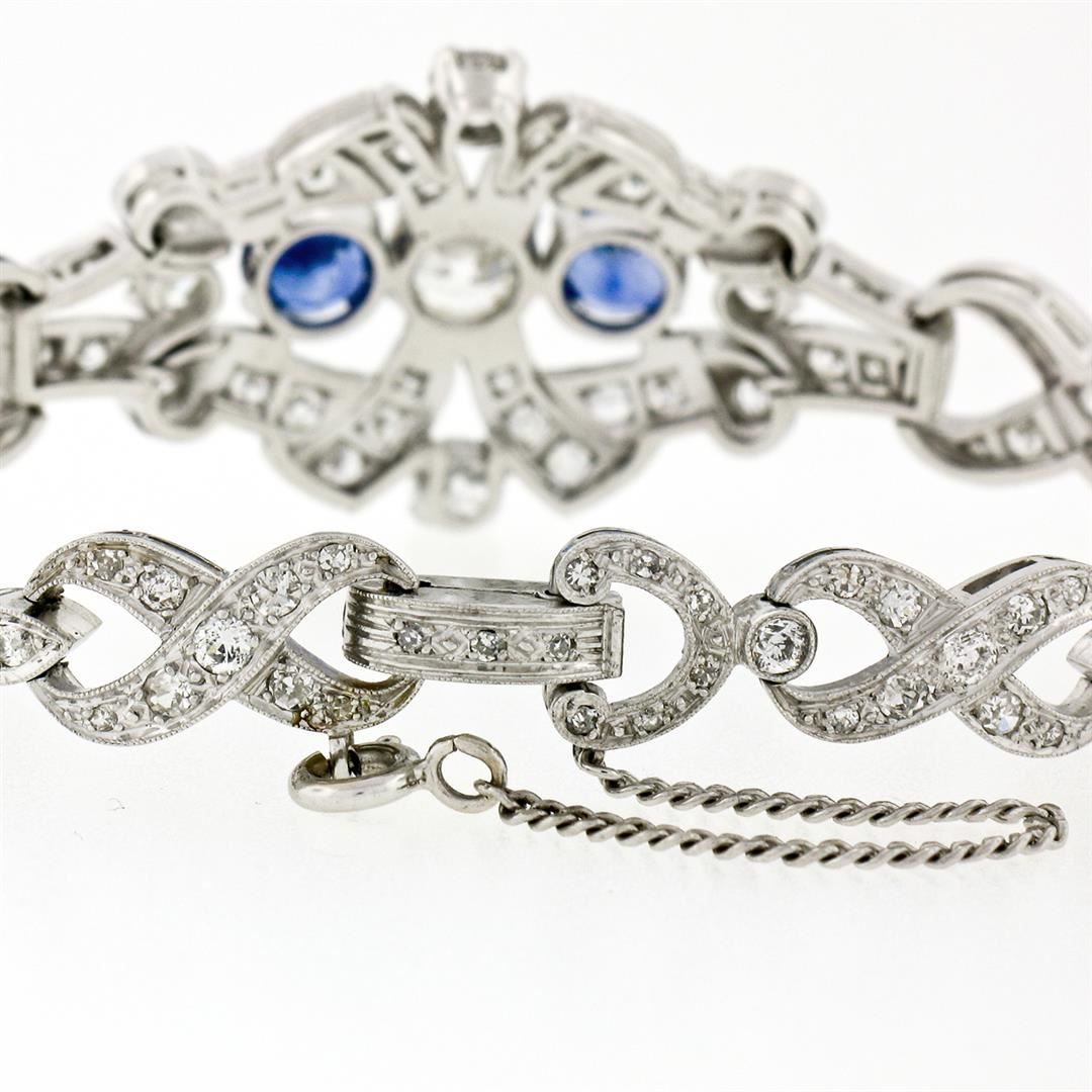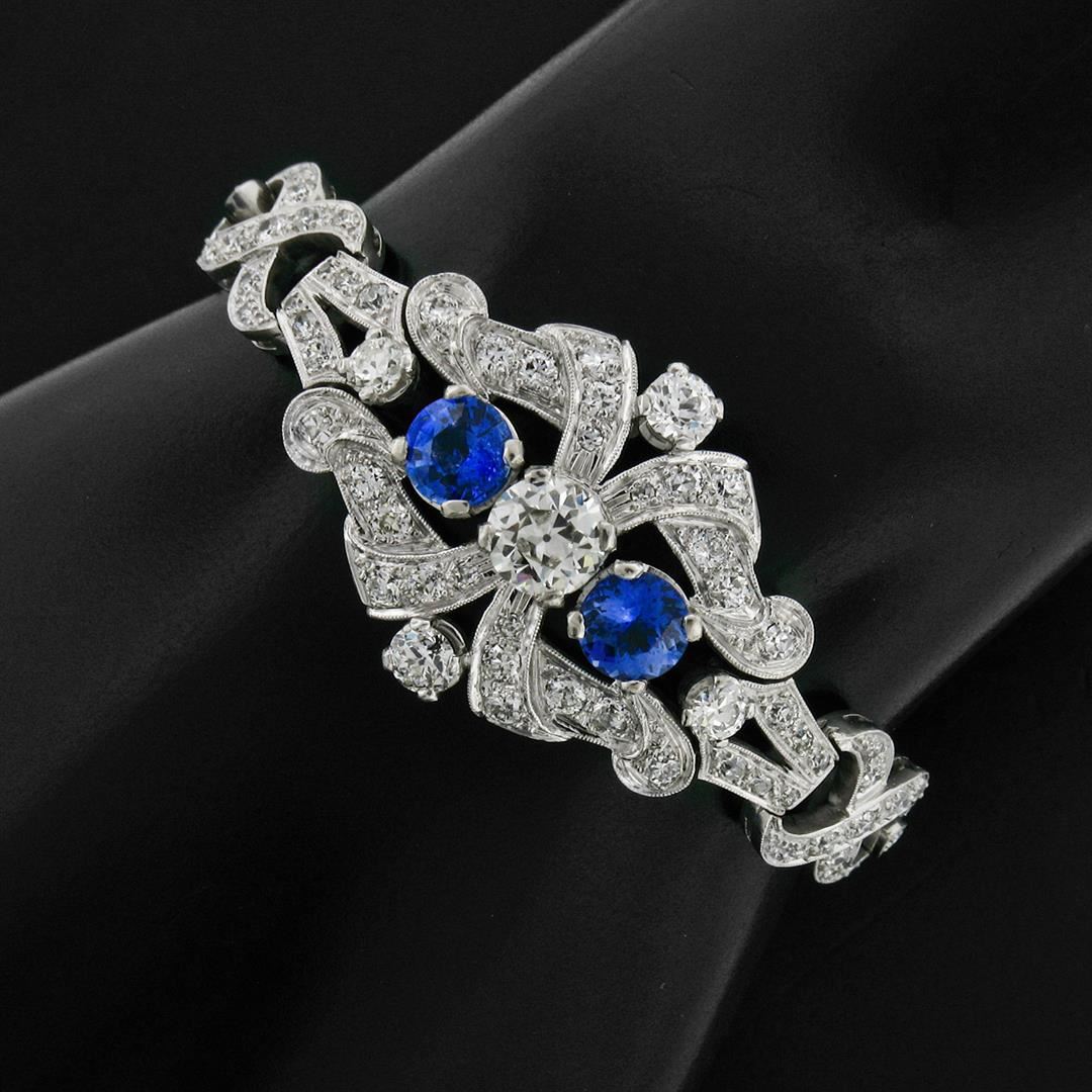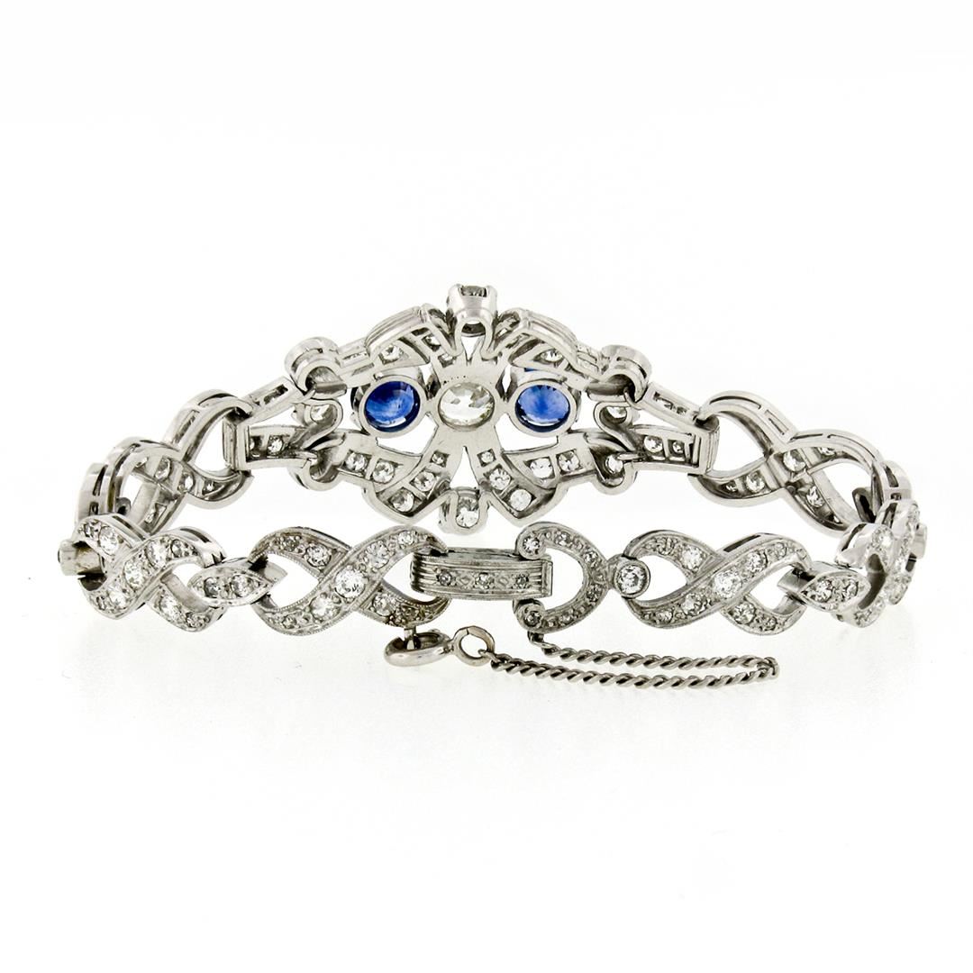 An antique solid platinum infinity leaf link bracelet, with 1 Gia certified old european cut natural diamond (K- SI1 ; 1.14 ct), and 2 round mixed cut natural sapphires (2.17ctw), with 4 old european cut natural diamonds (G/H- VS1/VS2 ; 1.12ctw), and 3 old european cut natural diamonds (G/H- VS2/SI1 ; 0.12ctw), and 115 old single and european cut natural diamonds (G-I - SI1/SI2 ; 3.68ctw). It weighs a total of 30.26 grams, measures 23.88mm wide, and measures 6.25 inches in length. Comes with all original relevant certifications.