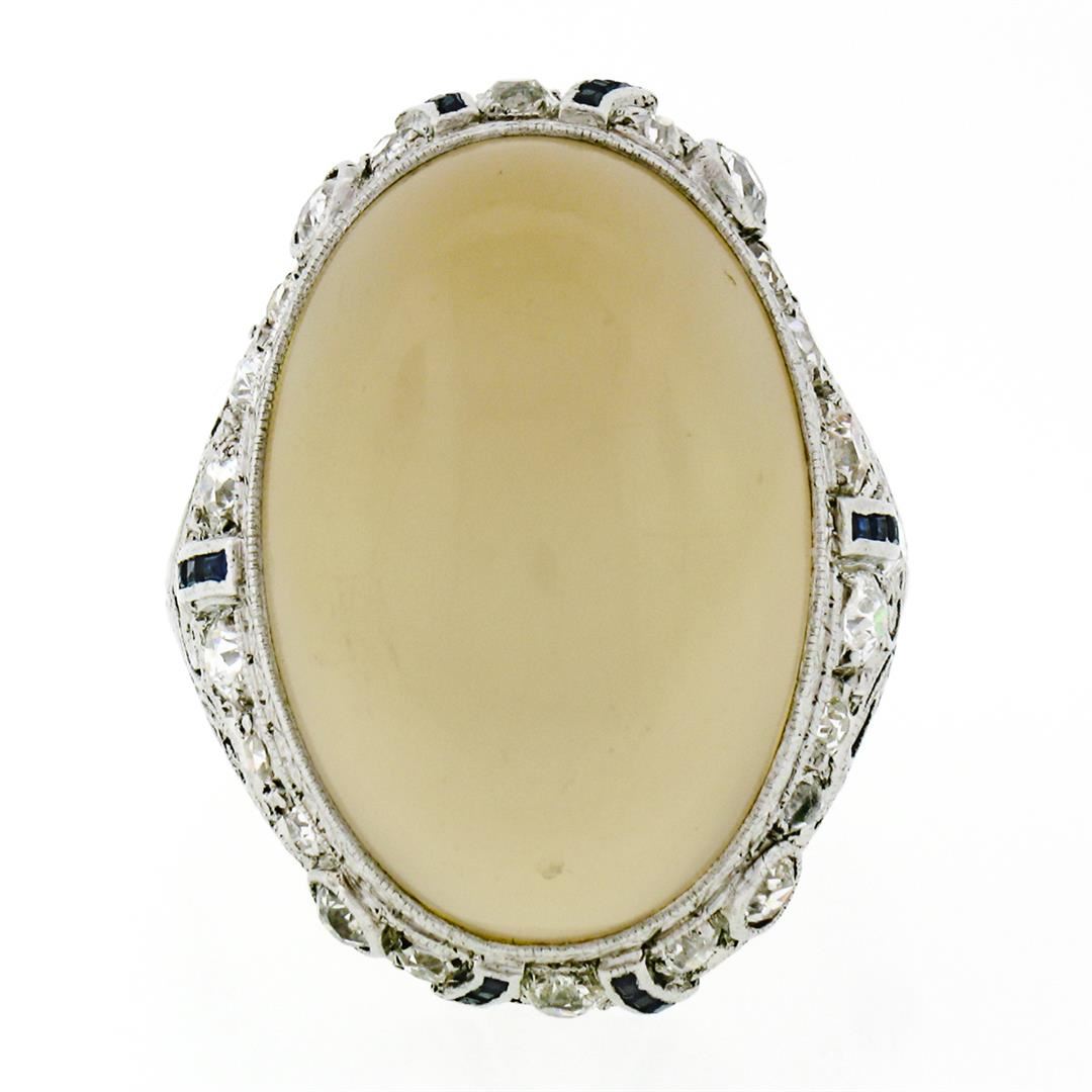 An antique solid platinum cocktail ring, with 1 oval cabochon cut natural moonstone (22.0x15.0mm ), and 24 old european cut natural diamonds (G/I - VS1/SI2 ;1.40ctw), with 18 baguette calibré Cut natural sapphires (0.36ctw). The ring is size 7.75, weighs a total of 11.25 grams, and measures 25.68mm wide.