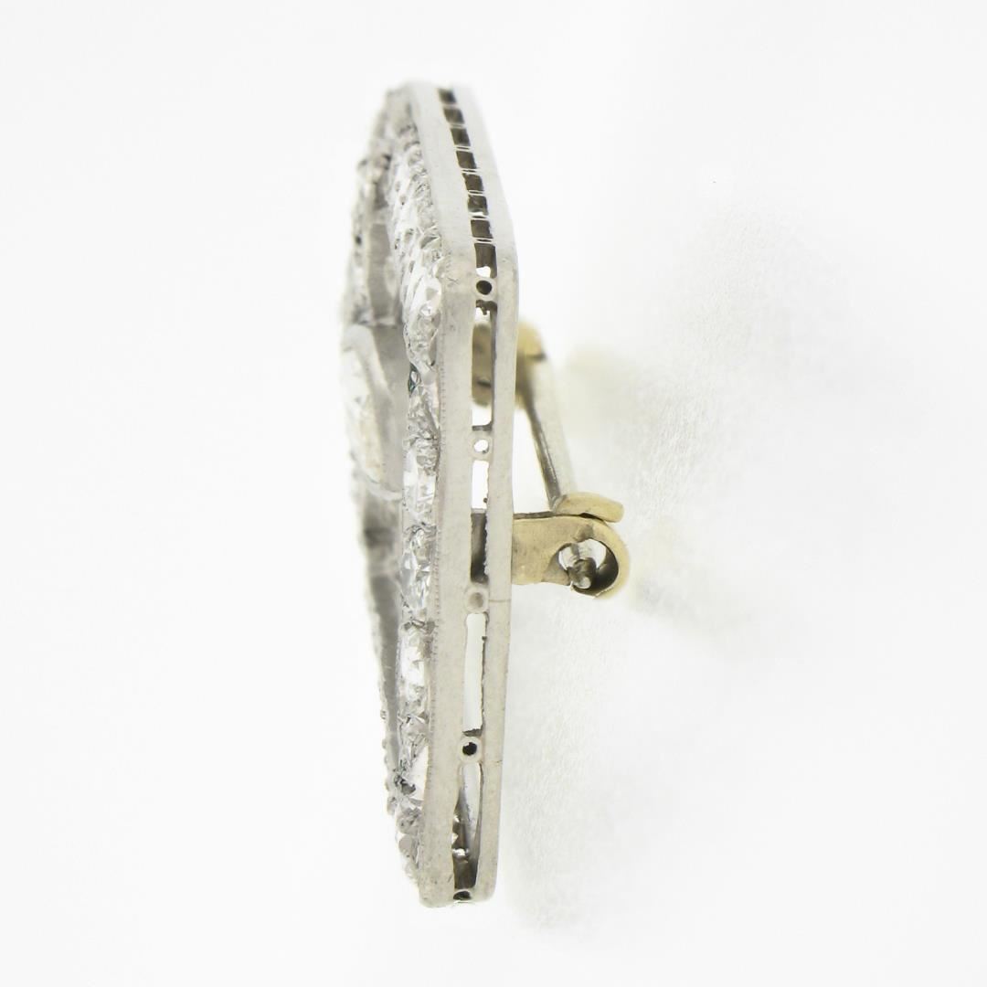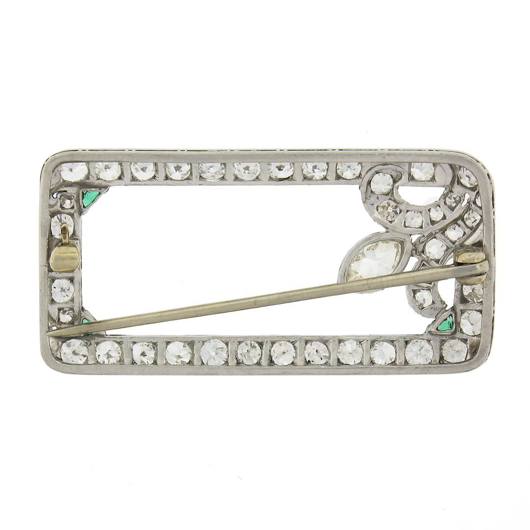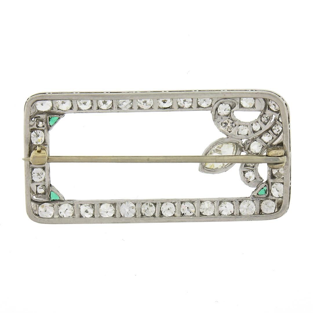 An antique solid platinum brooch, with 42 old european cut & 1 old marquise cut natural diamonds (G/I - VS1-SI2 ; 2.25ctw), and 3 triangular cut synthetic emeralds . Measures 18.5x37.3mm and weighs a total of 5.9 grams.
