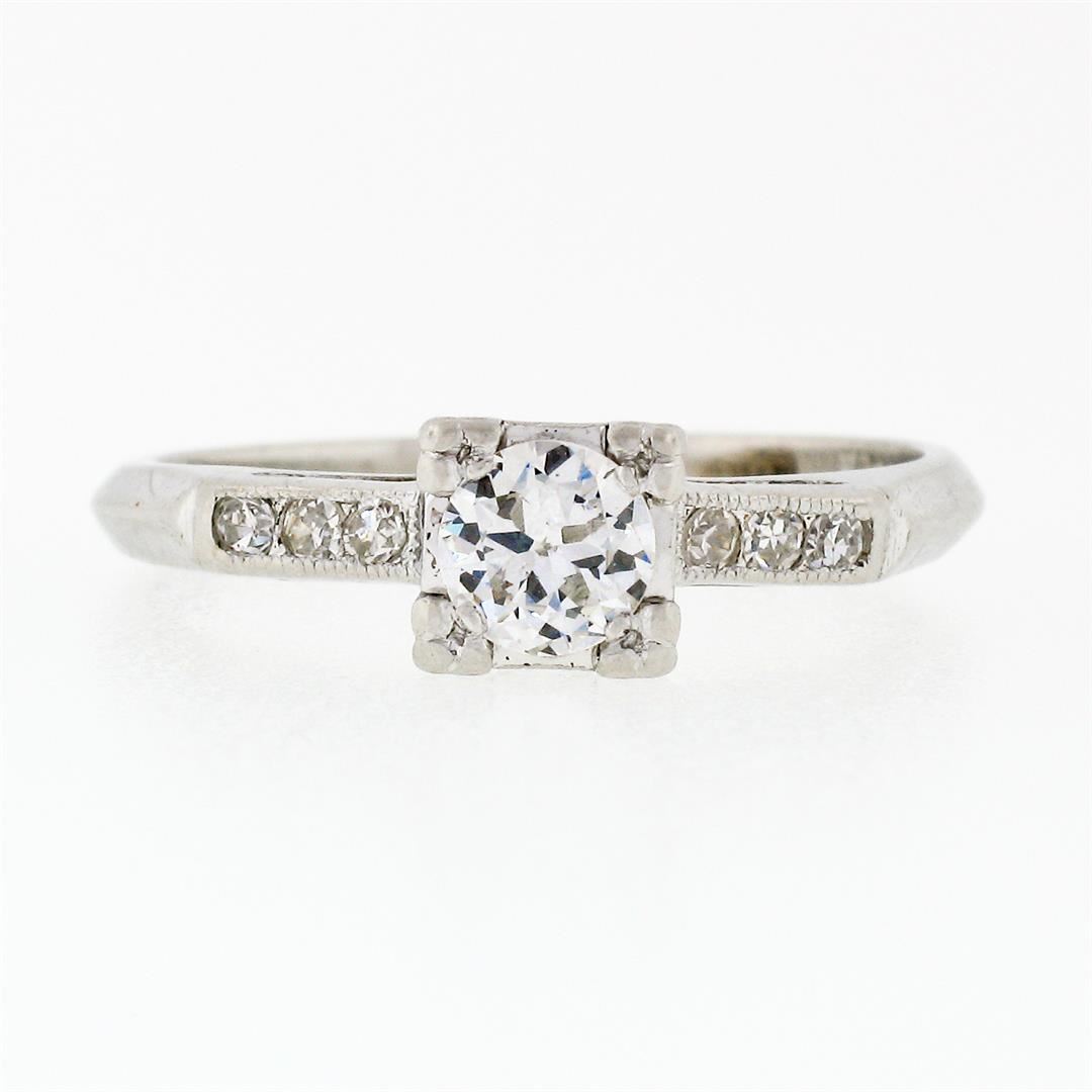 An antique art deco solid platinum engagement ring, with 1 old european cut natural diamond (G - VS2 ; 0.38ct), and 6 round single cut natural diamonds (F - VS1 ; 0.06ctw). The ring is size 6.5, weighs a total of 3.71 grams, and measures 5.4mm wide.