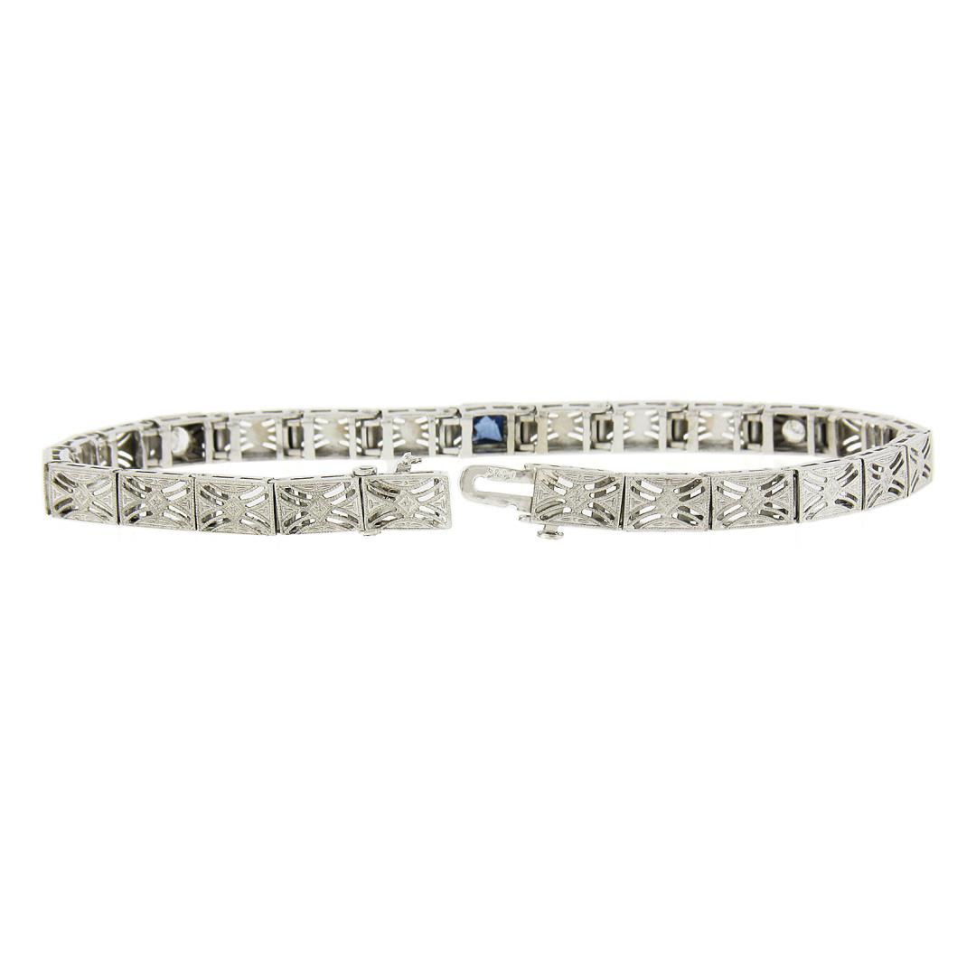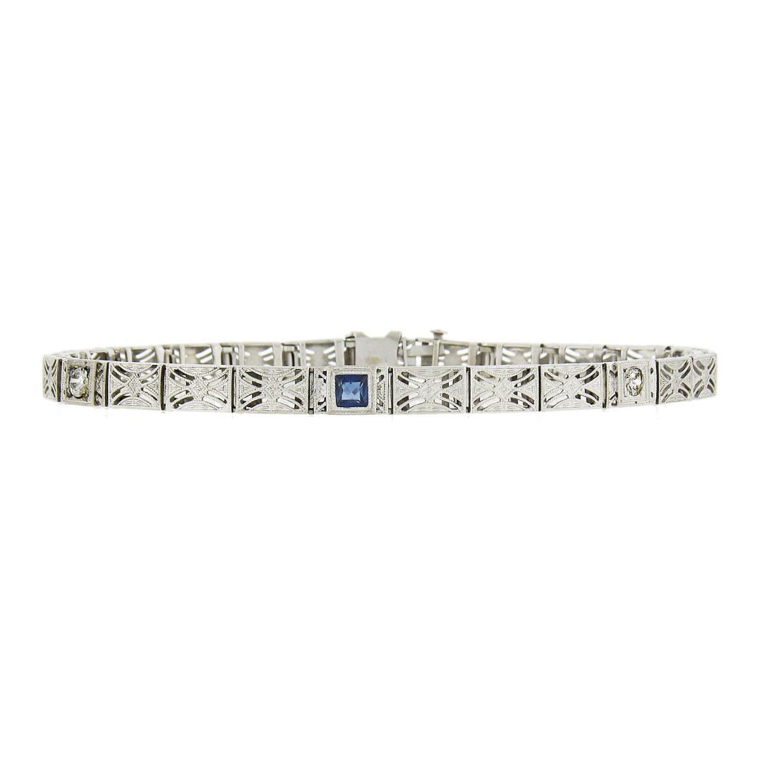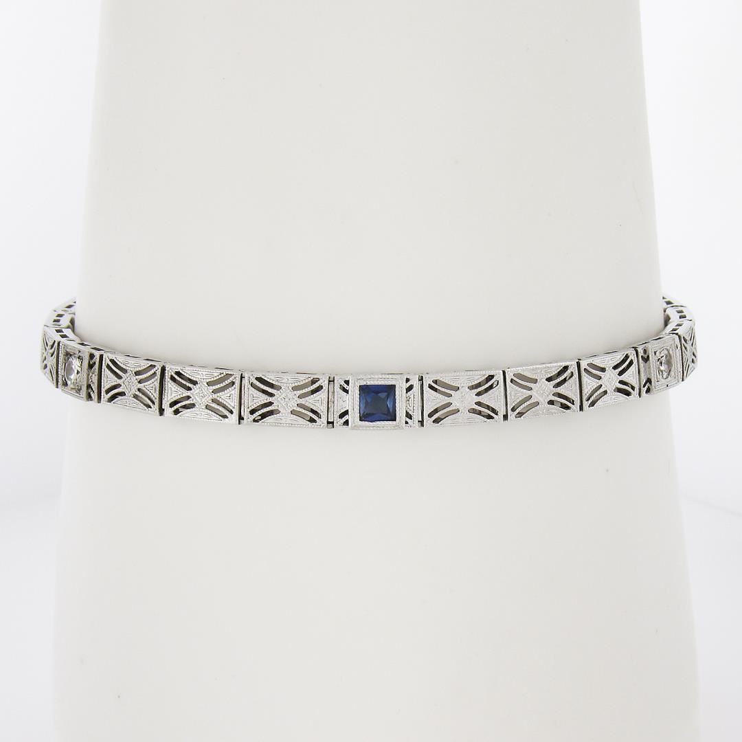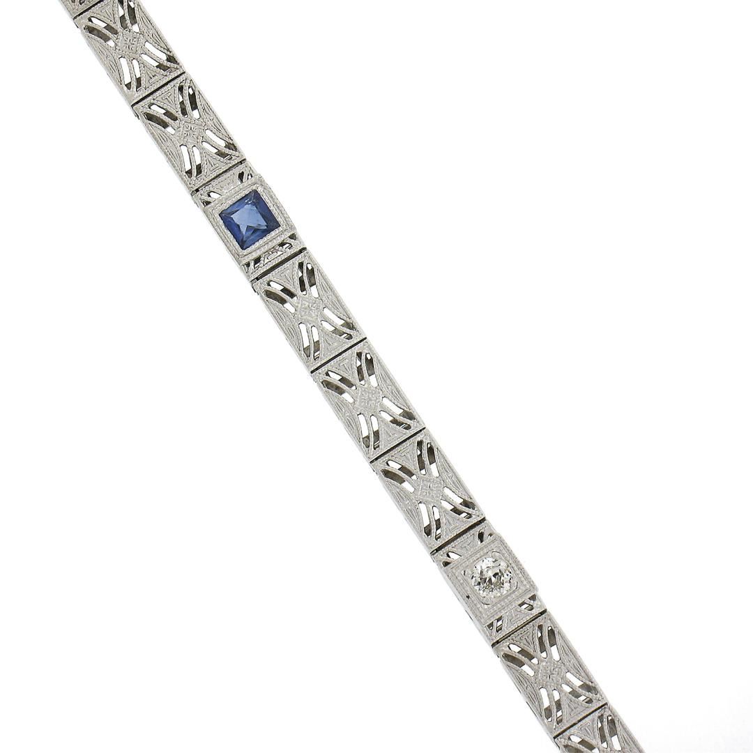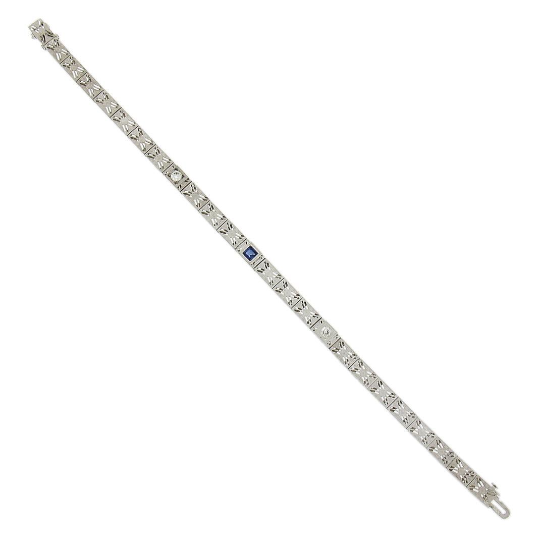 An antique solid platinum & 14 white gold bracelet, with 1 square cut synthetic sapphire, with 2 old european cut natural diamonds (H/I - SI1-SI2 ; 0.18ctw). It weighs a total of 8.49 grams, measures 4.7mm wide, and measures 7.0 inches in length.