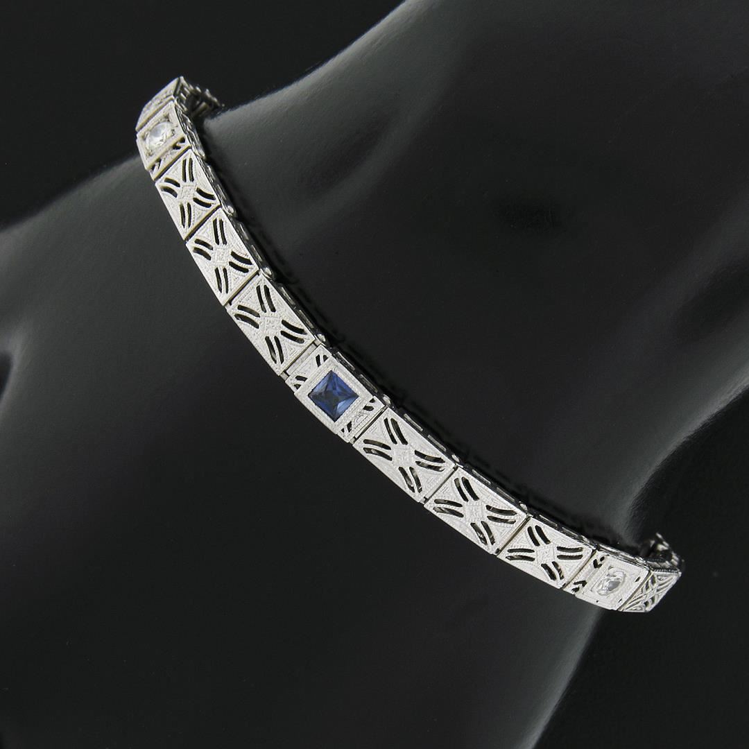 An antique solid platinum & 14 white gold bracelet, with 1 square cut synthetic sapphire, with 2 old european cut natural diamonds (H/I - SI1-SI2 ; 0.18ctw). It weighs a total of 8.49 grams, measures 4.7mm wide, and measures 7.0 inches in length.