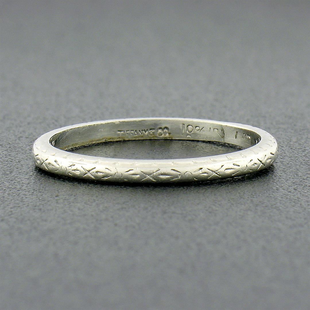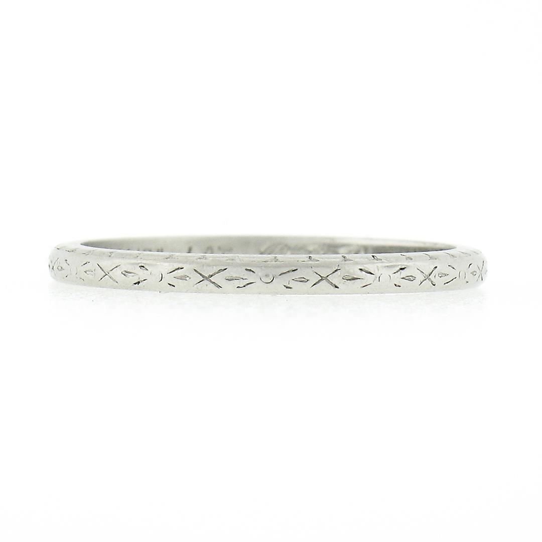 An antique solid platinum engraved eternity band ring by Tiffany & Co. The ring is size 5.0, weighs a total of 2.13 grams, and measures 1.60mm wide