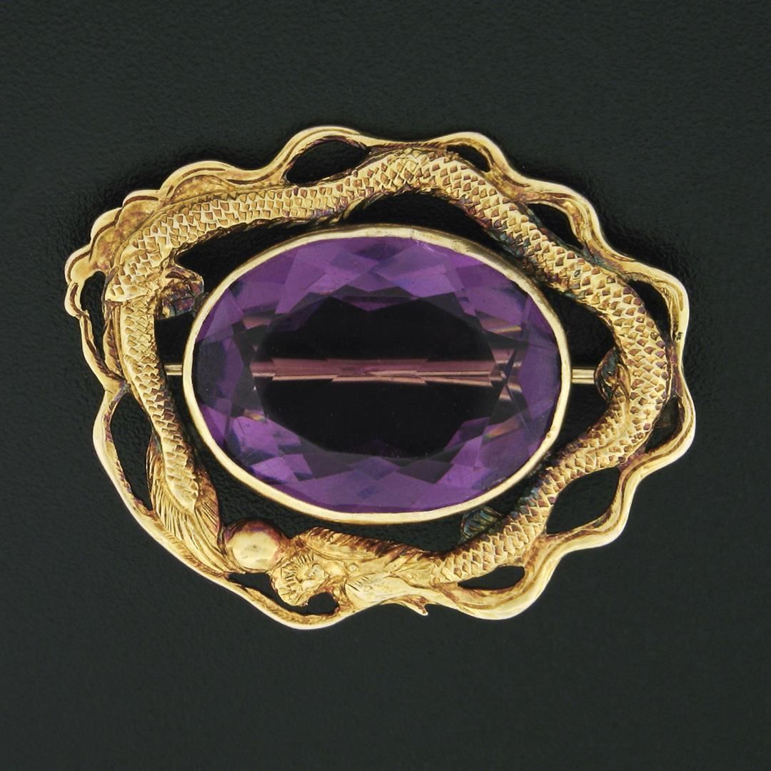 An antique solid 14k yellow gold pin brooch, with 1 oval cut natural amthyst (20.0x15.2mm - 13.13ct). Measures 27.85x35.18mm and weighs a total of 10.95 grams.