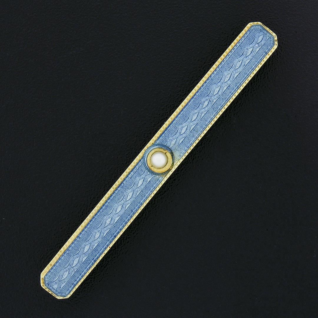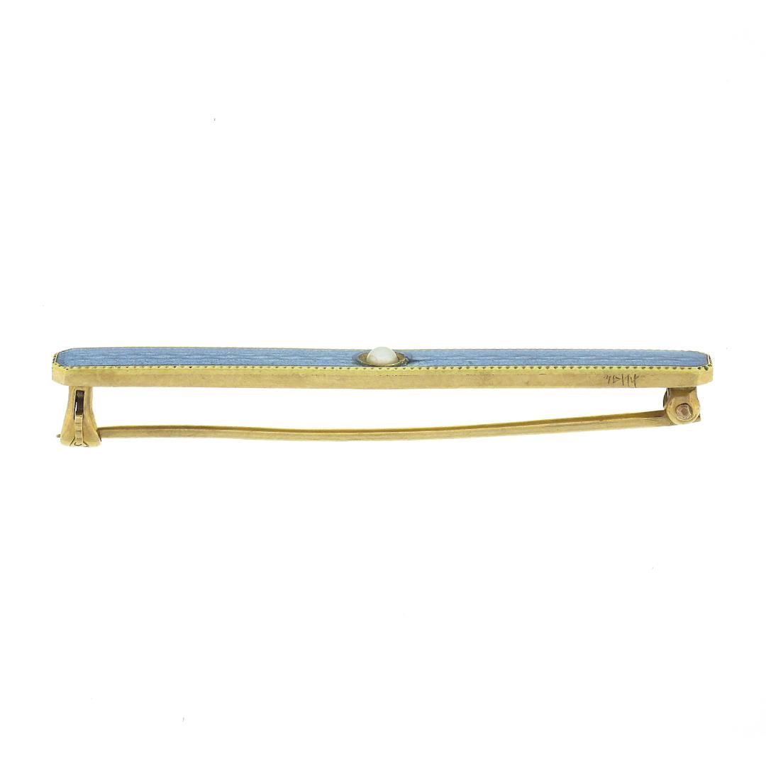 An antique solid 14k yellow gold & enamel work bar brooch, with 1 round shape cultured seed pearl (2.3mm ). Measures 5x45.5mm and weighs a total of 2.85 grams.