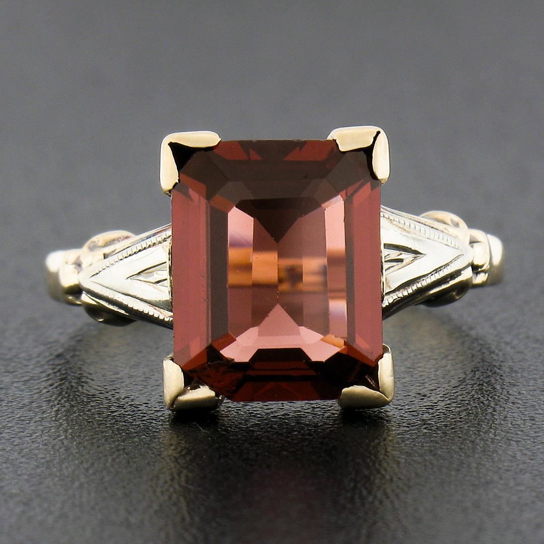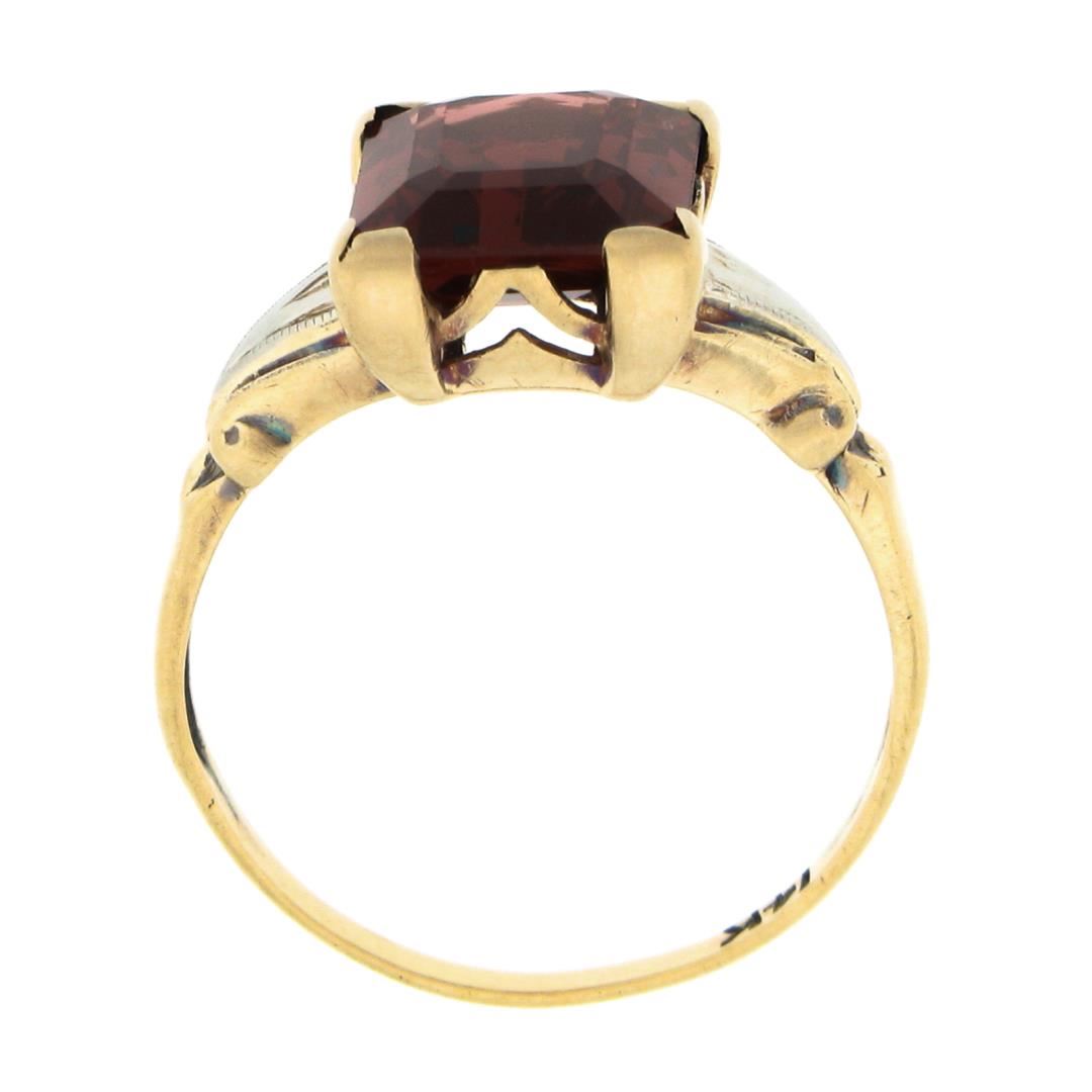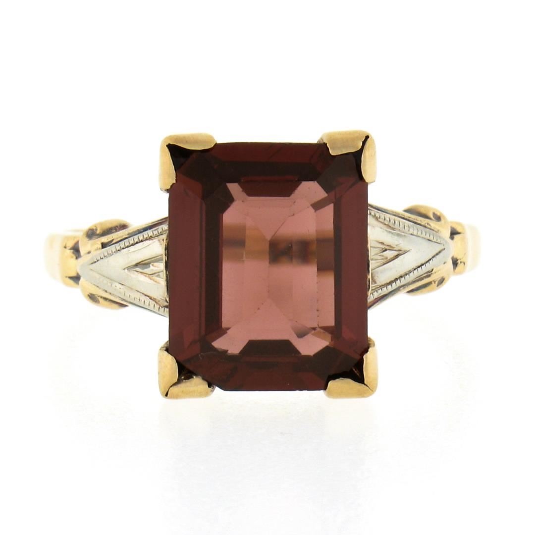 An antique solid 14k yellow & white gold. with emerald cut natural rhodolite garnet (10x8mm, 3ct). The ring is size 6.0, weighs a total of 2.19 grams, and measures 10.7mm wide.