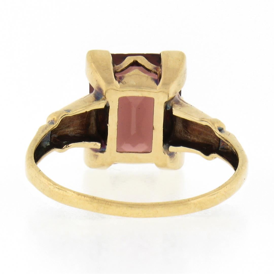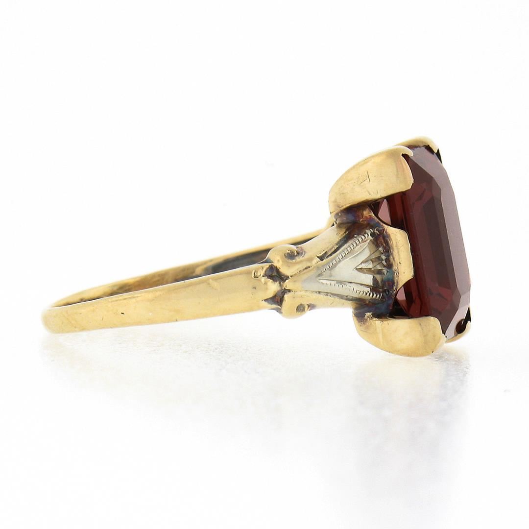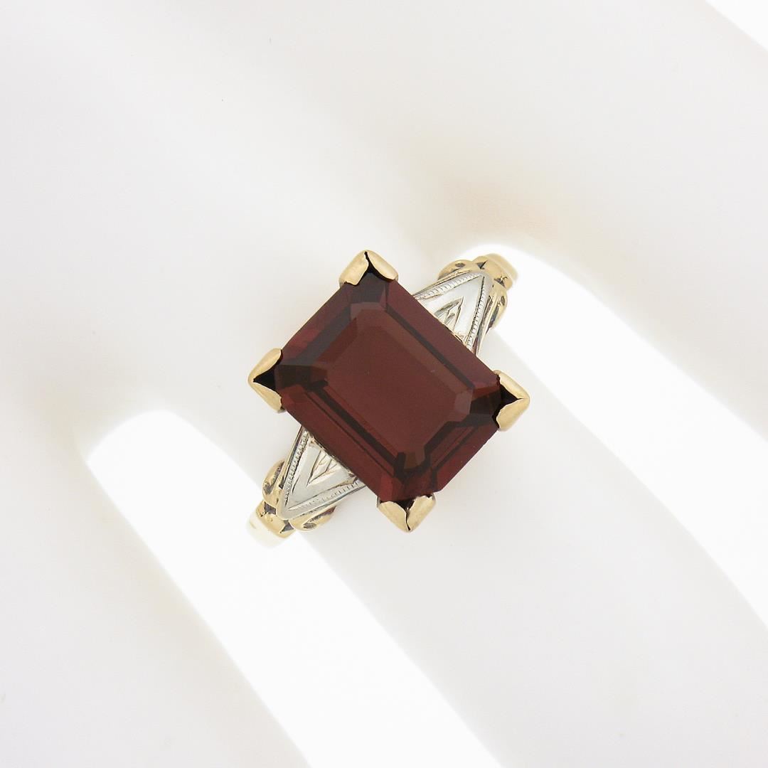 An antique solid 14k yellow & white gold. with emerald cut natural rhodolite garnet (10x8mm, 3ct). The ring is size 6.0, weighs a total of 2.19 grams, and measures 10.7mm wide.