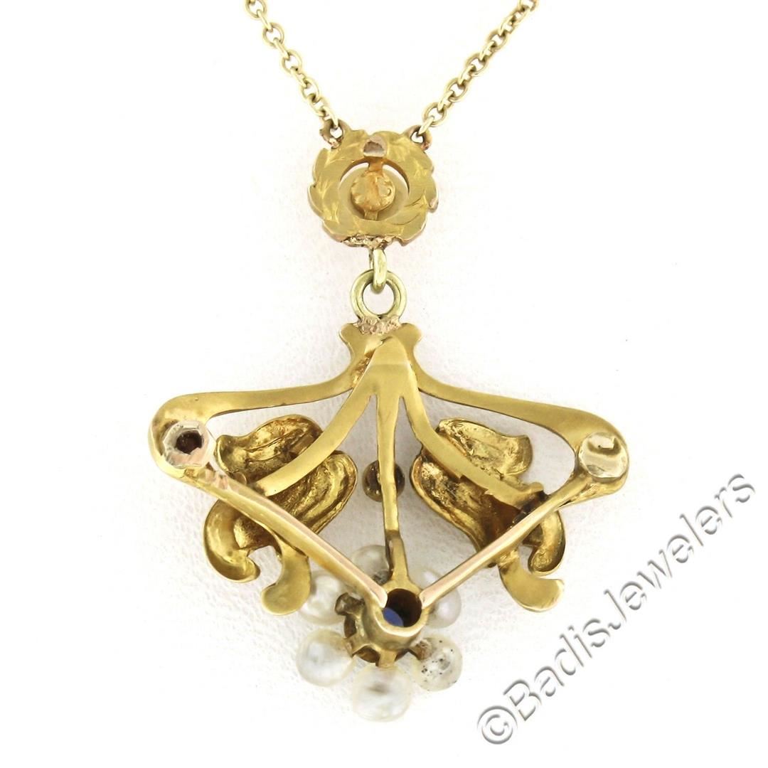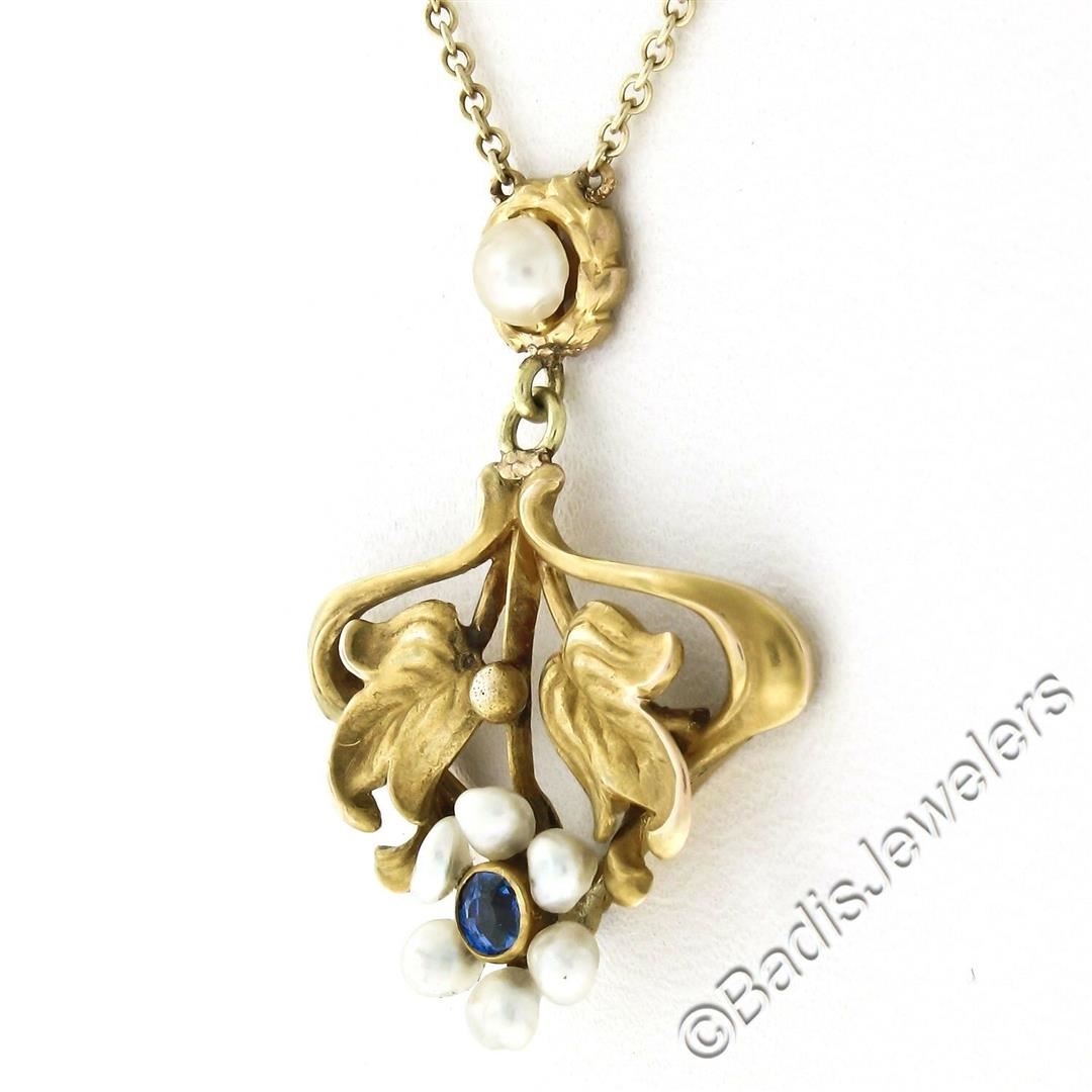 An excellent condition antique 14kt yellow gold daisy pendant necklace bezel set with a 0.12ct old mine cut sapphire surrounded by six natural pearls. 16 inch cable link chain, 3.53 grams total weight, measures 22.7x27.5mm.