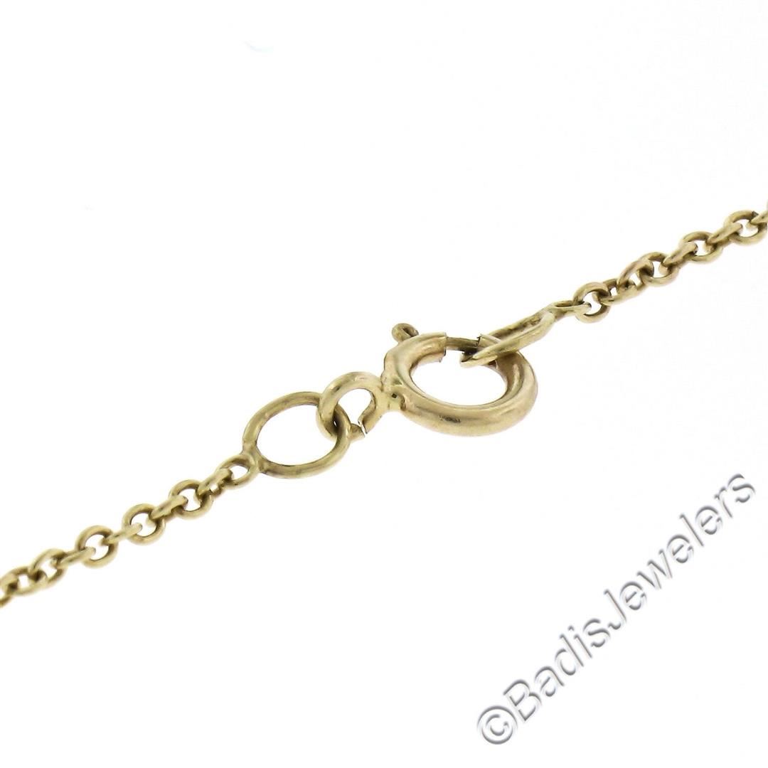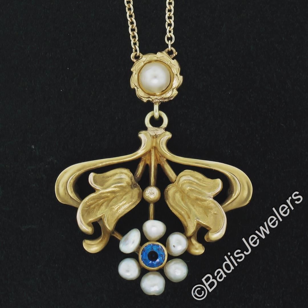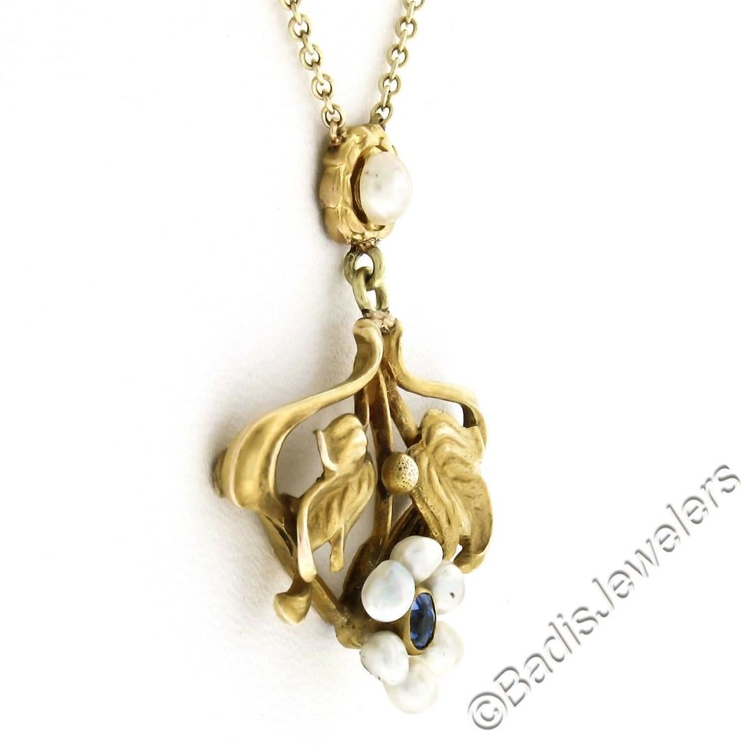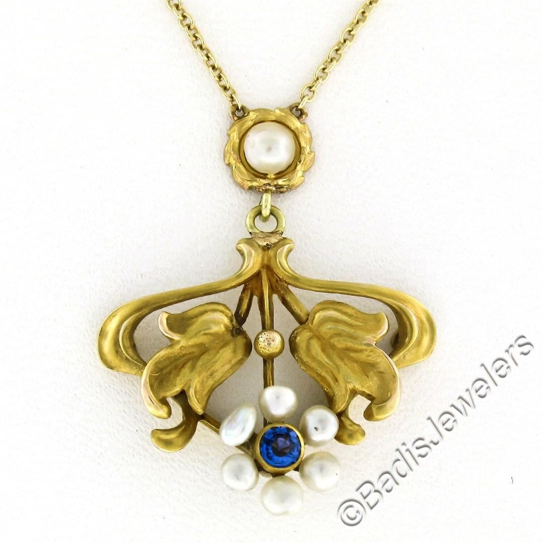 An excellent condition antique 14kt yellow gold daisy pendant necklace bezel set with a 0.12ct old mine cut sapphire surrounded by six natural pearls. 16 inch cable link chain, 3.53 grams total weight, measures 22.7x27.5mm.