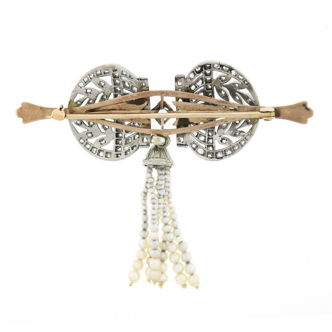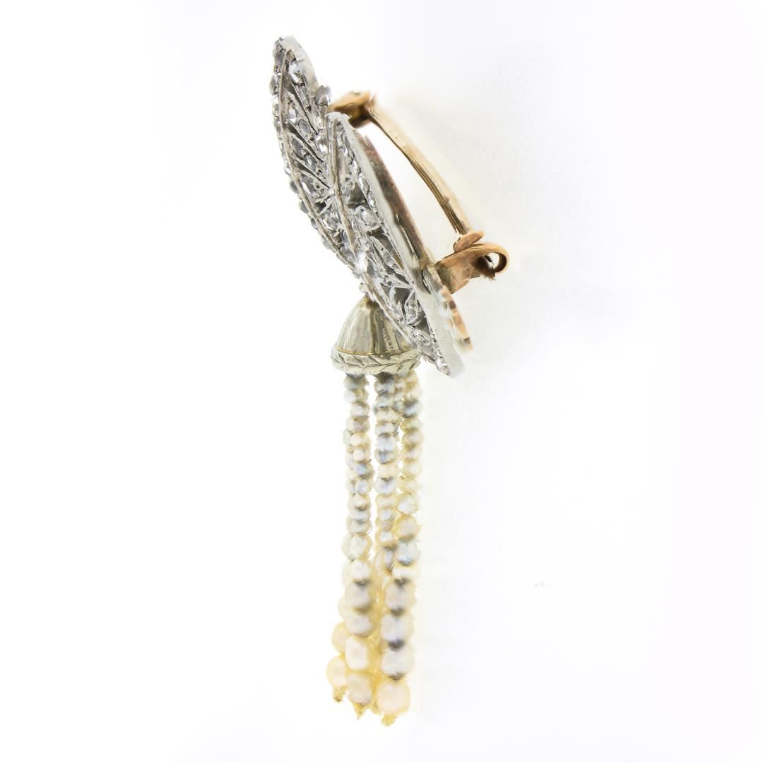 An anitque platinum & 10k yellow gold dangle brooch, with 114 rose cut natural diamonds (H/I - SI2/I2 ; 1.25ctw), and 1 square cut blue stone (4x4mm), with numerous od round and near round shape cultured seed pearls (2.5mm to 1.2mm each). Measures 50.1x56.8mm and weighs a total of 9.90 grams.