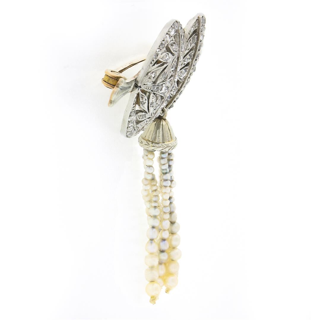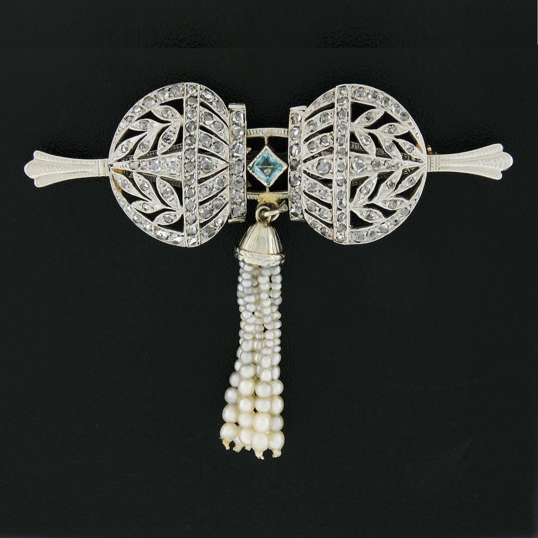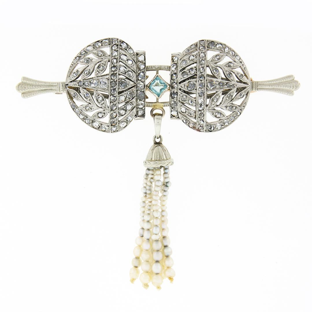 An anitque platinum & 10k yellow gold dangle brooch, with 114 rose cut natural diamonds (H/I - SI2/I2 ; 1.25ctw), and 1 square cut blue stone (4x4mm), with numerous od round and near round shape cultured seed pearls (2.5mm to 1.2mm each). Measures 50.1x56.8mm and weighs a total of 9.90 grams.