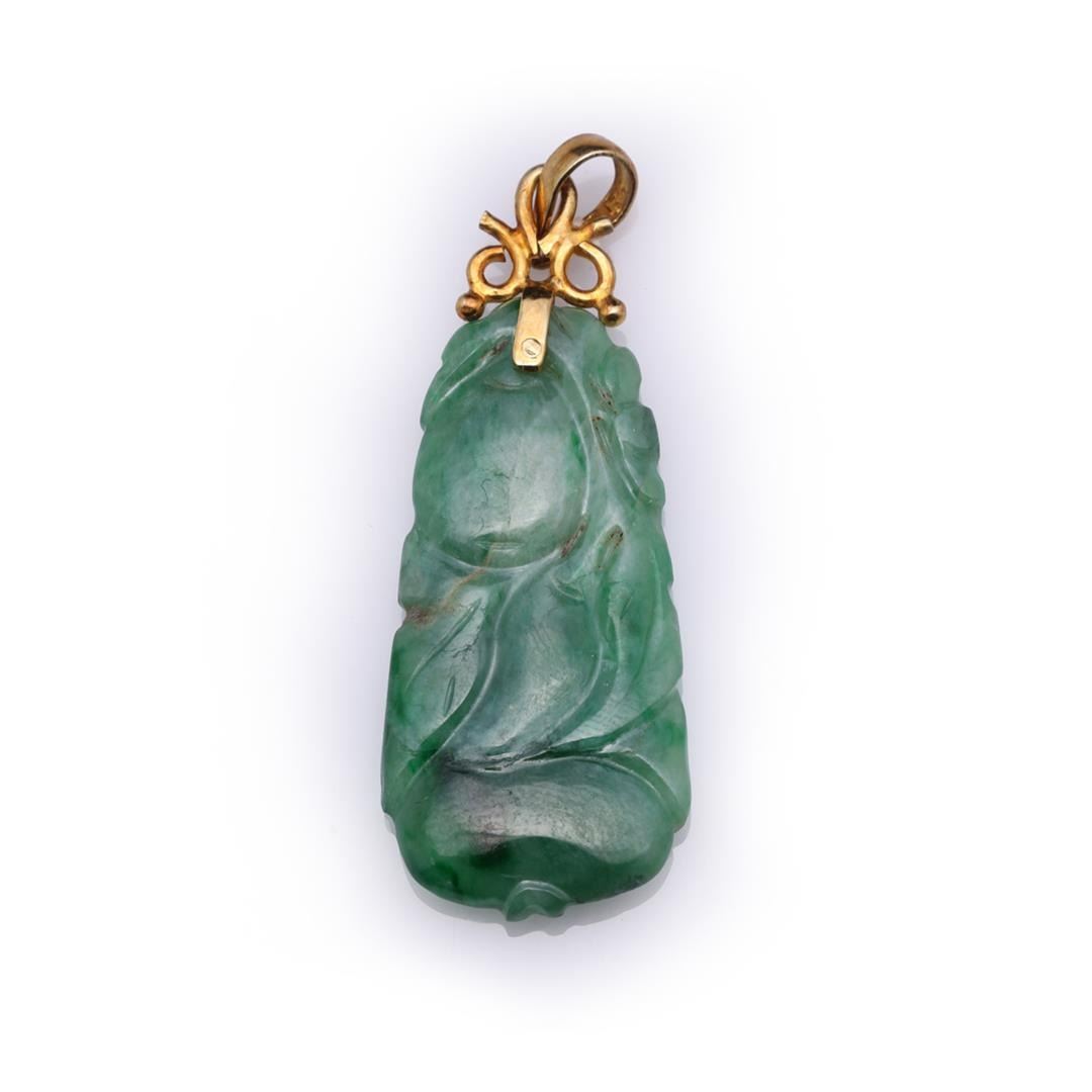 Antique Chinese carved green jadeite pendant later mounted as a pendant in 14k yellow gold, the bail marked 585; gross weight 4.2g, L 1 3/4 inches (approx.)