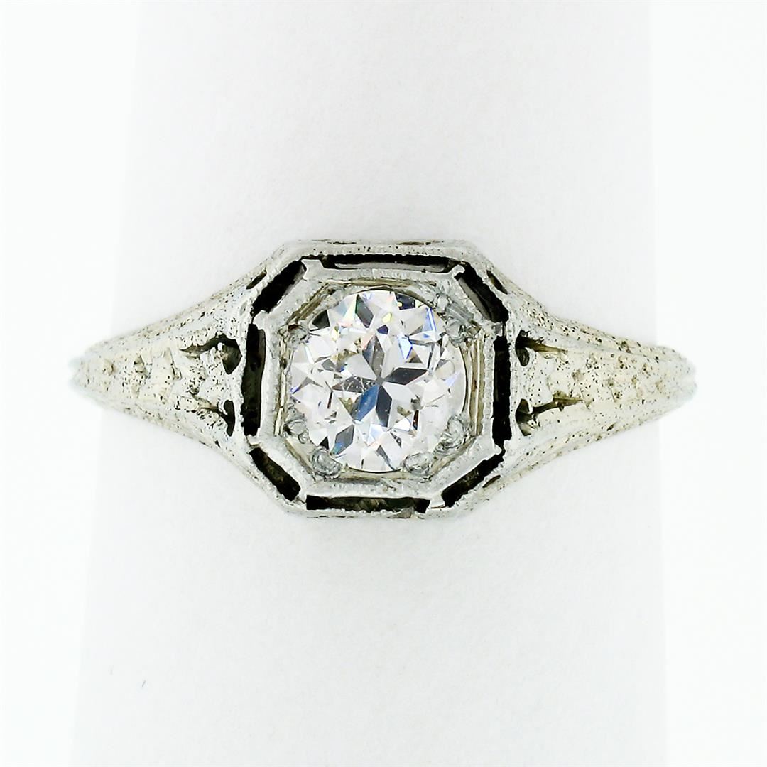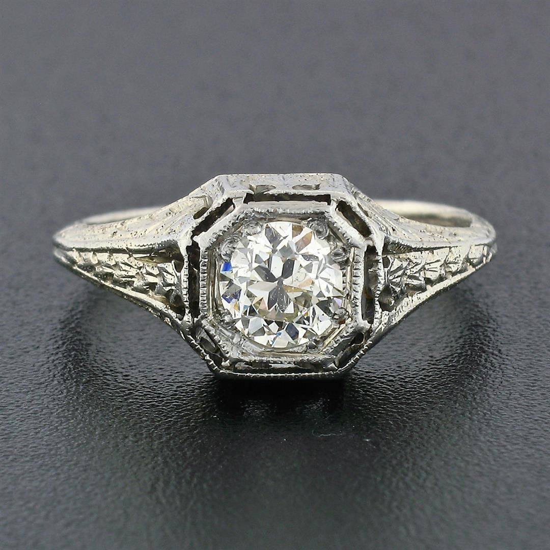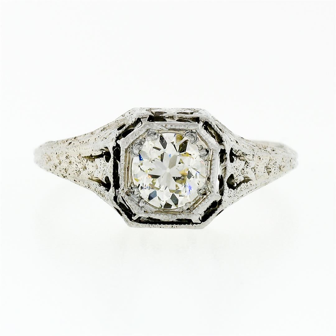 An art deco period solid 18k white gold engagement ring by Belais with an old European cut natural diamond (H - VS2; 0.50ct). The ring is size 6.0, weighs a total of 2.45 grams, and measures 8mm wide.