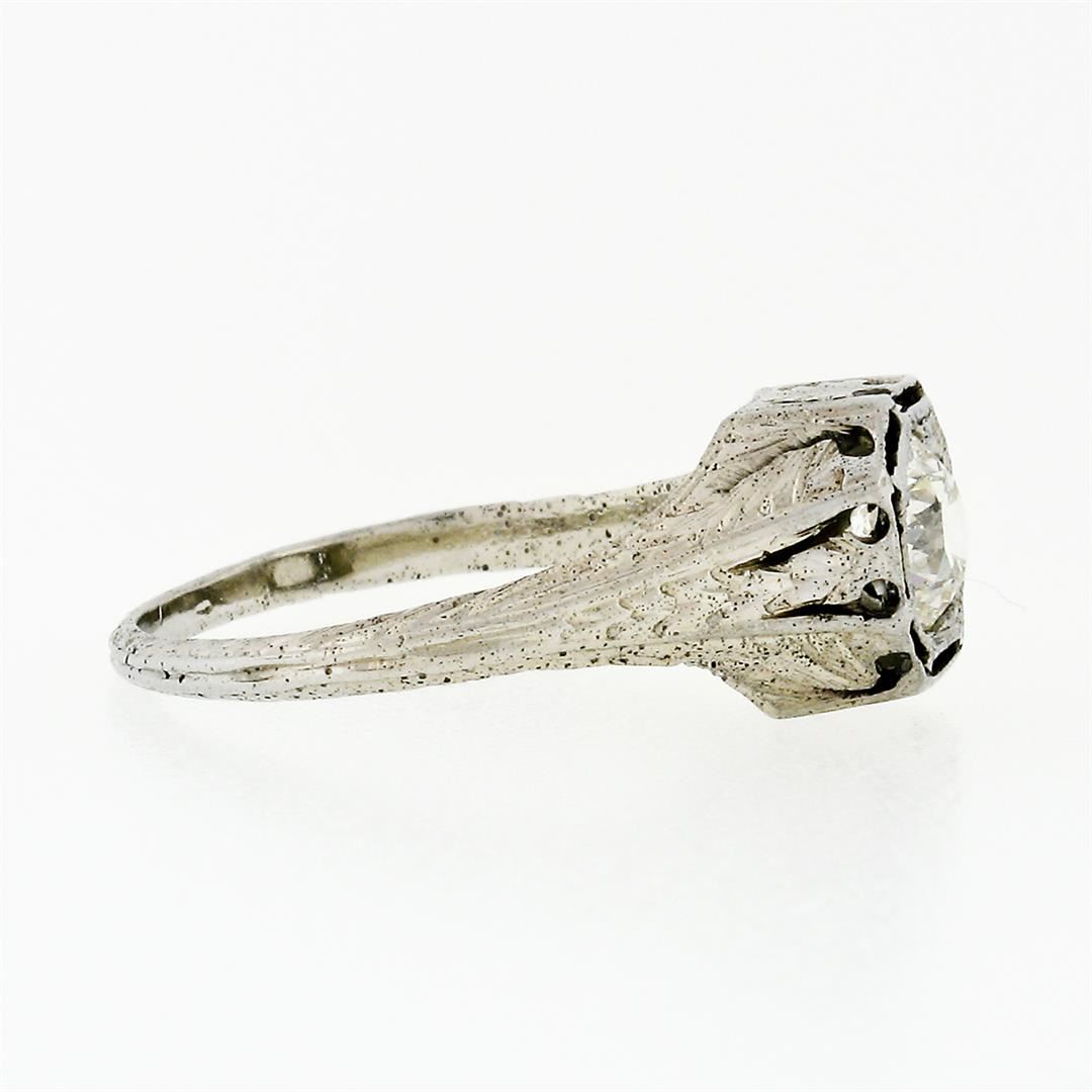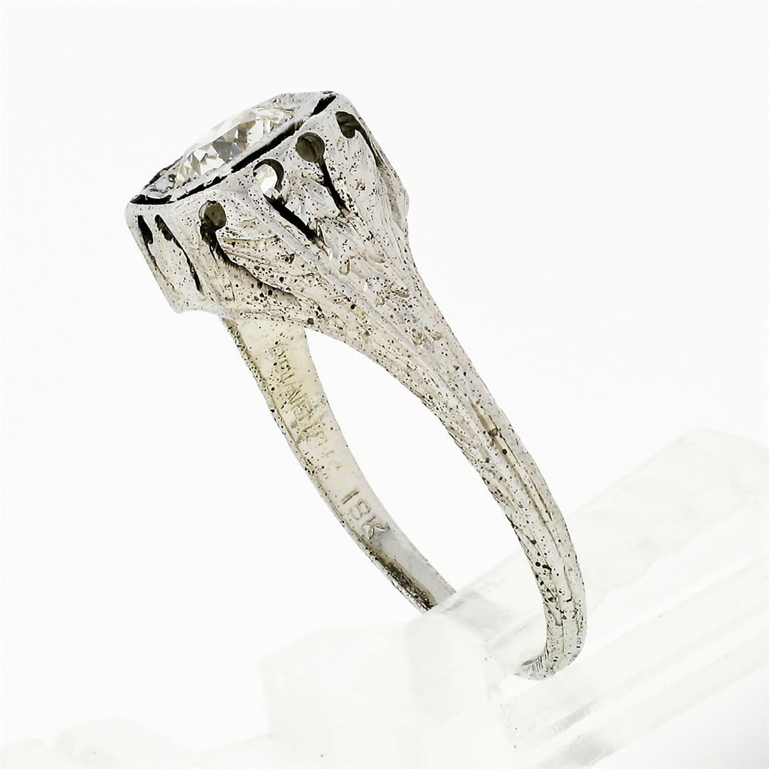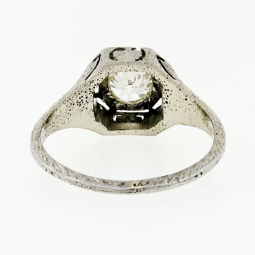 An art deco period solid 18k white gold engagement ring by Belais with an old European cut natural diamond (H - VS2; 0.50ct). The ring is size 6.0, weighs a total of 2.45 grams, and measures 8mm wide.