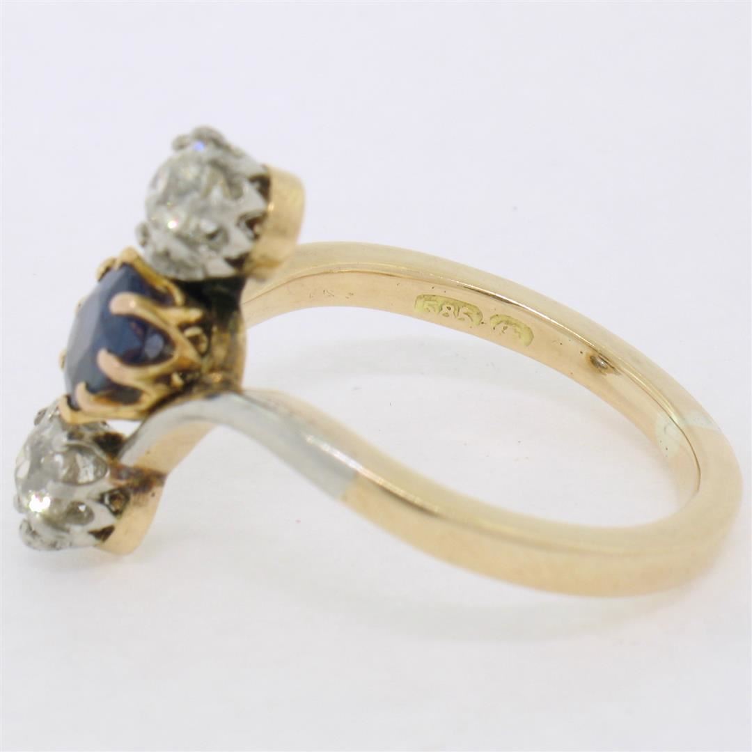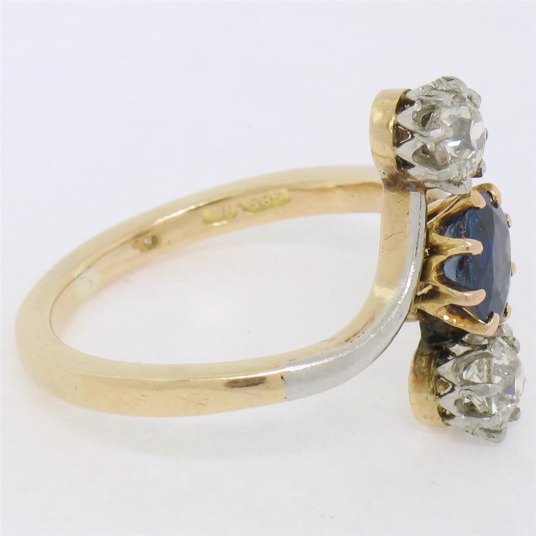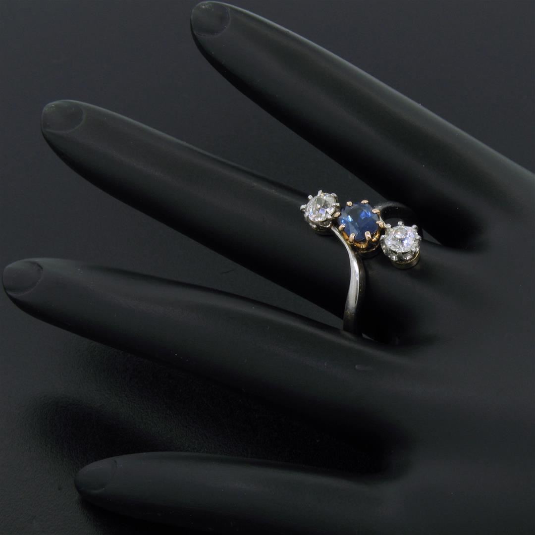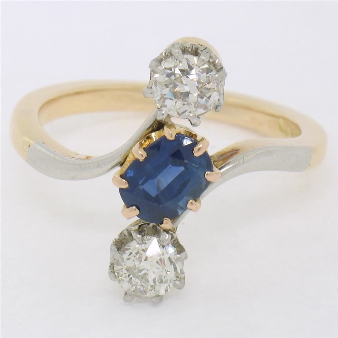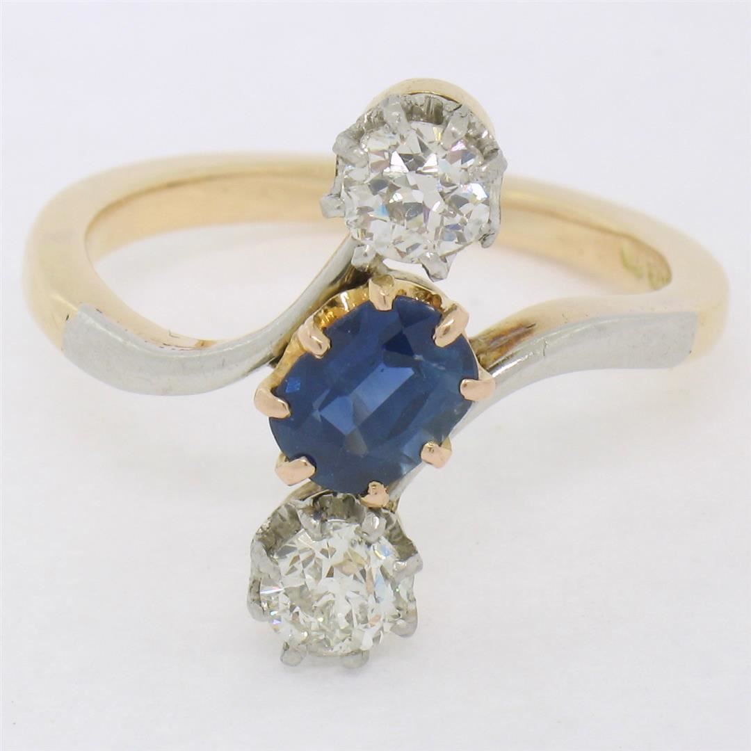 An antique solid 14k rose gold and platinum bypass ring, featuring 2 old mine cut natural diamonds (G/H- VS1/VS2; 0.76ct), and 1 old oval cut natural sapphire (6.5x4.5mm - 0.85ct). The ring is size 7.5, weighs a total of 5.15 grams.
