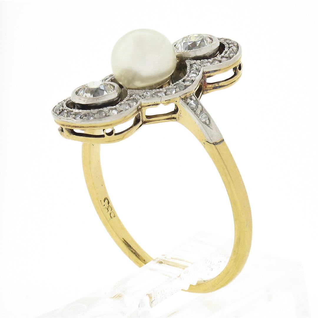 An antique solid 14k yellow gold & platinum dinner ring, with 1 round shape natural or cultured pearl (5.9mm), 2 old European cut & 50 old rose cut natural diamonds (H/I Color - SI1-I1 ; 0.82ctw). The ring is size 8.0, weighs a total of 3.50 grams, and measures 20.55mm wide.